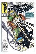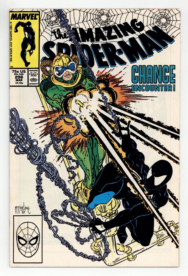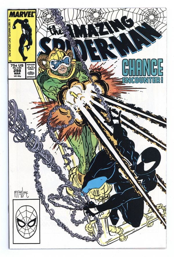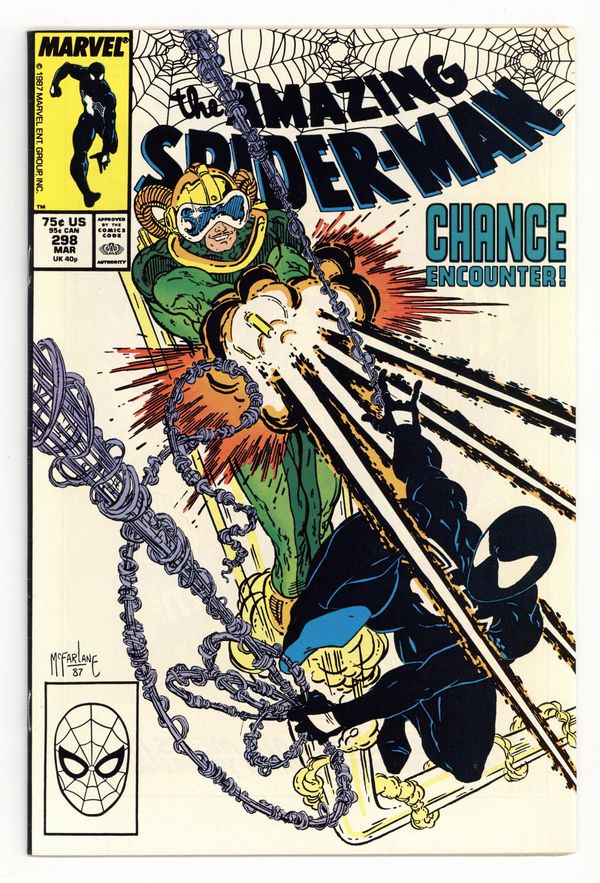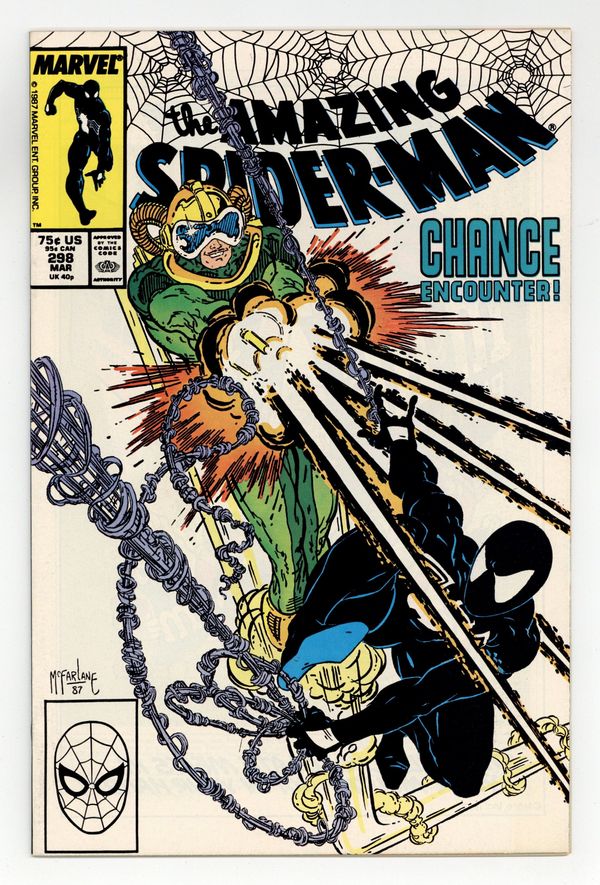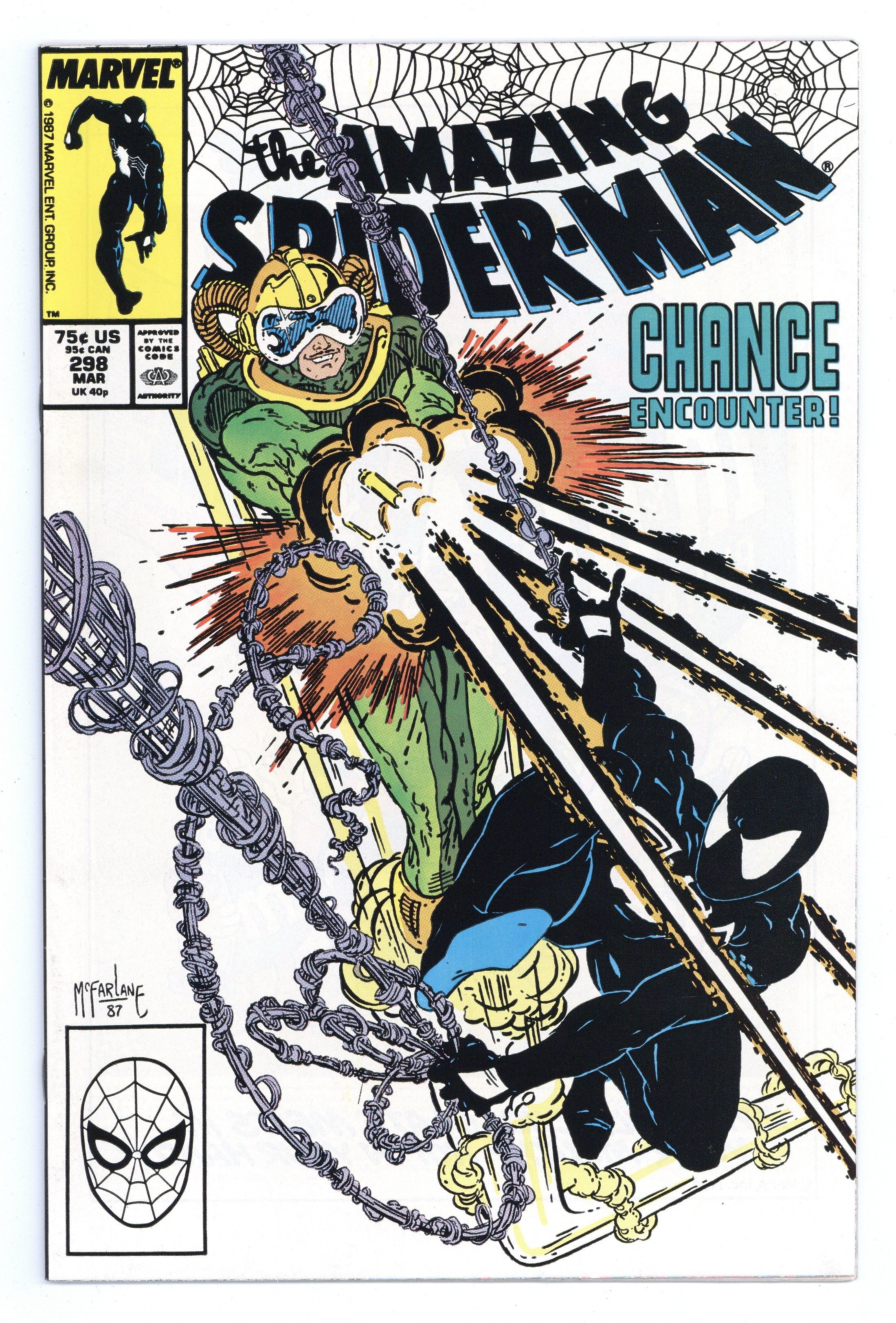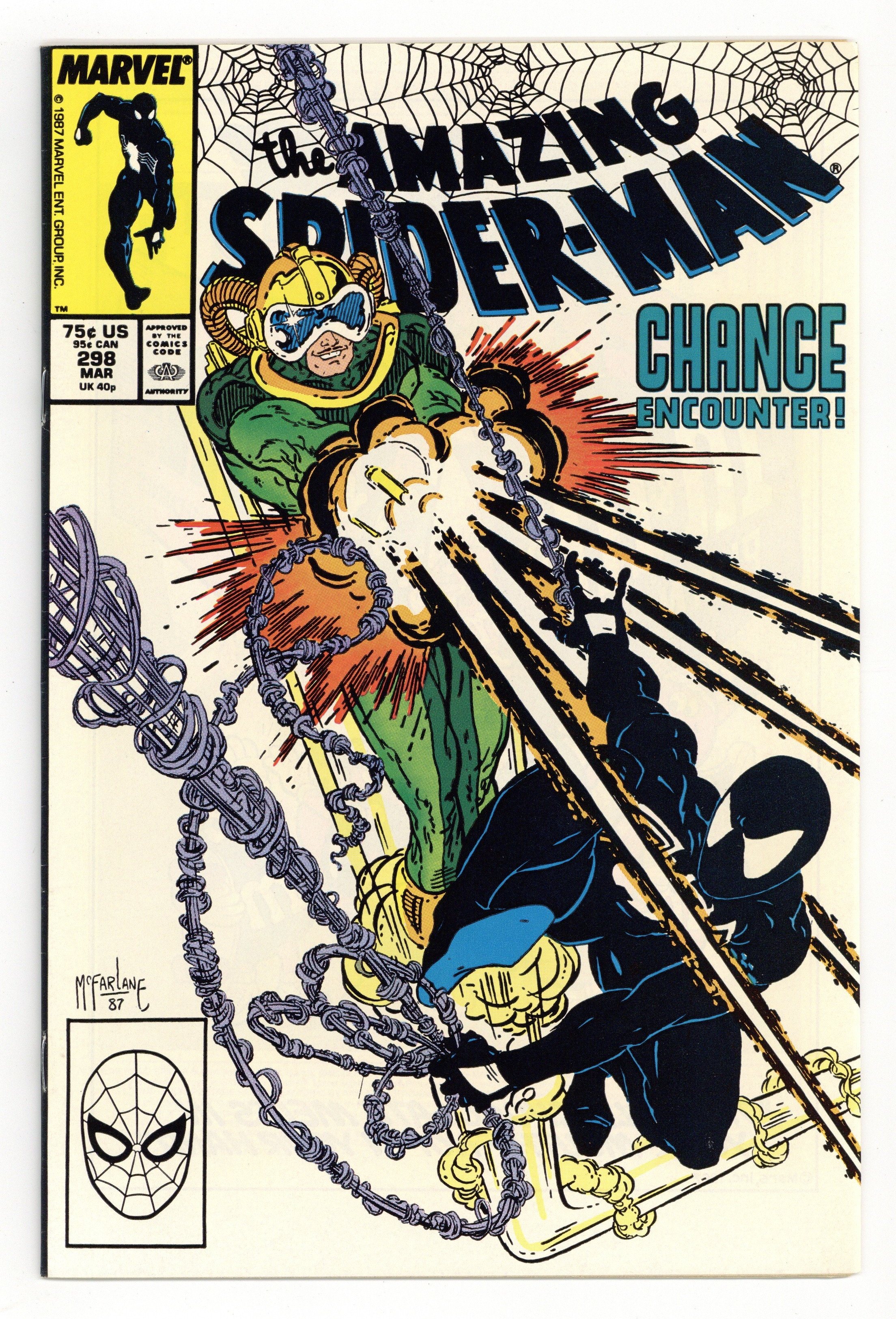 Tags: Marvel Legacy Numbering: Amazing Spider-Man (part 298), Spider-Man$83.00Direct Edition. "Chance Encounter!" Part 1 of 2. Script by David Michelinie. Pencils by Todd McFarlane. Inks by Bob McLeod. Cover by Todd McFarlane. Chance is back in business and working a new job for the Life Foundation! The clandestine organization wants Chance to steal an arms shipment coming into the west side docks! That should be a piece of cake for the high-flying mercenary! However, the Daily Bugle dispatches an undercover photographer to observe the delivery! And beneath the moonlit sky, fireworks explode when Chance and the Amazing Spider-Man throw down on the docks! First appearance (and cameo on the last page) by Eddie Brock (aka Venom). First appearance of Carlton Drake of the Life Foundation. Cameo appearances by Mary Jane Watson, Joy Mercado, and Joe Robertson. (Notes: Chance previously appeared in Web of Spider-Man 15. This issue begins Todd McFarlane's 2-year run as the penciler of the Amazing Spider-Man series.) 36 pages. Cover price $0.75.