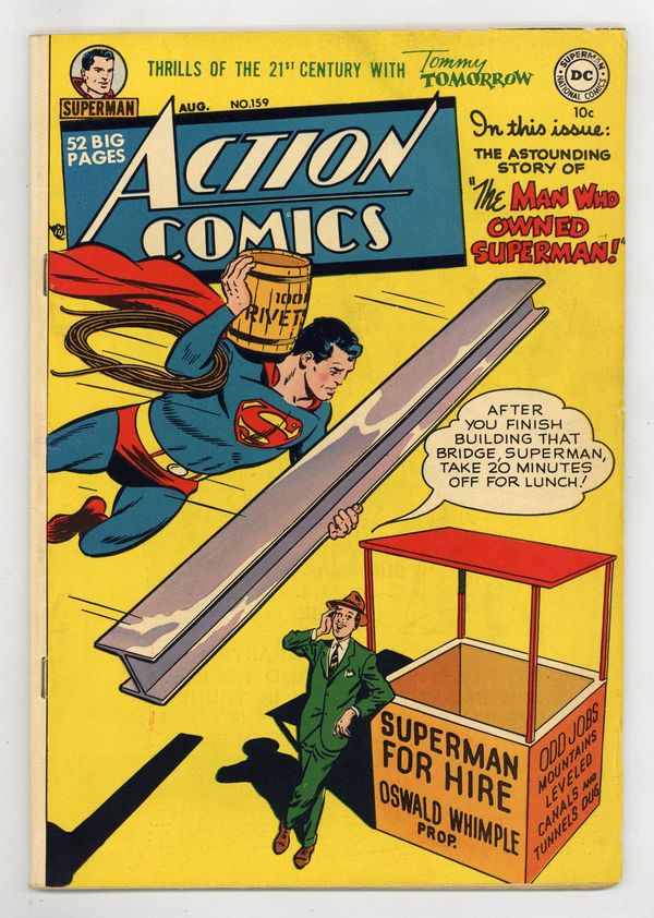 Cover art by Win Mortimer. The Man Who Owned Superman, pencils by Wayne Boring, inks by Stan Kaye. Showdown in Suez! starring Congo Bill, art by Ed Smalle. The Planeteer from the Past! starring Tommy Tomorrow, pencils by Curt Swan, inks by John Fischetti. The Trigger Trail of 'Wild' Eddie Meeks! starring Vigilante, art by Bob Brown. Sweet Land of Liberty public service announcement starring Peter Porkchops, script by Jack Schiff, art by Otto Feuer. 52 Pages, Full Color. $.10 Cover price $0.10.