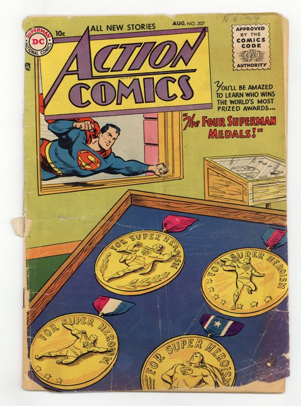 Cover by Win Mortimer. "The Four Superman Medals," pencils by Wayne Boring, inks by Stan Kaye; Superman must find a way of attending the annual policeman's dinner, during which a Superman Medal will be presented, both as himself and as Clark Kent. One-page Varsity Vic story by Henry Boltinoff. "Mystery of the Space Mutiny" starring Tommy Tomorrow, script by Otto Binder, art by Jim Mooney. "Janu, the Human Chimp" starring Congo Bill, art by Ed Smalle. 36 Pages, Full Color. $.10 Cover price $0.10.