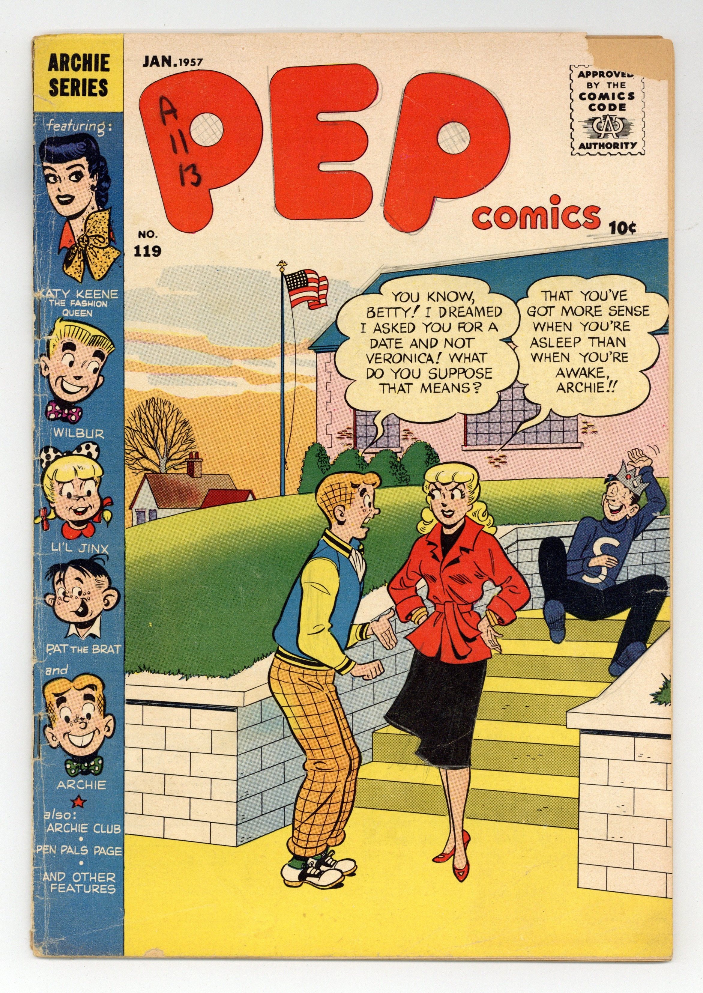 "Arch for Art's Sake," pencils by George Frese, inks by Terry Szenics; Archie gives Veronica a portrait of himself on her birthday. "Lucky Heel"; At the sock hop the girls put their names in numbered socks and place them in a boot; Each boy then draws a sock and that girl is his date for the dance. "Winter Wedding," art by Bill Woggon; Randy asks Katy if she'll marry him and they could have a winter wedding; They starts to imagine what the ceremony would be like before Katy goes to bed. "A Winter Wonderland"; Wilbur dates Linda every night for two weeks; Linda finds out Laurie's been out of town skiing; Thinking that's why she's been getting Wilbur's attention, Linda waits to see if he will keep their date for the following day. Archie Club News. "Fingerprints," script and art by Joe Edwards; Li'l Jinx puts so many fingerprints on the walls of her house, to keep up, her daddy finally gets wallpaper that is decorated with fingerprints. 36 pgs., full color. Cover price $0.10.