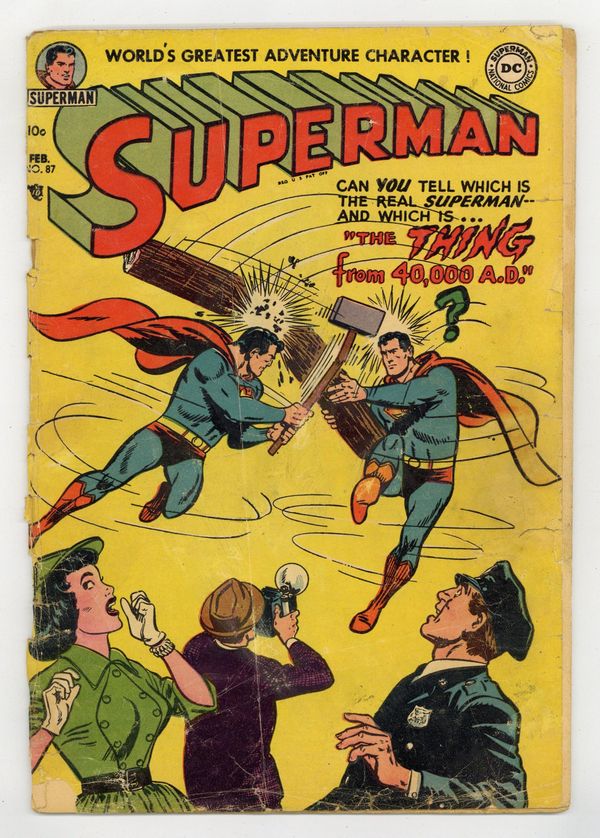 Cover inks by Stan Kaye. The Thing From 40,000 A.D. starring Superman and The Thing, script by Bill Finger, pencils by Wayne Boring, inks by Stan Kaye; Superman battles a Superman lookalike. Superman's Super-Boners starring Superman, Cyrus Walters, and Prof. Vandyke, script by Jerry Coleman, art by Al Plastino. The Spear Hunters text story by John Mapes. The Prankster's Greatest Role starring Superman and The Prankster, script by Bill Woolfolk, art by Al Plastino. 44 Pages, Full Color. Cover price $0.10.