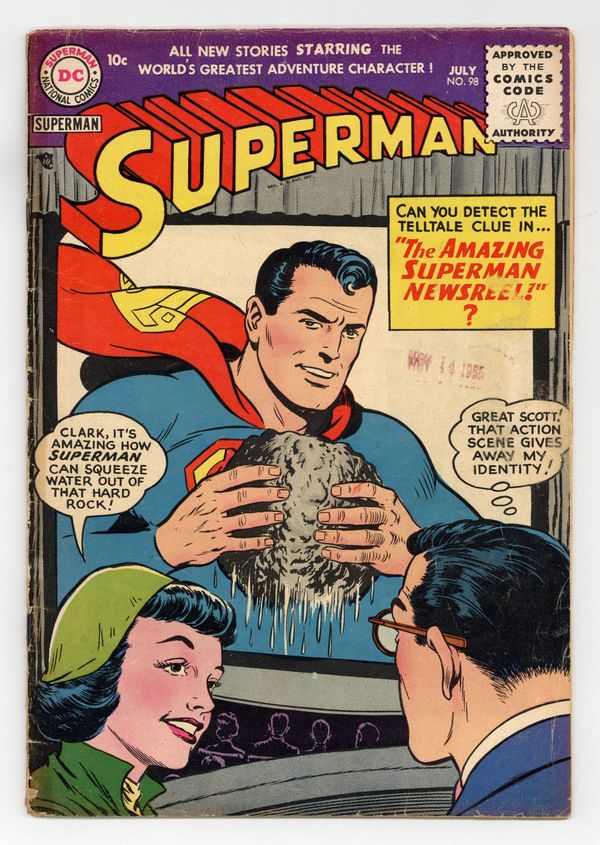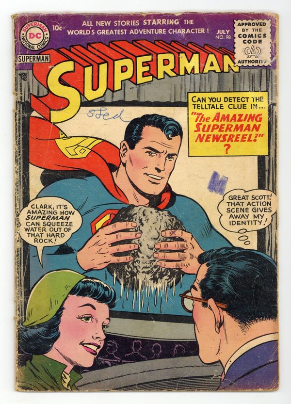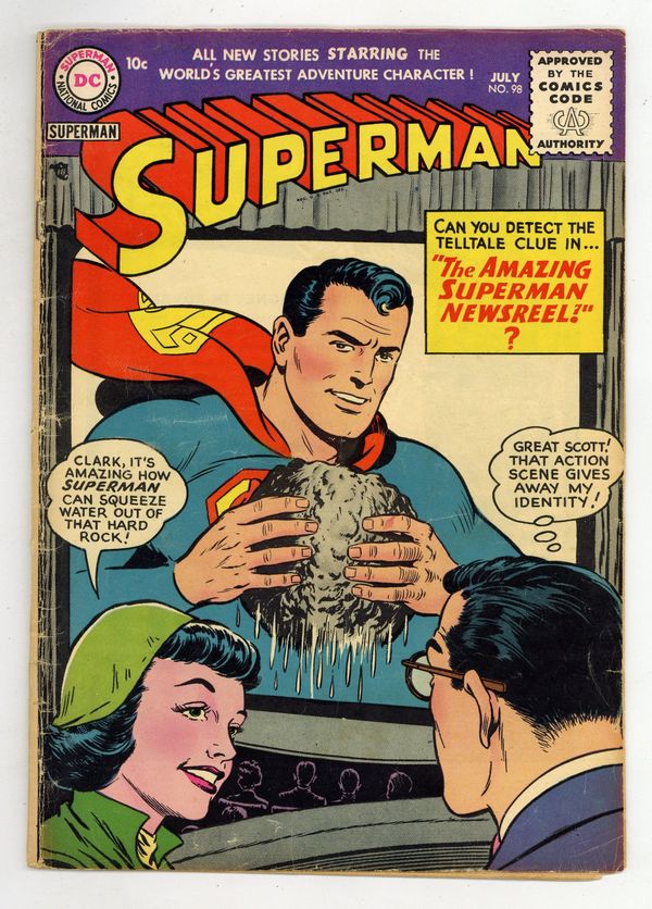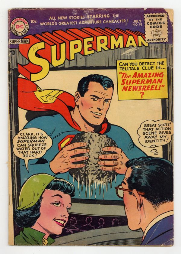 Cover art by Al Plastino. Superman's Secret Life starring Superman, Rags Stephens, and Harry Chadwick, script by France Herron, art by Al Plastino. Clark Kent, Outlaw, script by Bill Finger, pencils by Wayne Boring, inks by Stan Kaye; Superman battles The Big Guy. Club For Adventurers text story by Joe Mallon. The Amazing Superman Newsreel, art by Al Plastino. 36 Pages, Full Color. Cover price $0.10.