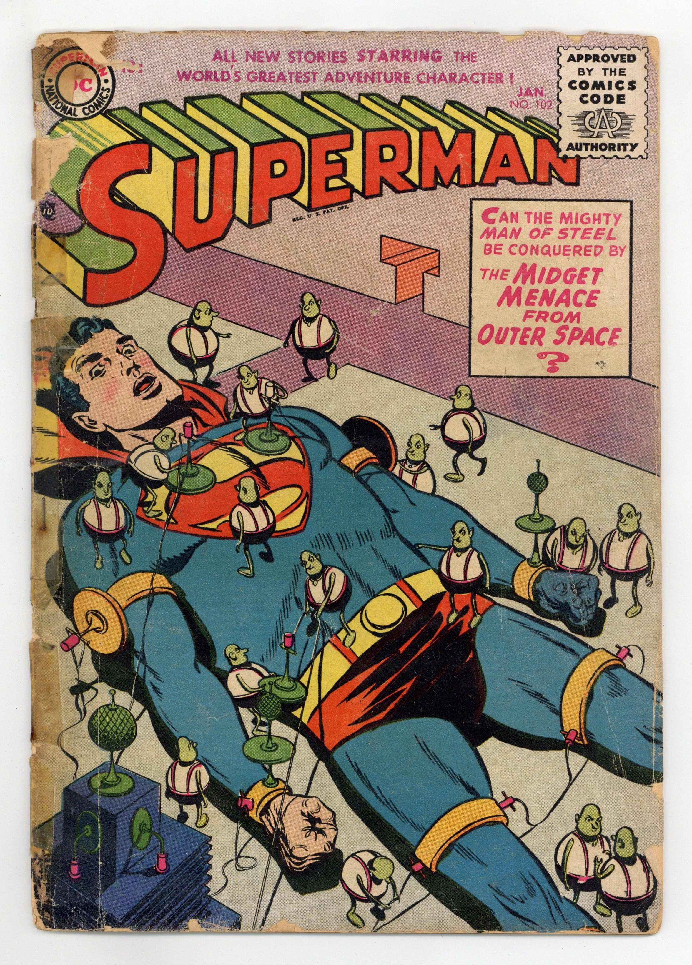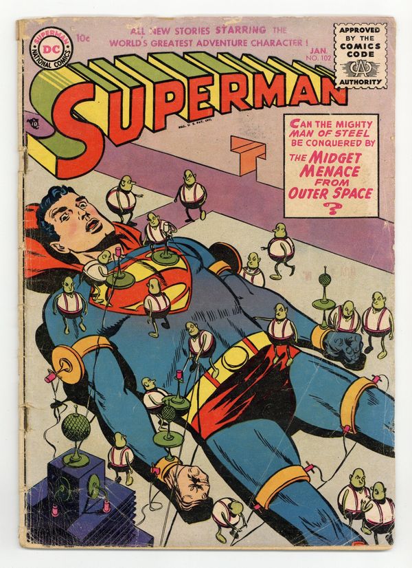 Cover pencils by Wayne Boring, inks by Stan Kaye. Superman For Sale starring Superman, Henry Drebbin, Edward Jorgens, and Paul Quillan, script by Bill Finger, pencils by Wayne Boring, inks by Stan Kaye. The Midget Menace starring Superman and The Thurans, script by Edmond Hamilton, pencils by Wayne Boring, inks by Stan Kaye; Superman is tied down like Gulliver. The Best Present Of All! public service announcement starring Binky, script by Jack Schiff, art by Win Mortimer. Rocket To The Sky text story. The Million Dollar Mistake starring Superman and Soapy Martin, art by Al Plastino. CinemaAntics humor half-page by Harry Lampert. A two-page ad features Superman products available for Christmas. Fearless Fosdick stars in a quarter-page ad for Wildroot Cream-Oil with art by Al Capp. 36 Pages, Full Color. Cover price $0.10.