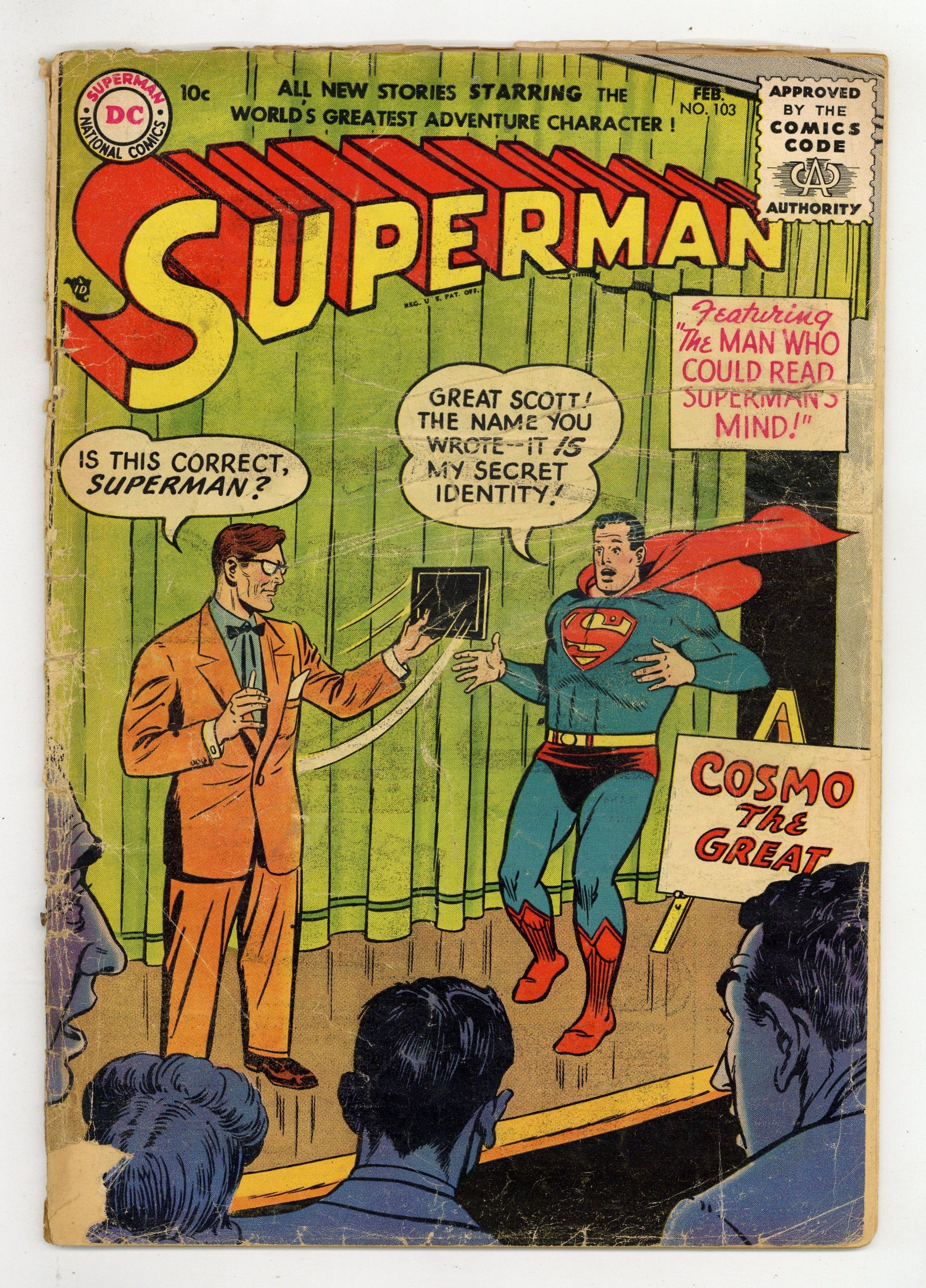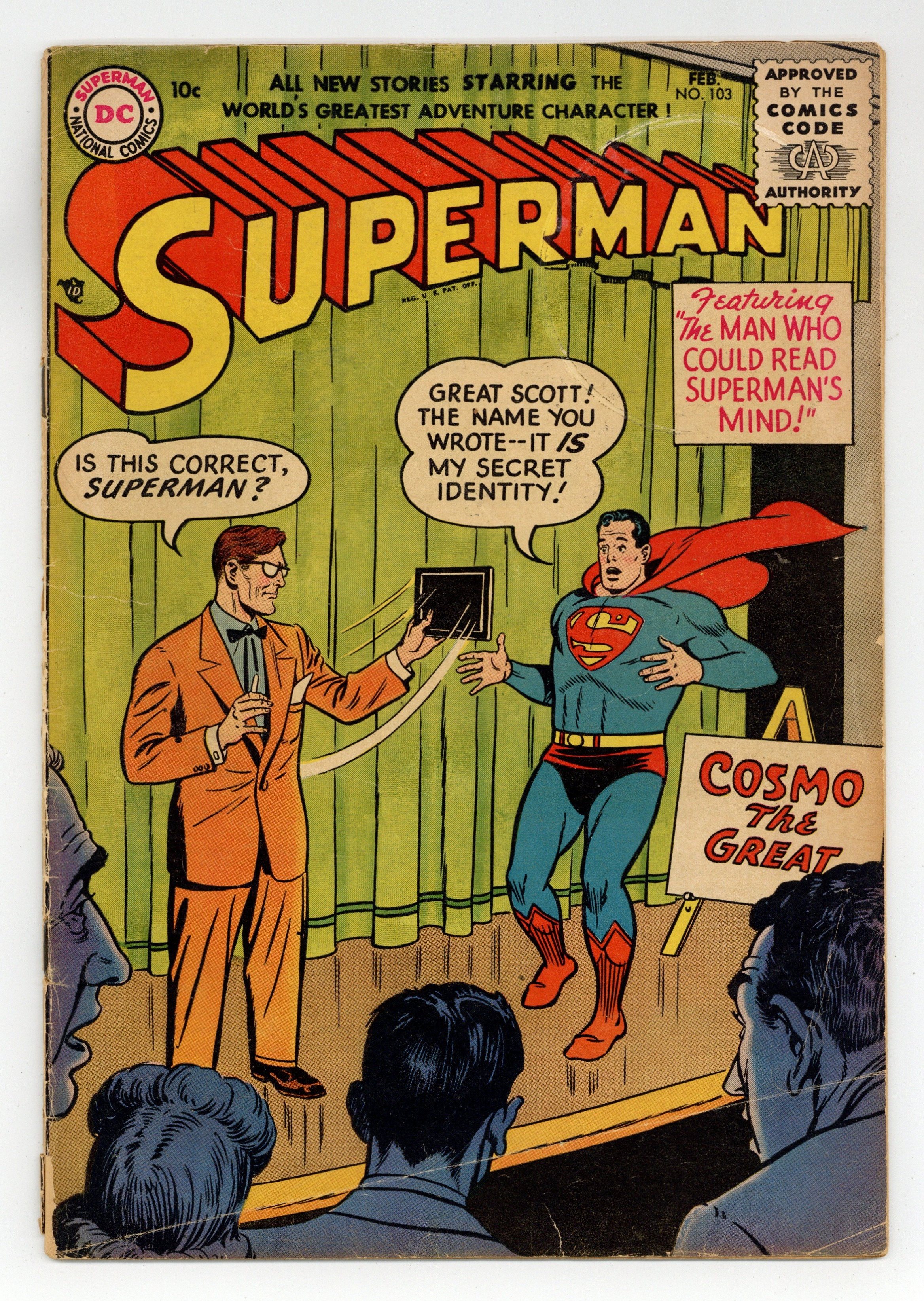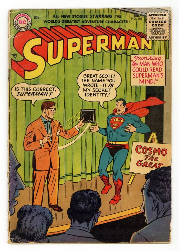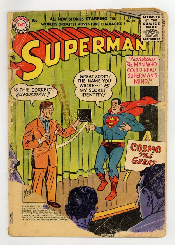 Cover art by Al Plastino. The Superman of Yesterday starring Superman and Jeremy Bird, pencils by Wayne Boring, inks by Stan Kaye. The Revenge of Mr. Mxyztplk (later spelled Mxyzptlk), art by Al Plastino. The Man Who Could Read Superman's Mind, pencils by Wayne Boring, inks by Stan Kaye; The Great Cosmo outs Superman as Clark Kent. 36 Pages, Full Color. Cover price $0.10.
