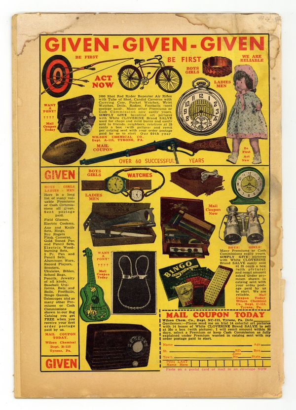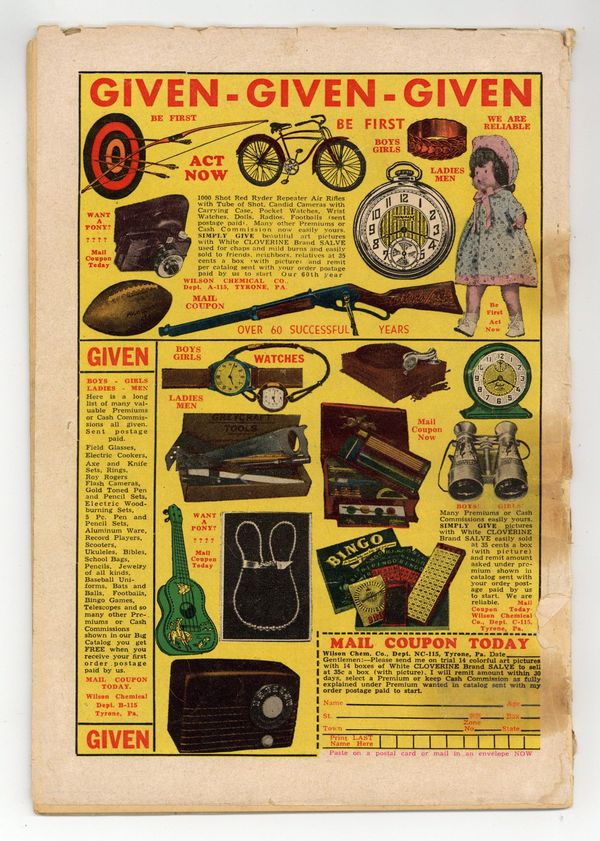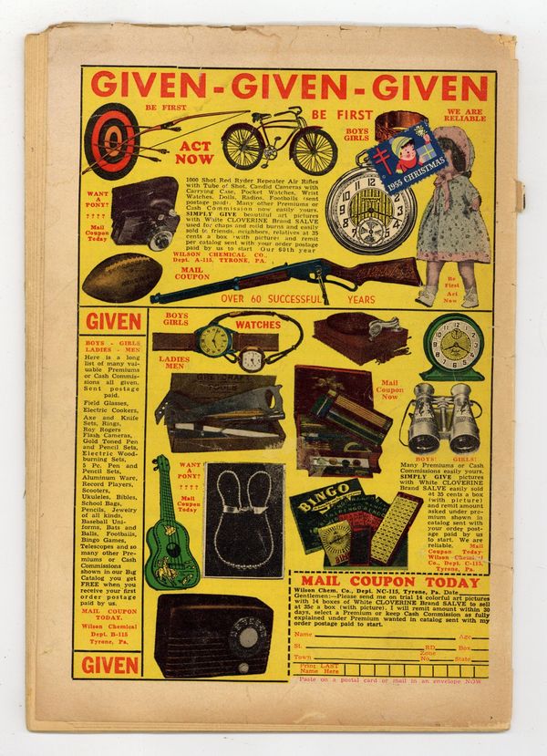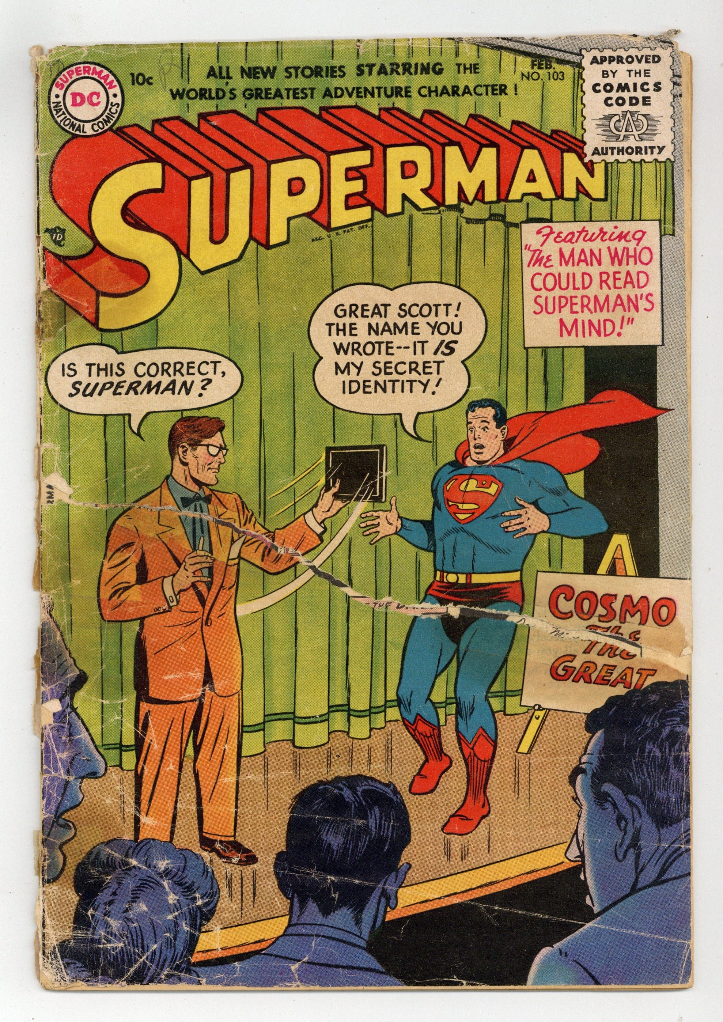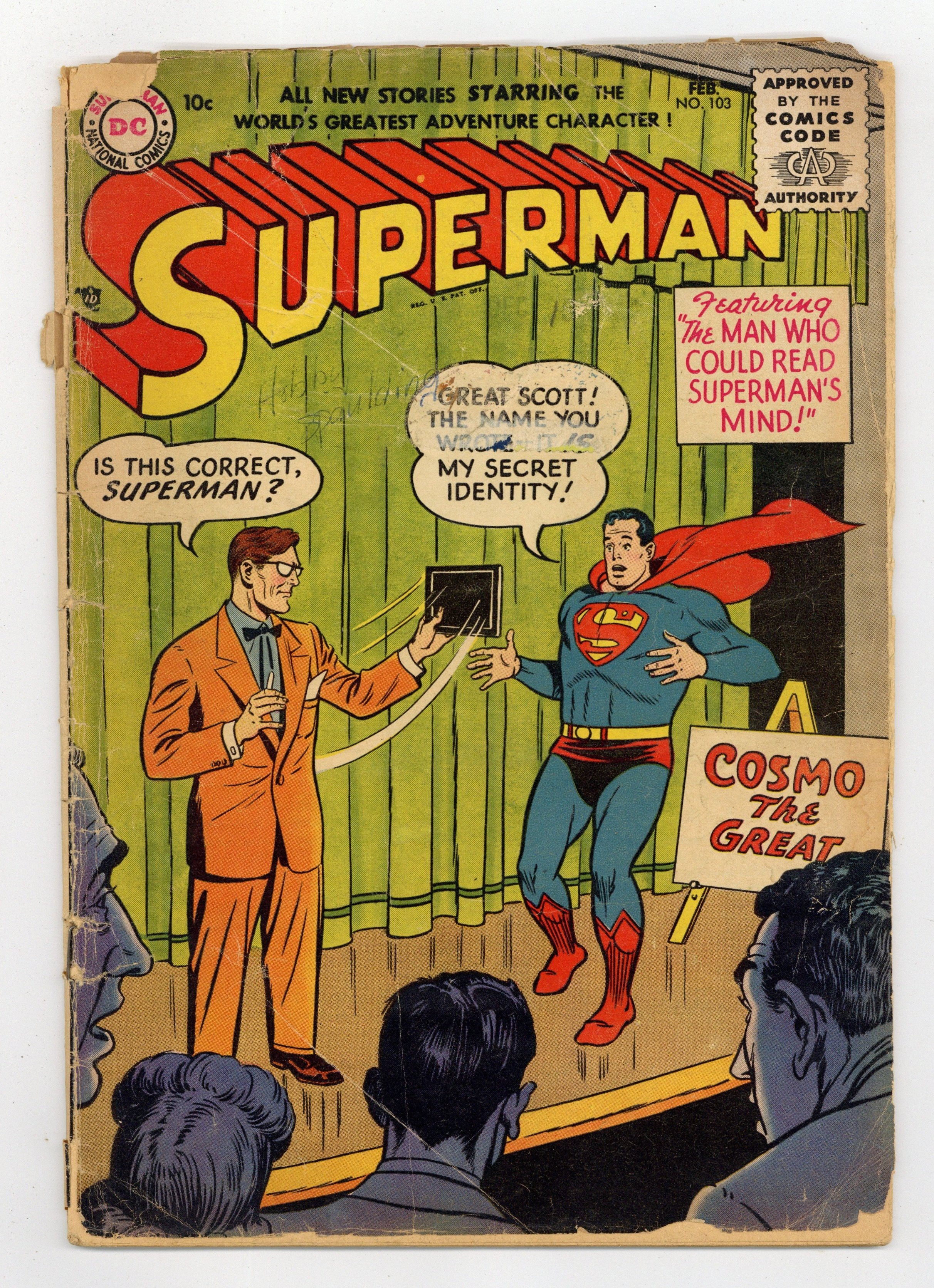 Cover art by Al Plastino. The Superman of Yesterday starring Superman and Jeremy Bird, pencils by Wayne Boring, inks by Stan Kaye. The Revenge of Mr. Mxyztplk (later spelled Mxyzptlk), art by Al Plastino. The Man Who Could Read Superman's Mind, pencils by Wayne Boring, inks by Stan Kaye; The Great Cosmo outs Superman as Clark Kent. 36 Pages, Full Color. Cover price $0.10.