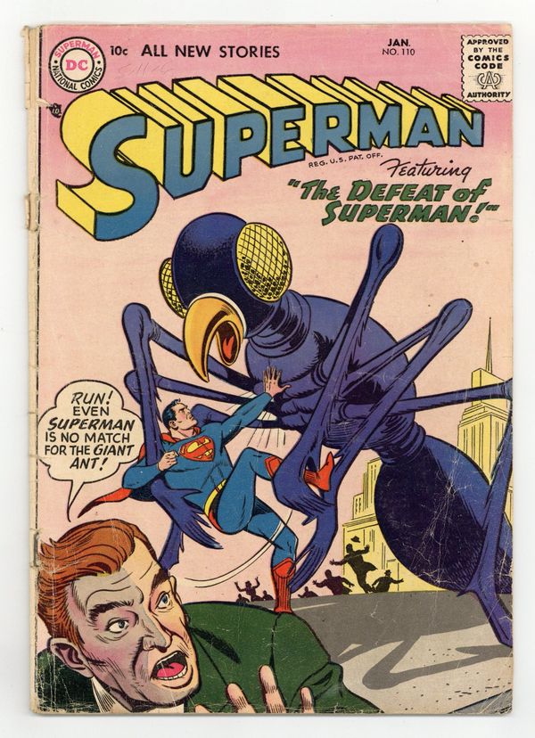 Tags: Superman$150.00Cover art by Al Plastino. The Secret of the Superman Trophy starring Superman, Les Keegan, and Lois Lane, pencils by Wayne Boring, inks by Stan Kaye. The Mystery Superman! starring Superman, Hal, and Lois Lane, pencils by Ruben Moreira, inks by Al Plastino. The Defeat of Superman starring Lex Luthor, script by Bill Finger, pencils by Wayne Boring, inks by Stan Kaye; Superman battles a giant ant. 36 Pages, Full Color. Cover price $0.10.