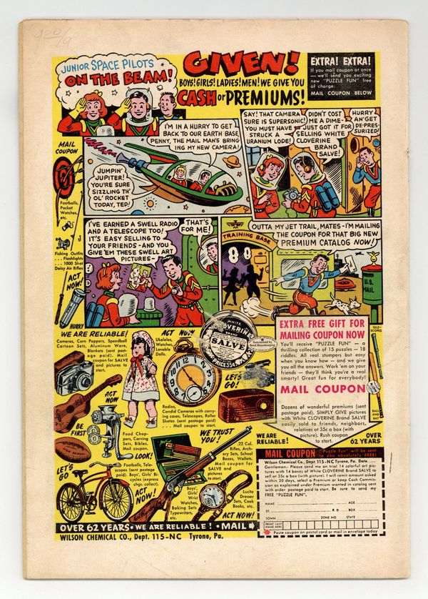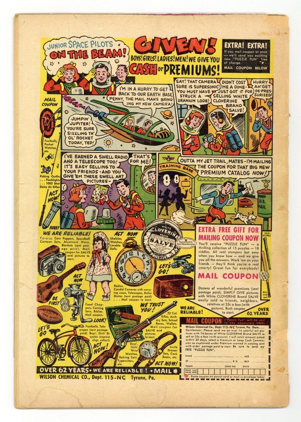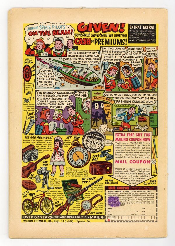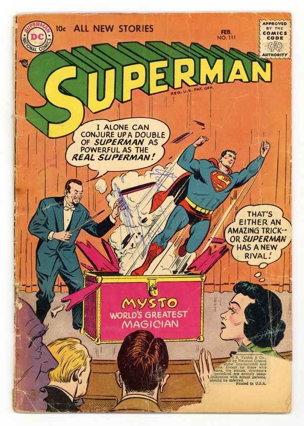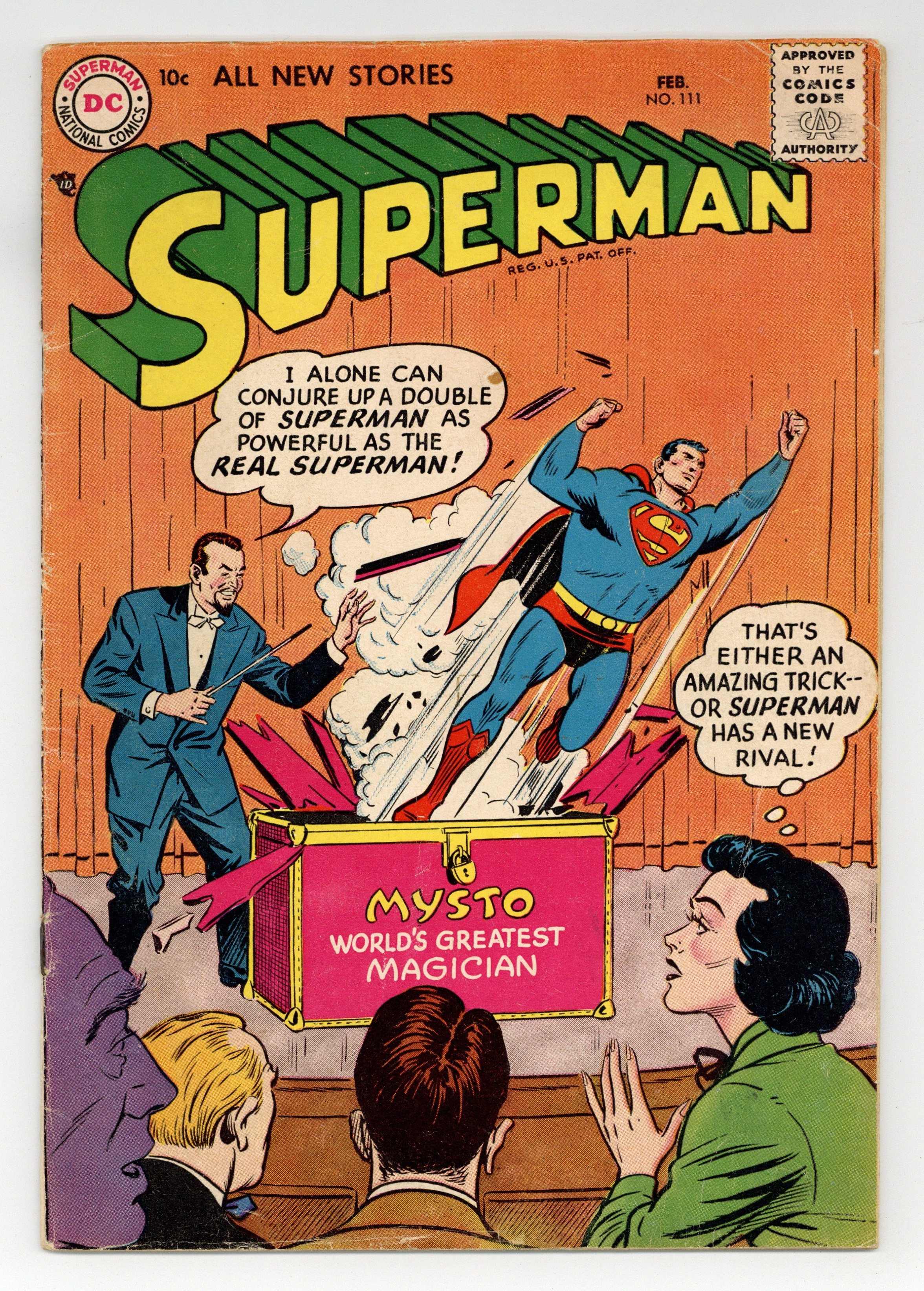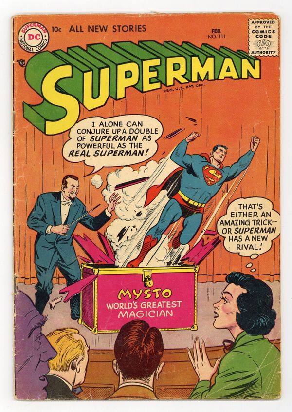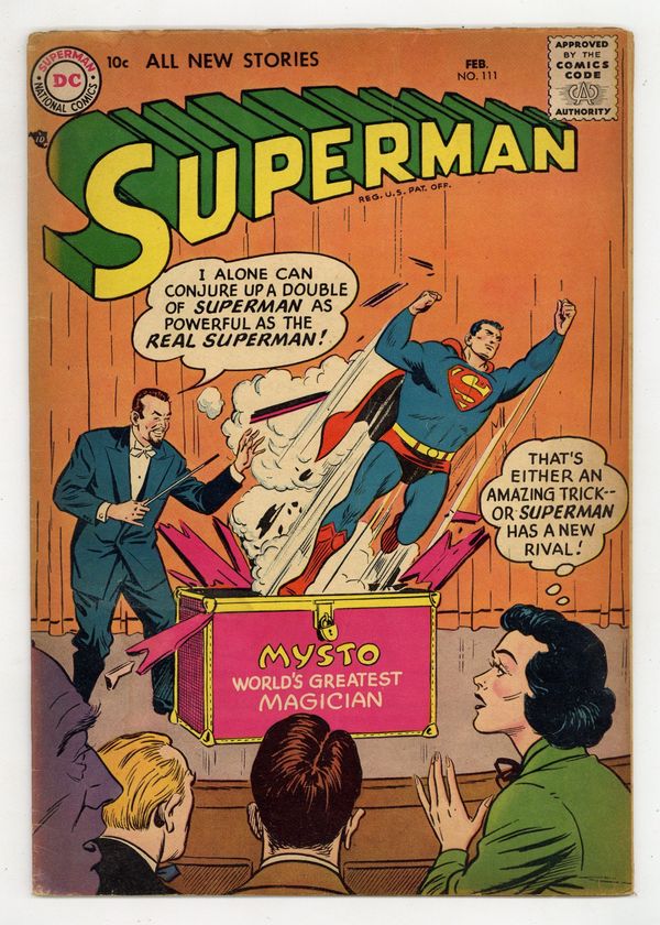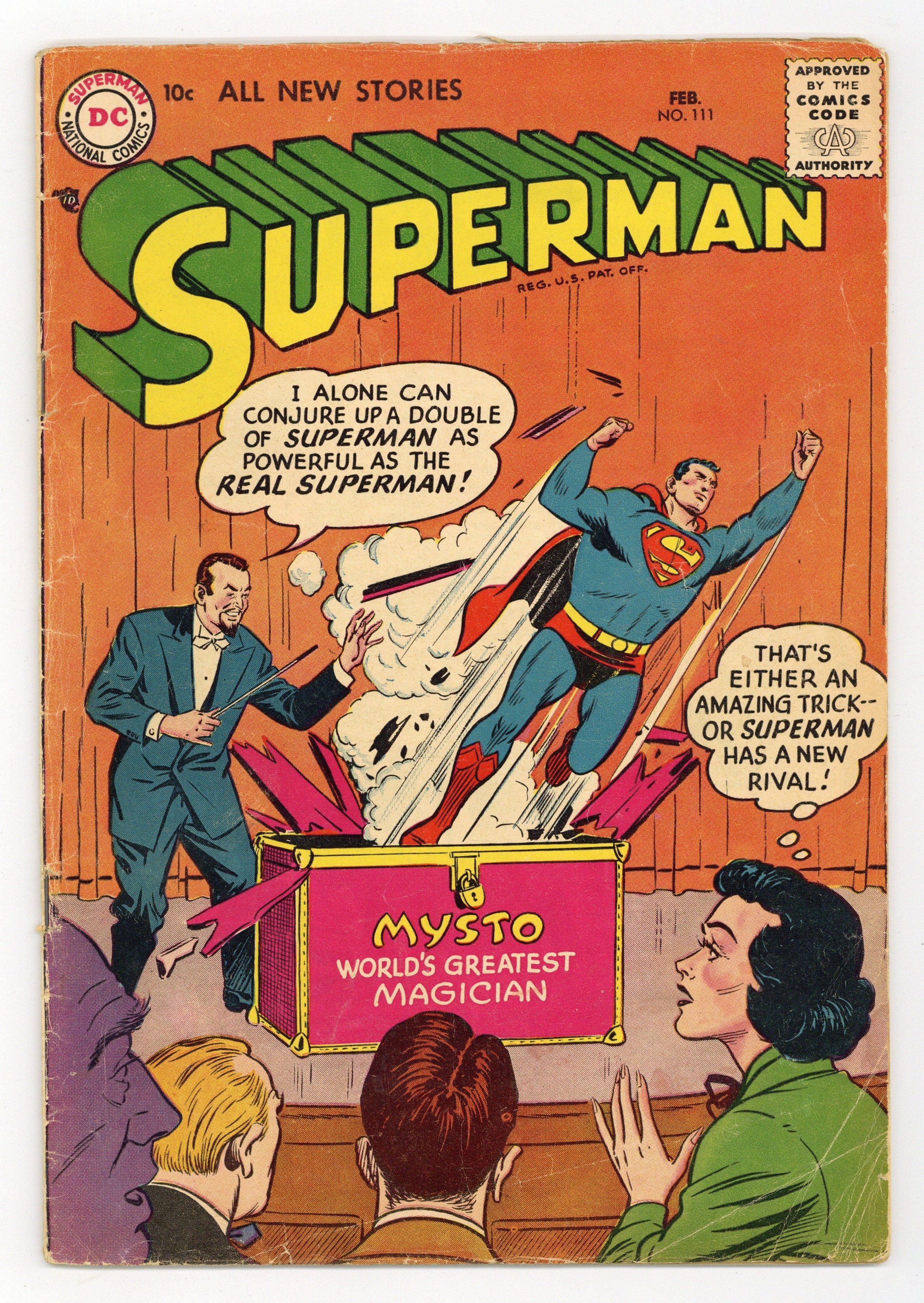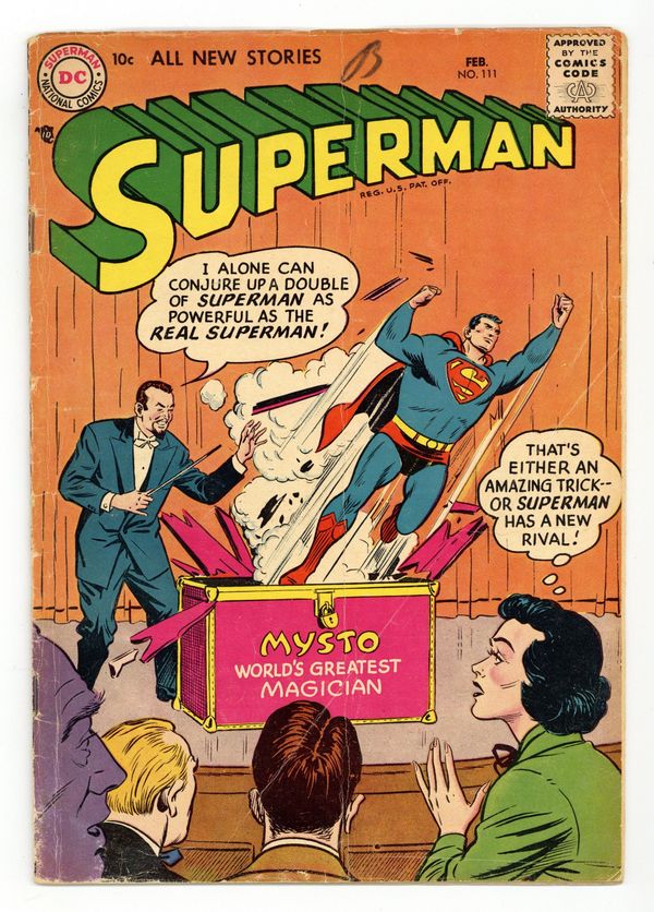 Tags: Superman$23.00Cover art by Al Plastino. The Non-Super Superman, script by Otto Binder, pencils by Ruben Moreira, inks by Al Plastino; Superman gives Jimmy Olsen a new trophy he found on an alien planet; Jimmy uses the device to transfer Superman's mind into Jimmy's body and Jimmy's mind into Superman's body. Shorty humor page by Henry Boltinoff. Winter Sports Champions of the World public service announcement. Clark Kent's Crooked Cousin starring Superman, Judd Kent, and Perry White, script by Alvin Schwartz, pencils by Ruben Moreira, inks by Al Plastino. The Toughest Jobs in the World text story. The Magical Superman starring Superman, Lois Lane, and Mysto the Great, script by Alvin Schwartz, pencils by Ruben Moreira, inks by Al Plastino. 36 Pages, Full Color. Cover price $0.10.