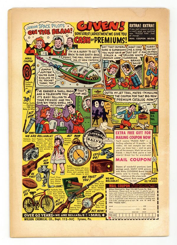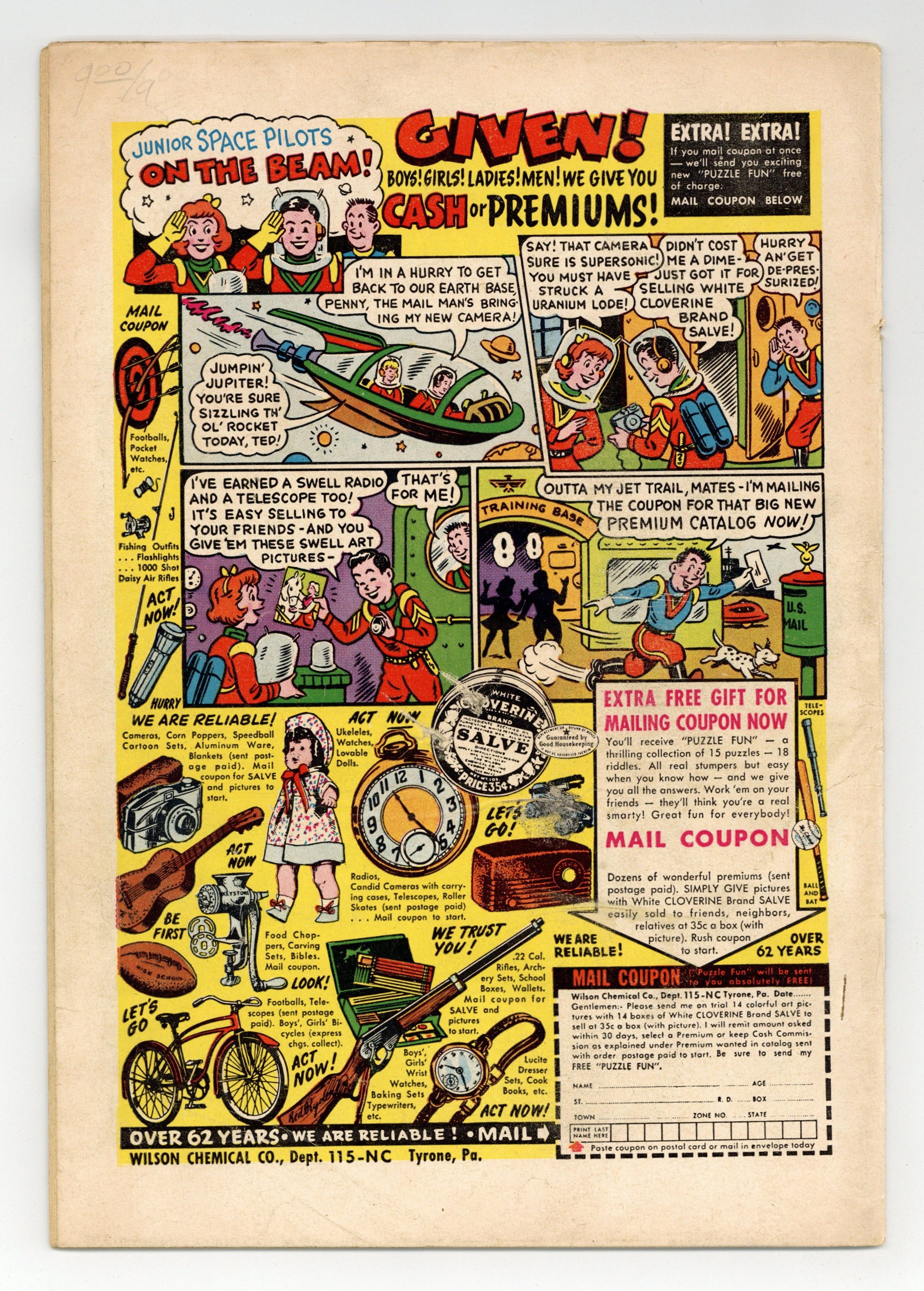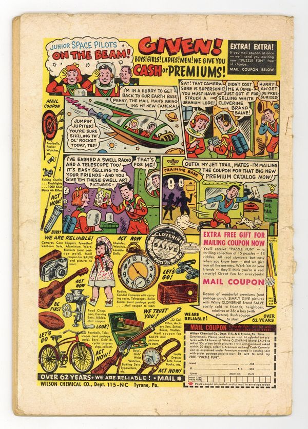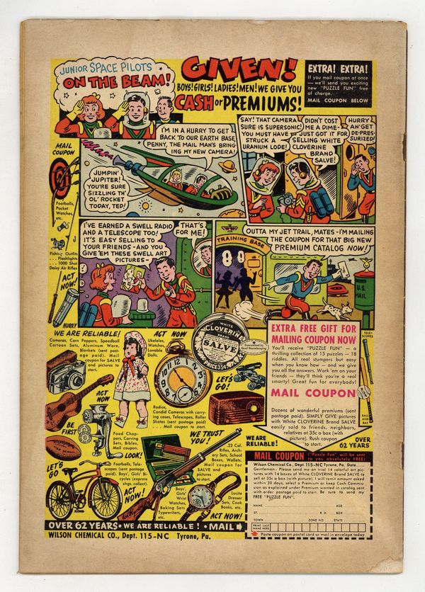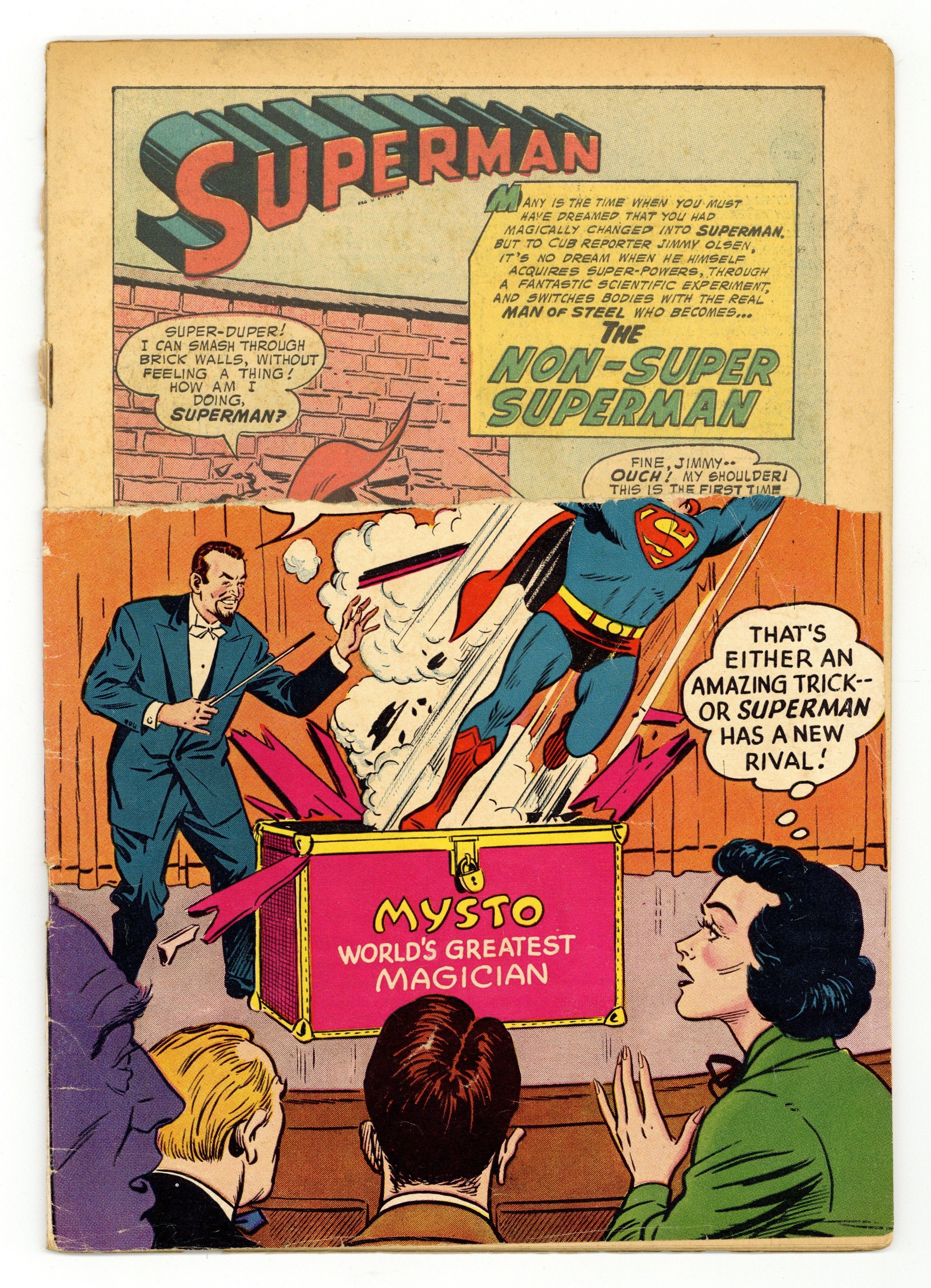Cover art by Al Plastino. The Non-Super Superman, script by Otto Binder, pencils by Ruben Moreira, inks by Al Plastino; Superman gives Jimmy Olsen a new trophy he found on an alien planet; Jimmy uses the device to transfer Superman's mind into Jimmy's body and Jimmy's mind into Superman's body. Shorty humor page by Henry Boltinoff. Winter Sports Champions of the World public service announcement. Clark Kent's Crooked Cousin starring Superman, Judd Kent, and Perry White, script by Alvin Schwartz, pencils by Ruben Moreira, inks by Al Plastino. The Toughest Jobs in the World text story. The Magical Superman starring Superman, Lois Lane, and Mysto the Great, script by Alvin Schwartz, pencils by Ruben Moreira, inks by Al Plastino. 36 Pages, Full Color. Cover price $0.10.