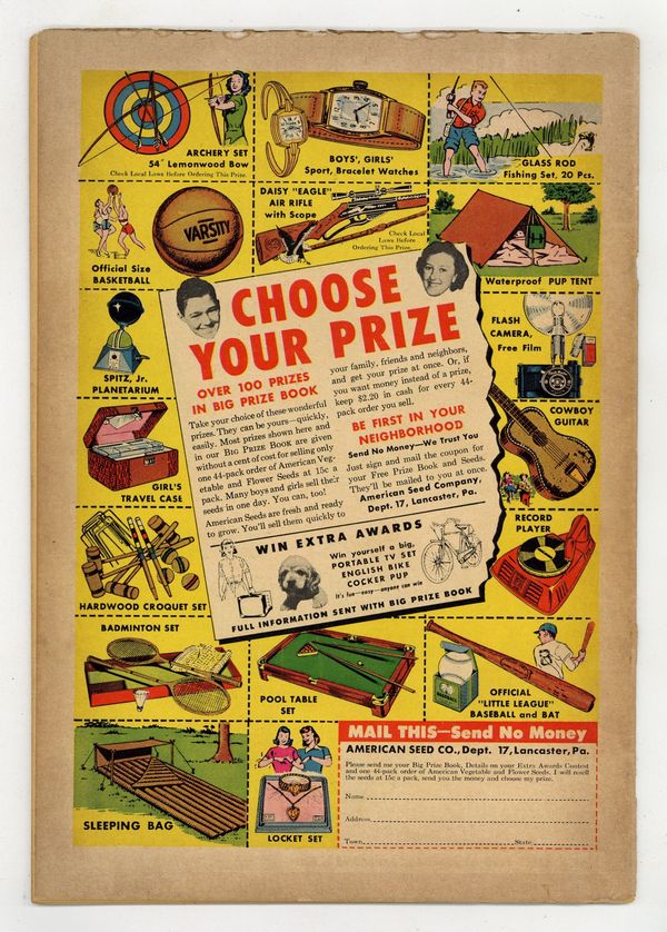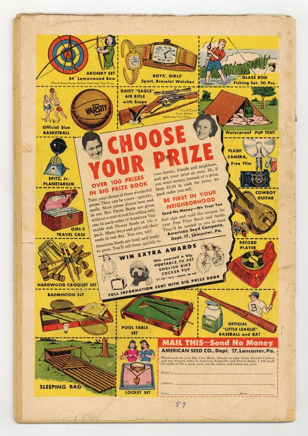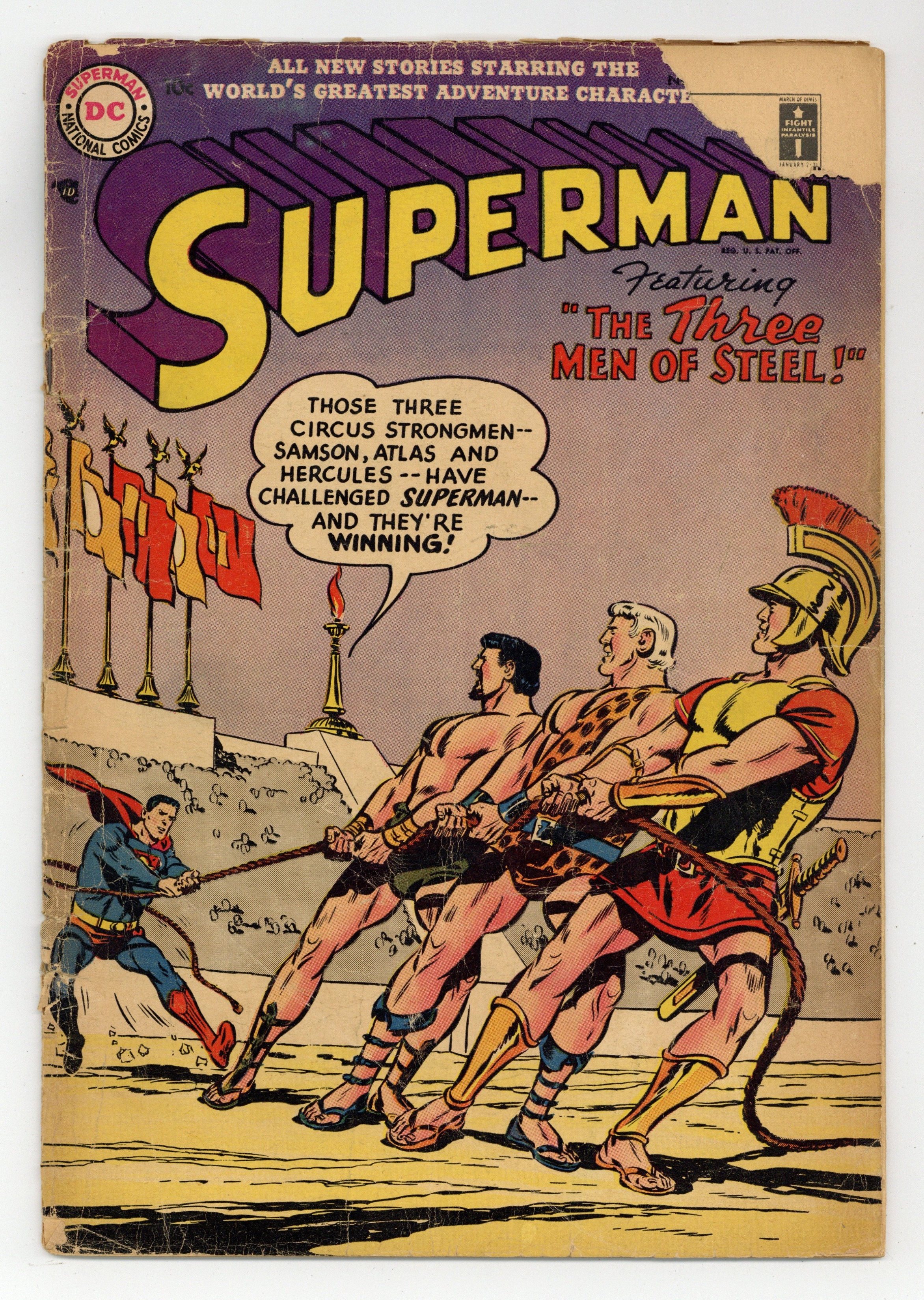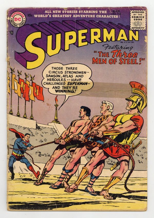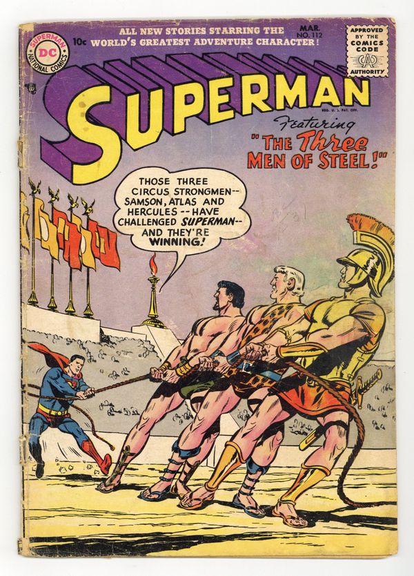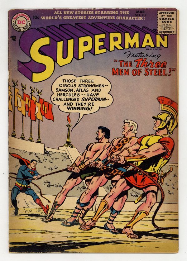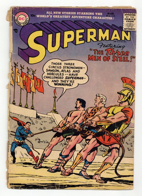 Cover pencils by Wayne Boring, inks by Stan Kaye. Superman's Neighbors, script by Bill Finger, pencils by Wayne Boring, inks by Stan Kaye; One of Clark Kent's neighbors is monitoring his comings and goings; Superman is afraid he will stumble into his secret identity and must come up with a way to throw him off the trail. Superman's Fatal Costume starring Superman and Lex Luthor, script by Jerry Coleman, art by Al Plastino. The Three Men of Steel starring Superman and Prof. Wilton, pencils by Wayne Boring, inks by Stan Kaye. 36 Pages, Full Color. Cover price $0.10.
