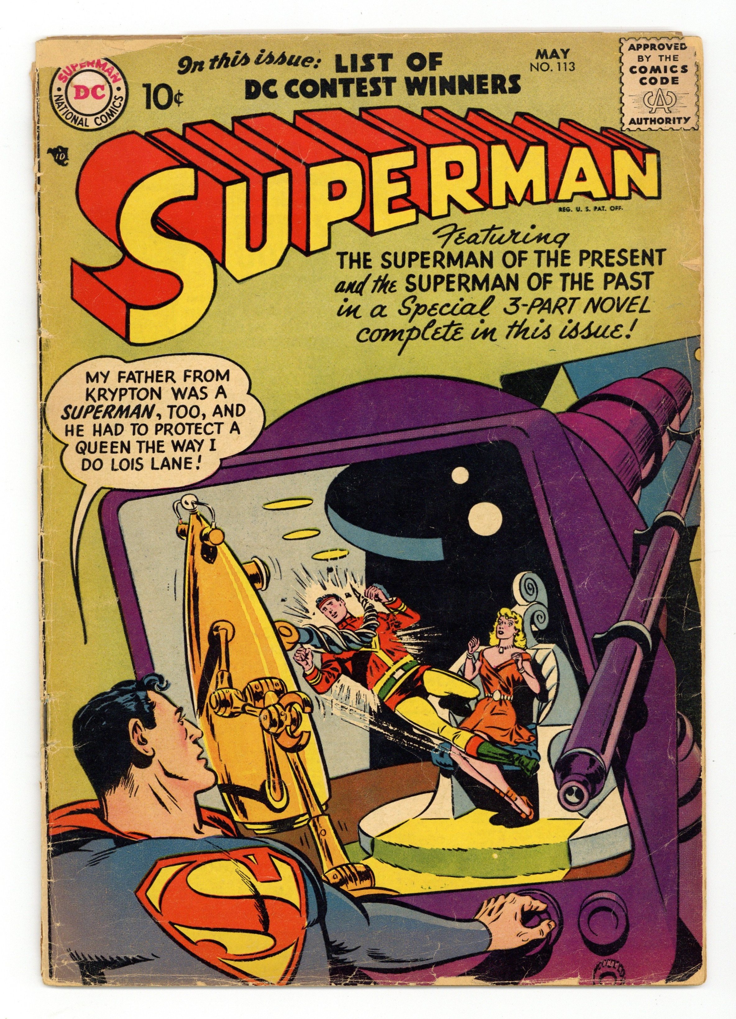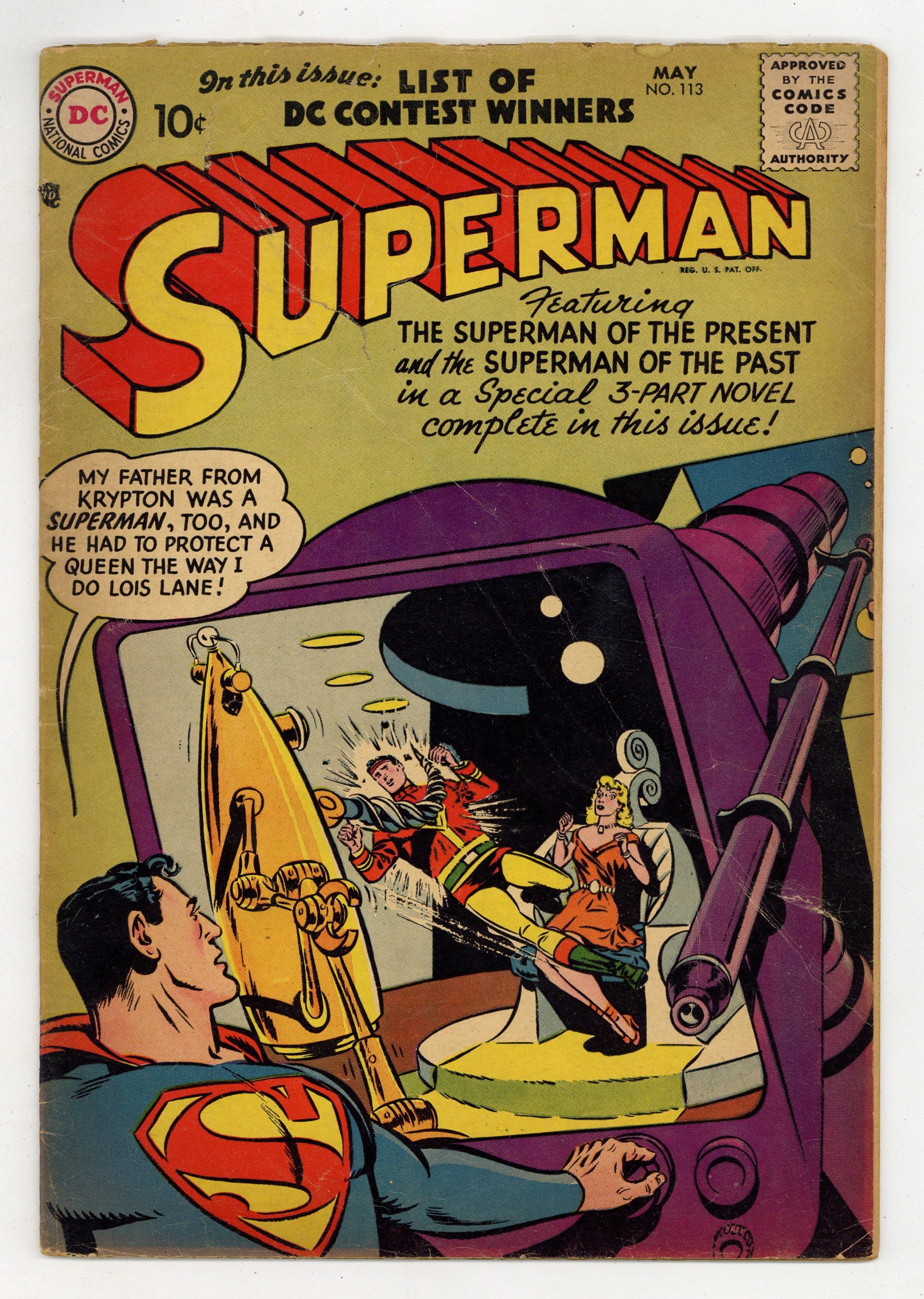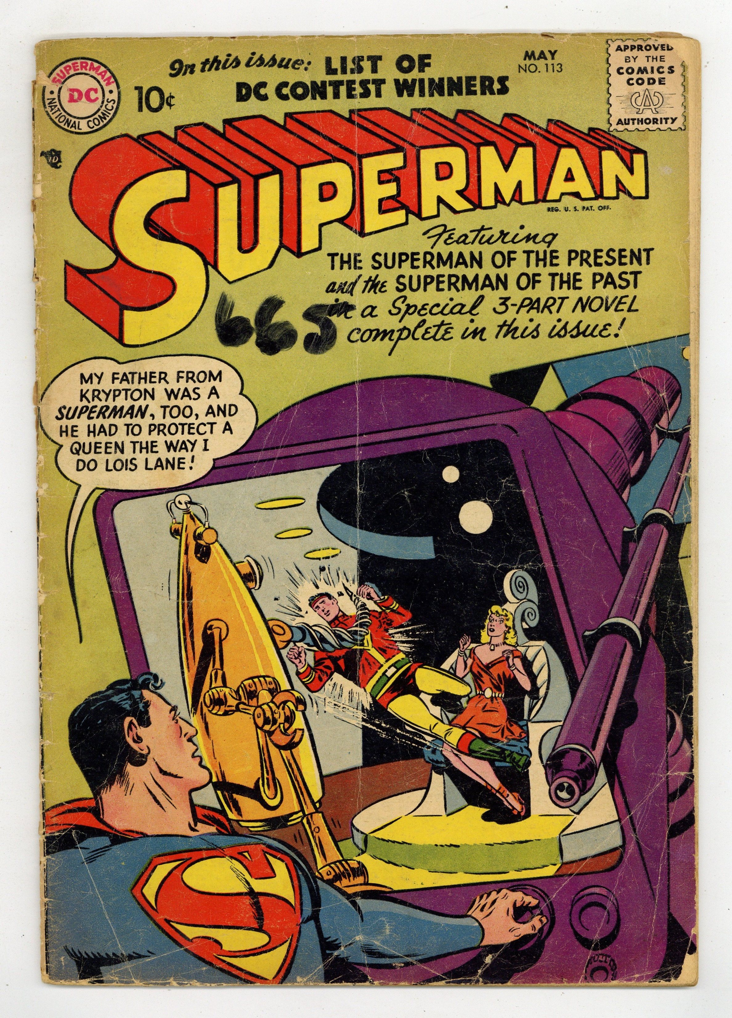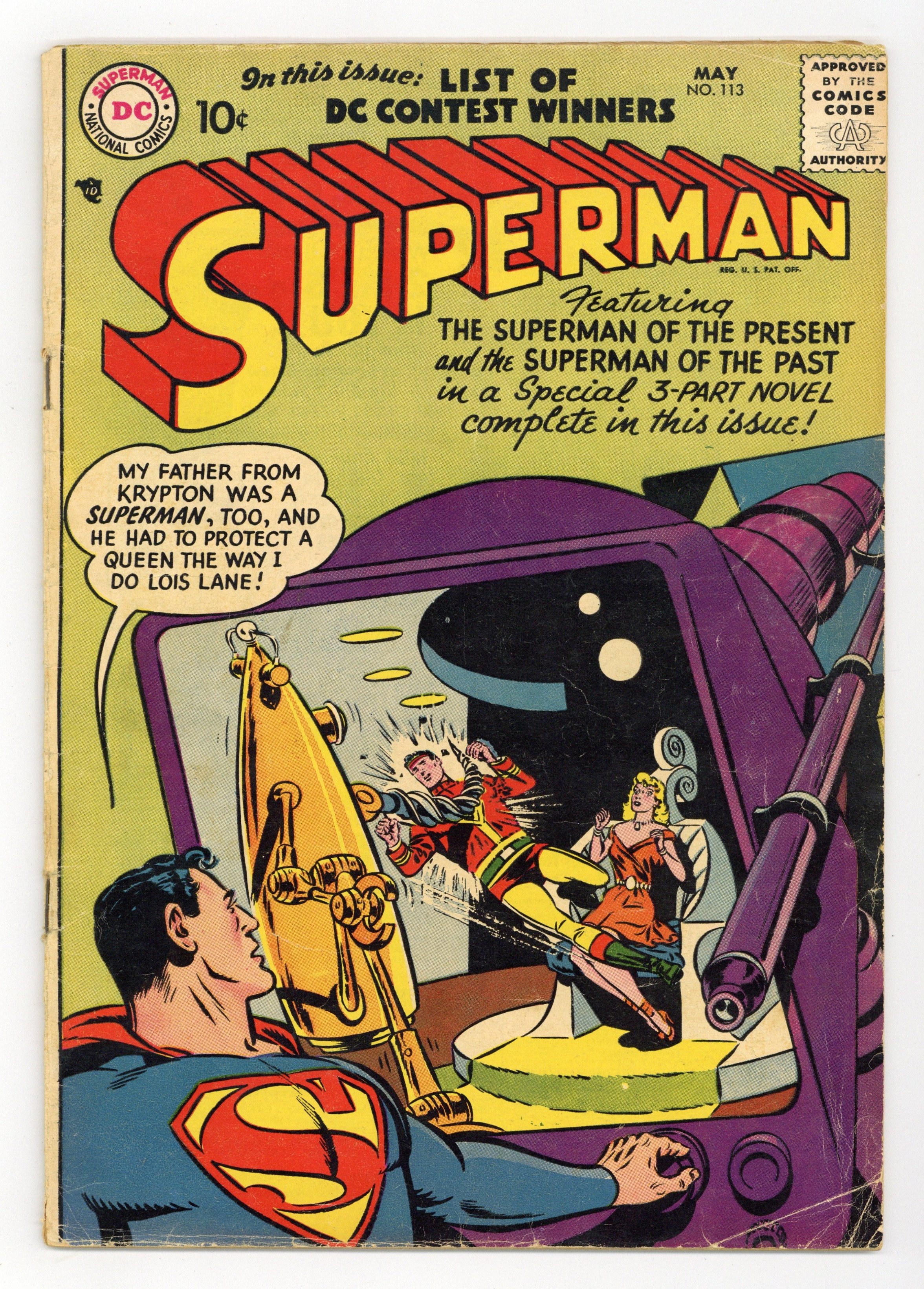 1st full-issue (3-part) Superman story. Cover pencils by Wayne Boring, inks by Stan Kaye. The Superman of the Past (Part 1), script by Bill Finger, pencils by Wayne Boring, inks by Stan Kaye; After disposing of a Kryptonite meteor, Superman finds a box containing a mysterious helmet which contains "mind-tapes" of an adventure Jor-El had before Krypton blew up. The Secret of the Towers (Part 2), script by Bill Finger, pencils by Wayne Boring, inks by Stan Kaye. DC Slogan contest winners. Hy Wire humor page by Henry Boltinoff. The Superman of the Present (Part 3). A Date With Effie public service announcement, script by Jack Schiff, pencils by Curt Swan, inks by Stan Kaye. 36 Pages, Full Color. Cover price $0.10.