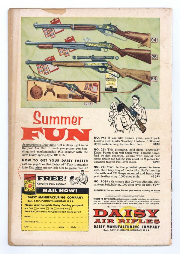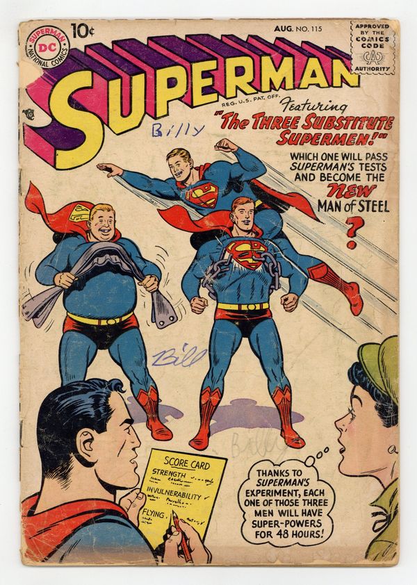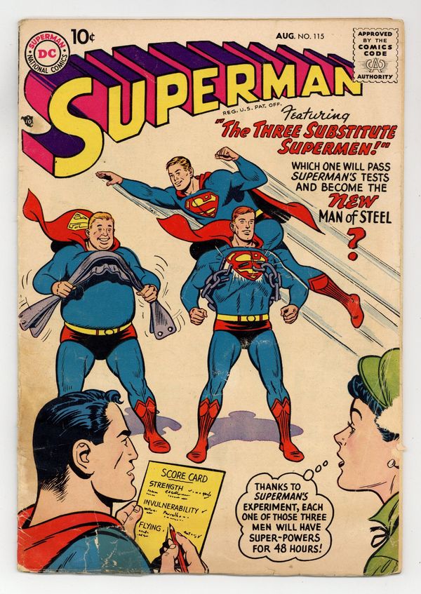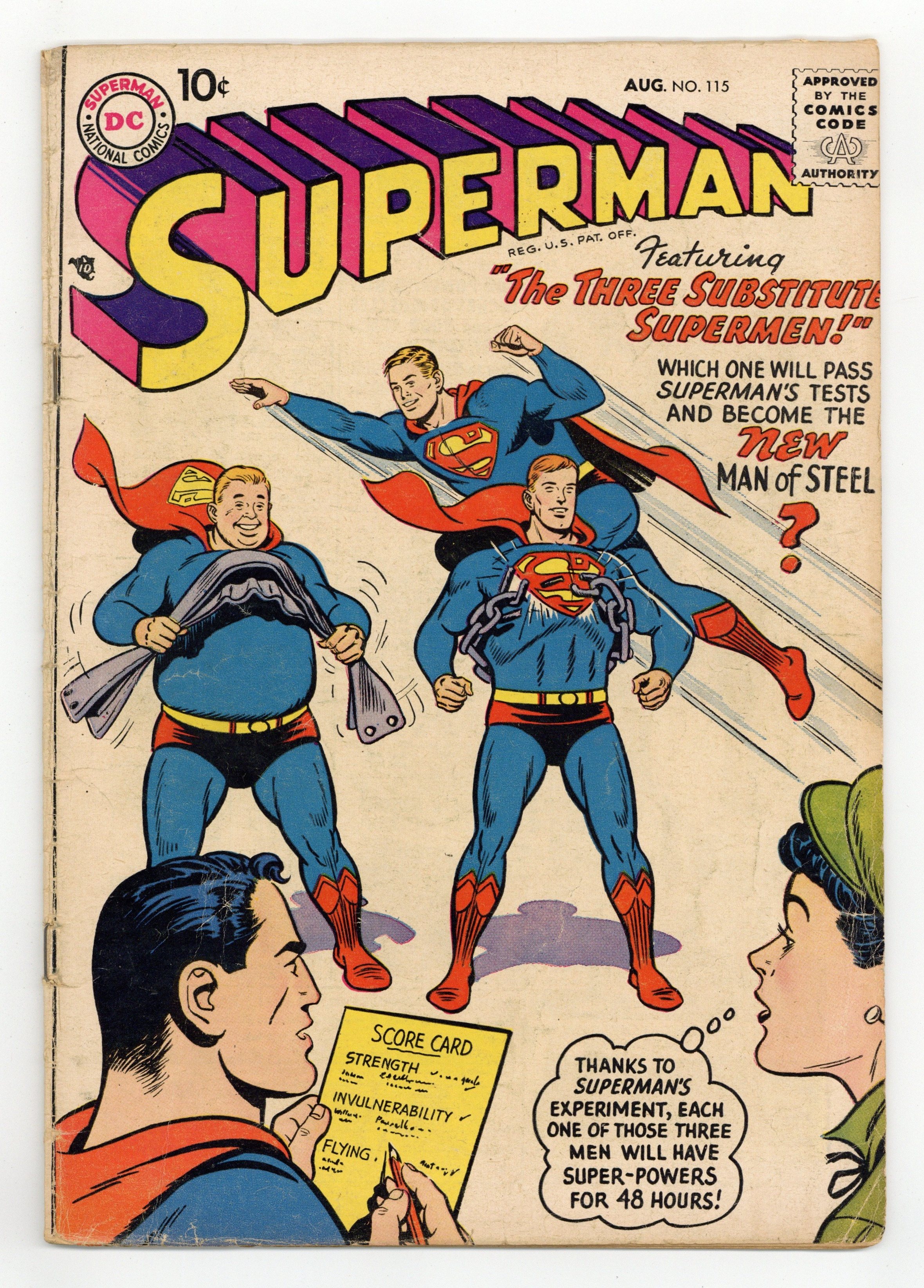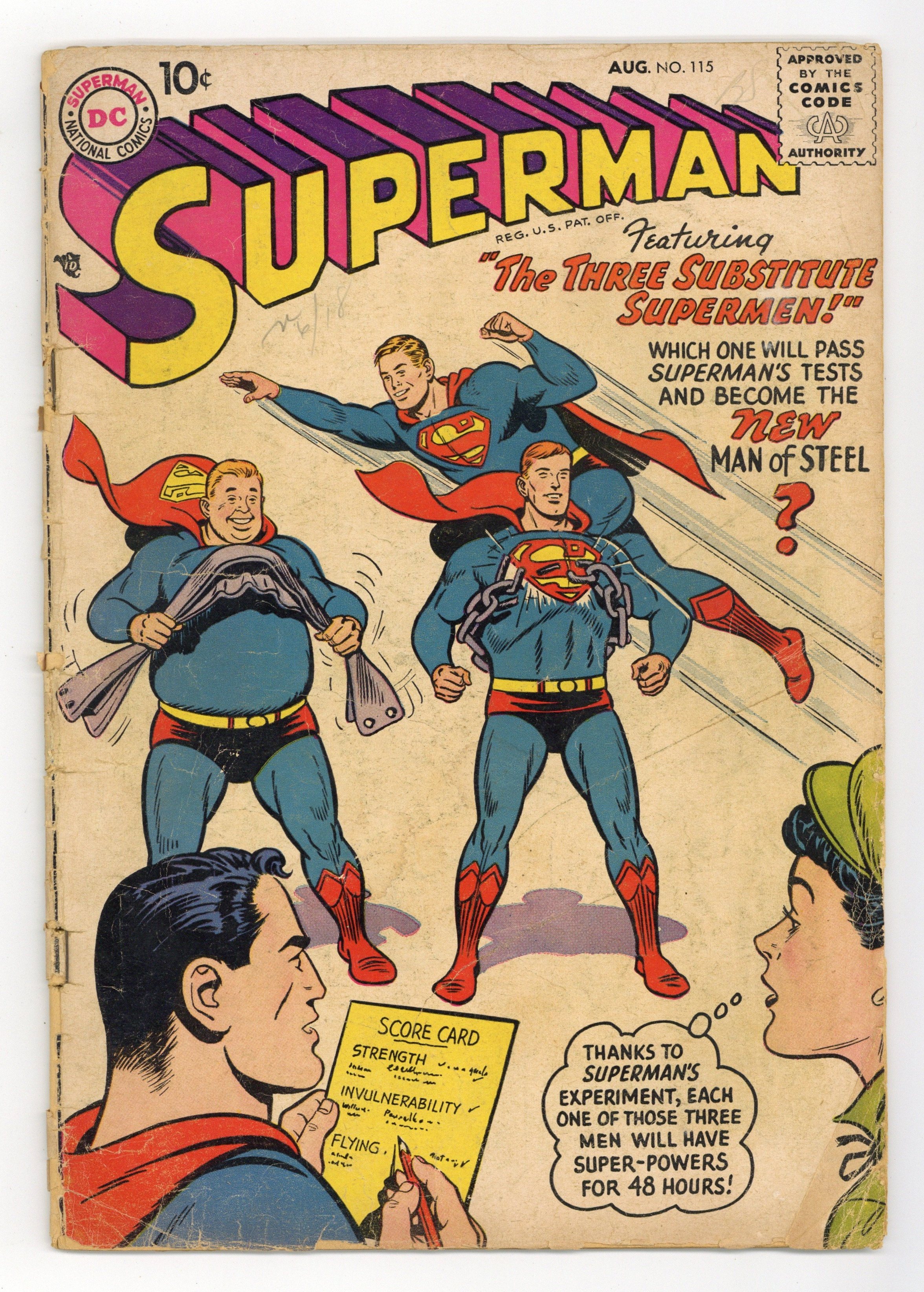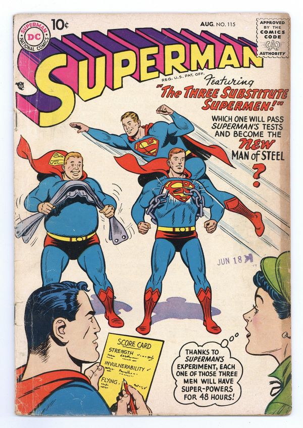 Cover art by Al Plastino. The Midget Superman, script by Otto Binder, pencils by Wayne Boring, inks by Stan Kaye. Jimmy Olsen's Lost Pal starring Superman and Many-Faces Fulton, script by Otto Binder, art by Al Plastino. The Three Substitute Supermen starring Superman and The Organizer, script by Jerry Coleman, pencils by Wayne Boring, inks by Stan Kaye; three potential heroes vie to become the temporary Man of Steel. 36 Pages, Full Color. Cover price $0.10.