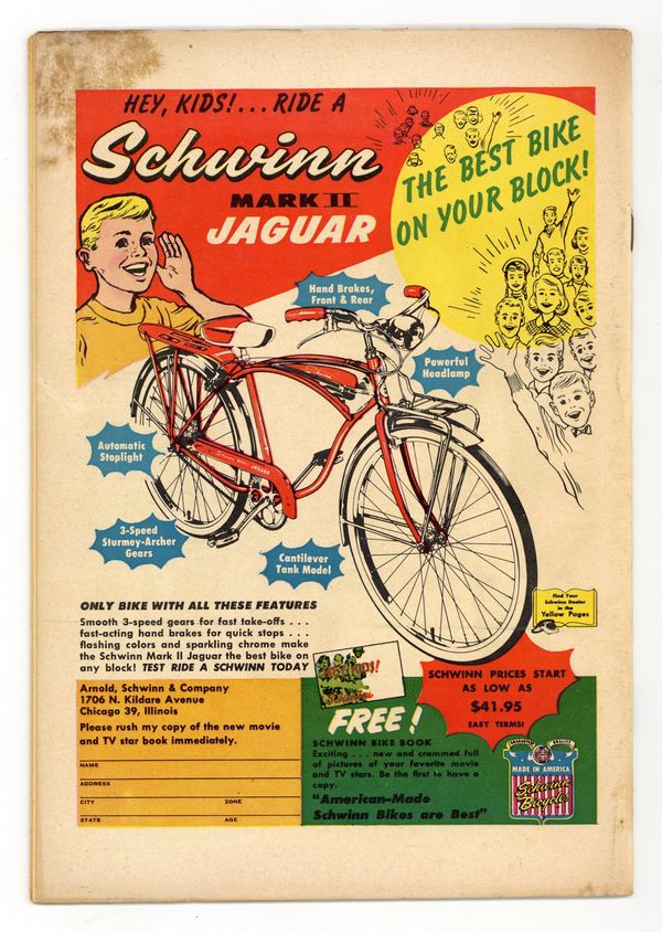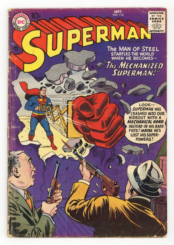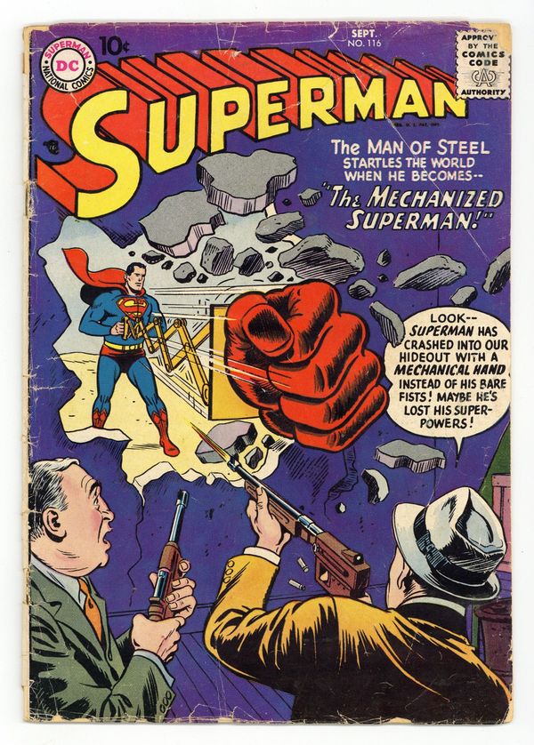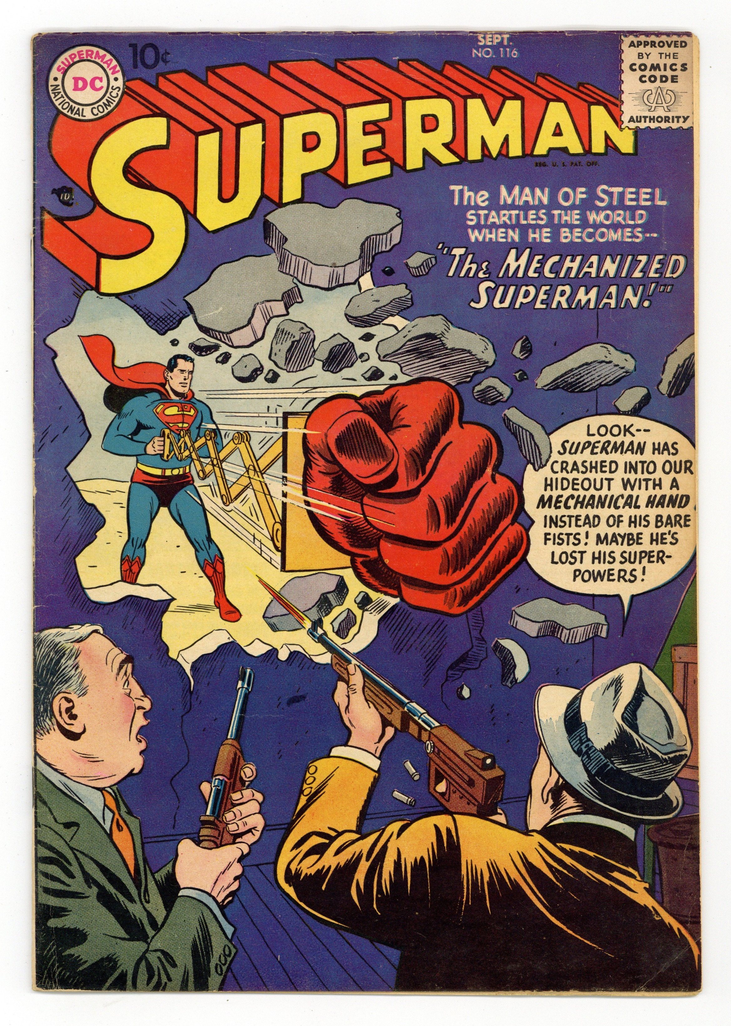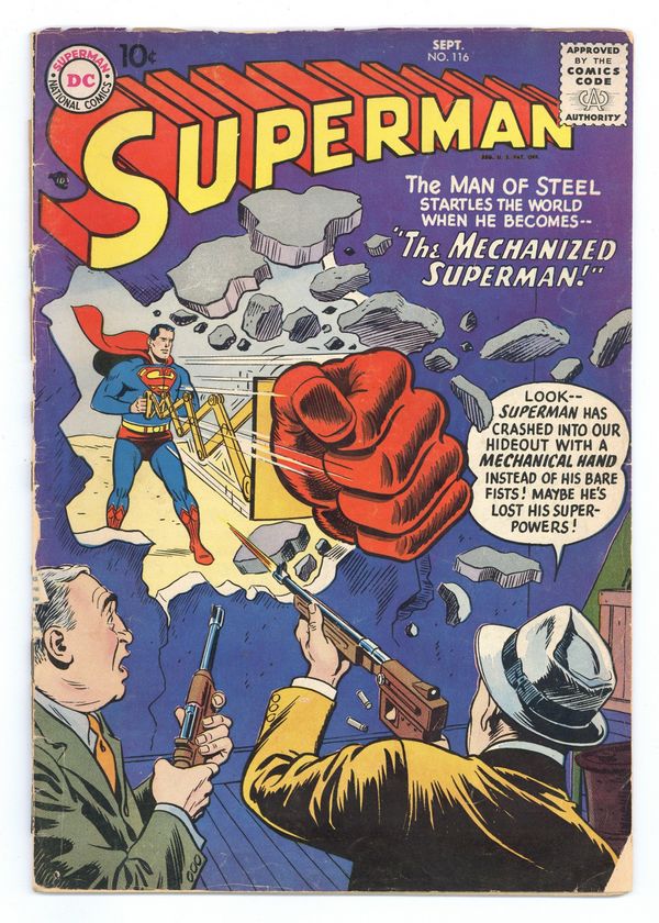 Cover art by Al Plastino. The Ray That Changed Superman starring Superman and Rex Malcolm, script by Jerry Coleman, art by Al Plastino. Disaster Strikes Twice, art by Al Plastino; Superman returns to Smallville. The Mechanized Superman starring Superman and Professor Ephraim Snively, art by Al Plastino; A Green Kryptonite dust cloud endangers Superman. 36 Pages, Full Color. Cover price $0.10.