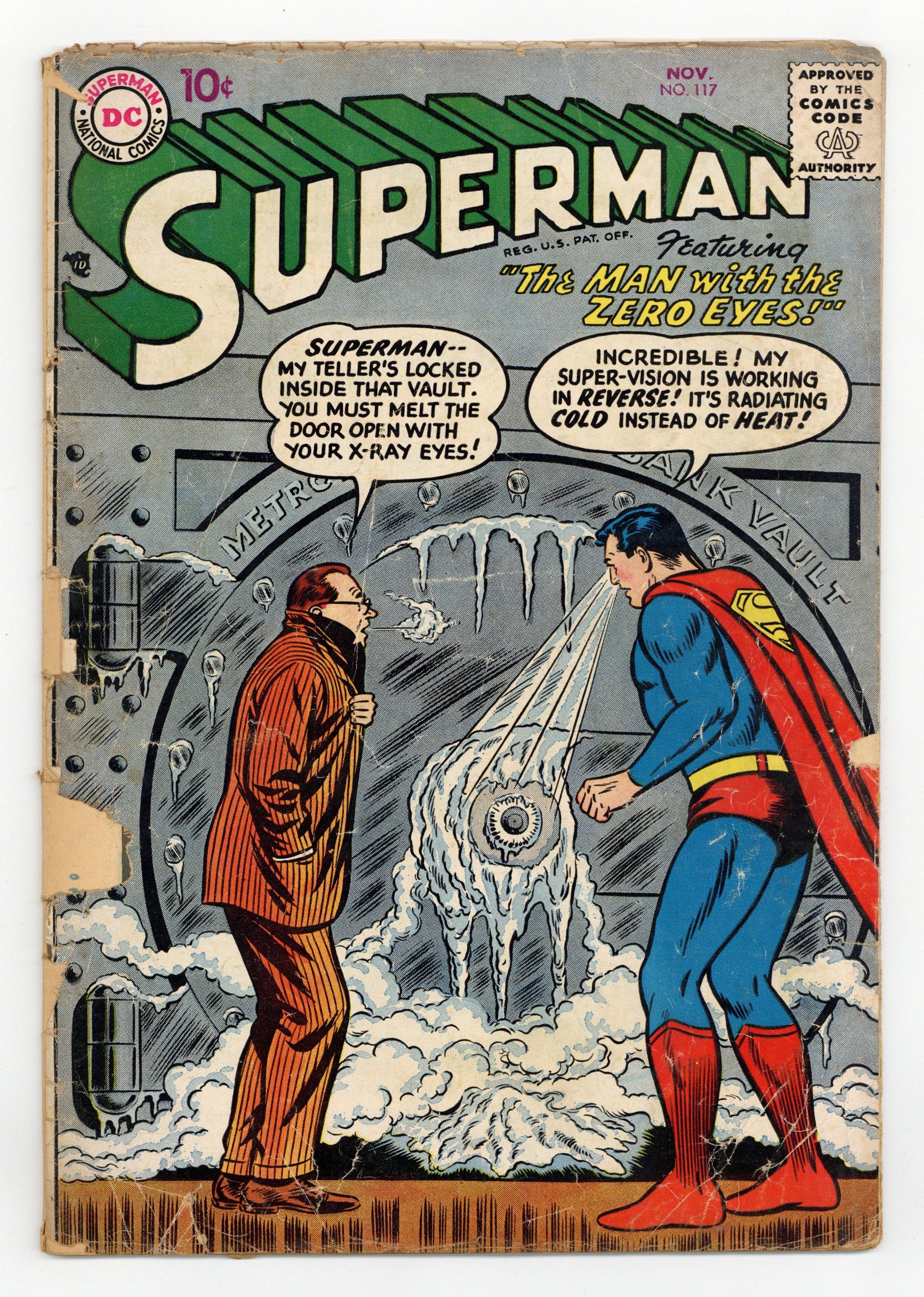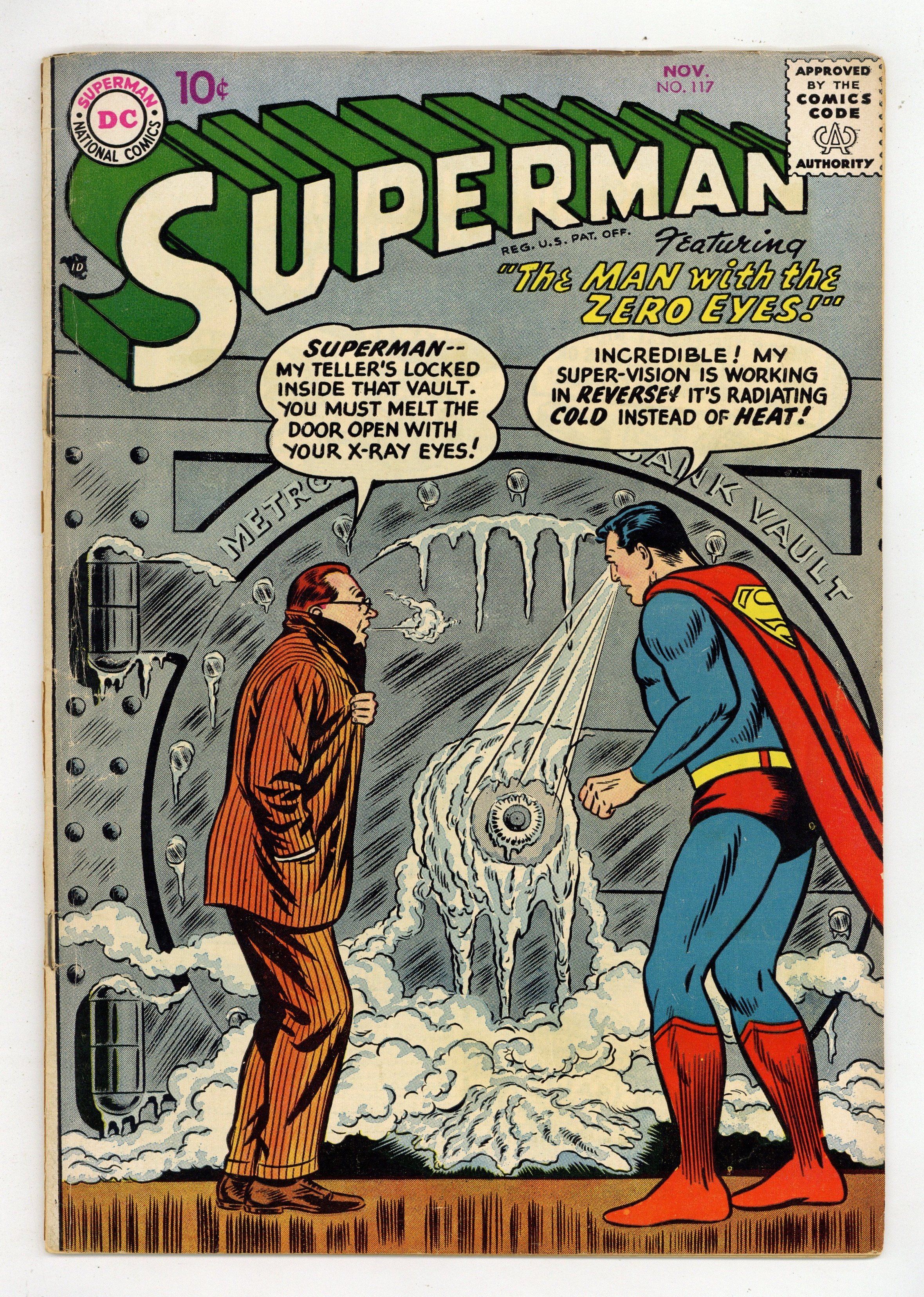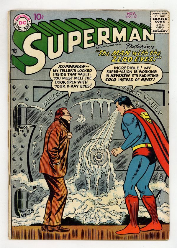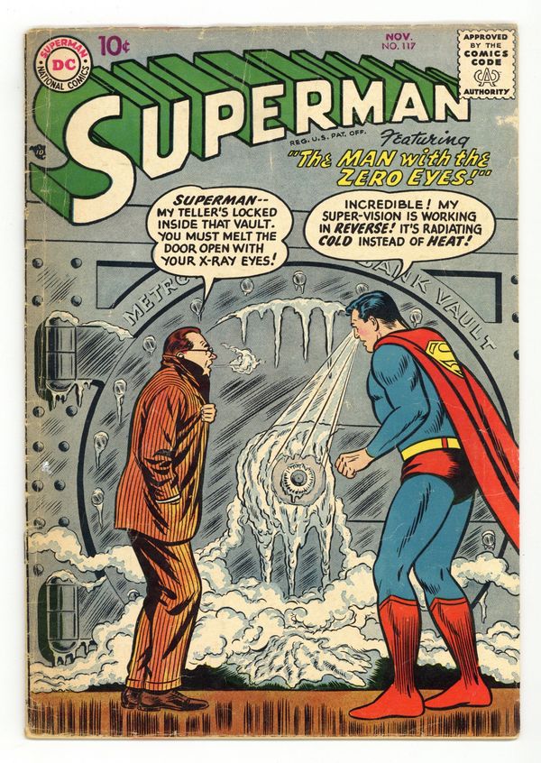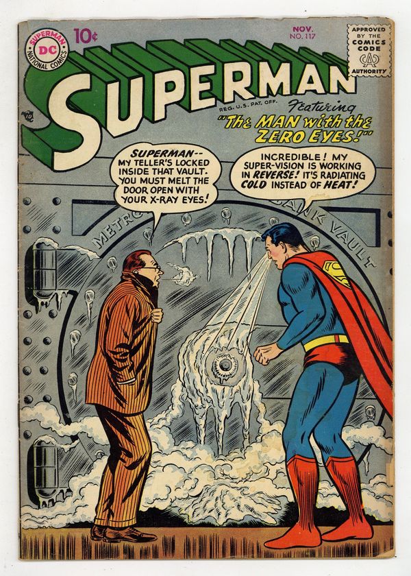 Cover pencils by Curt Swan, inks by Stan Kaye. Clark Kent, Man of Mystery starring Superman, script by Otto Binder, pencils by Wayne Boring, inks by Stan Kaye. The Secret of Fort Superman starring Superman and Lex Luthor, script by Otto Binder, pencils by Wayne Boring, inks by Stan Kaye. The Man With the Zero Eyes starring Superman and Rex Chalmers, art by Al Plastino; Superman's heat vision (called super-vision here) is cold instead of hot. 36 Pages, Full Color. Cover price $0.10.