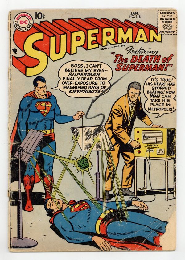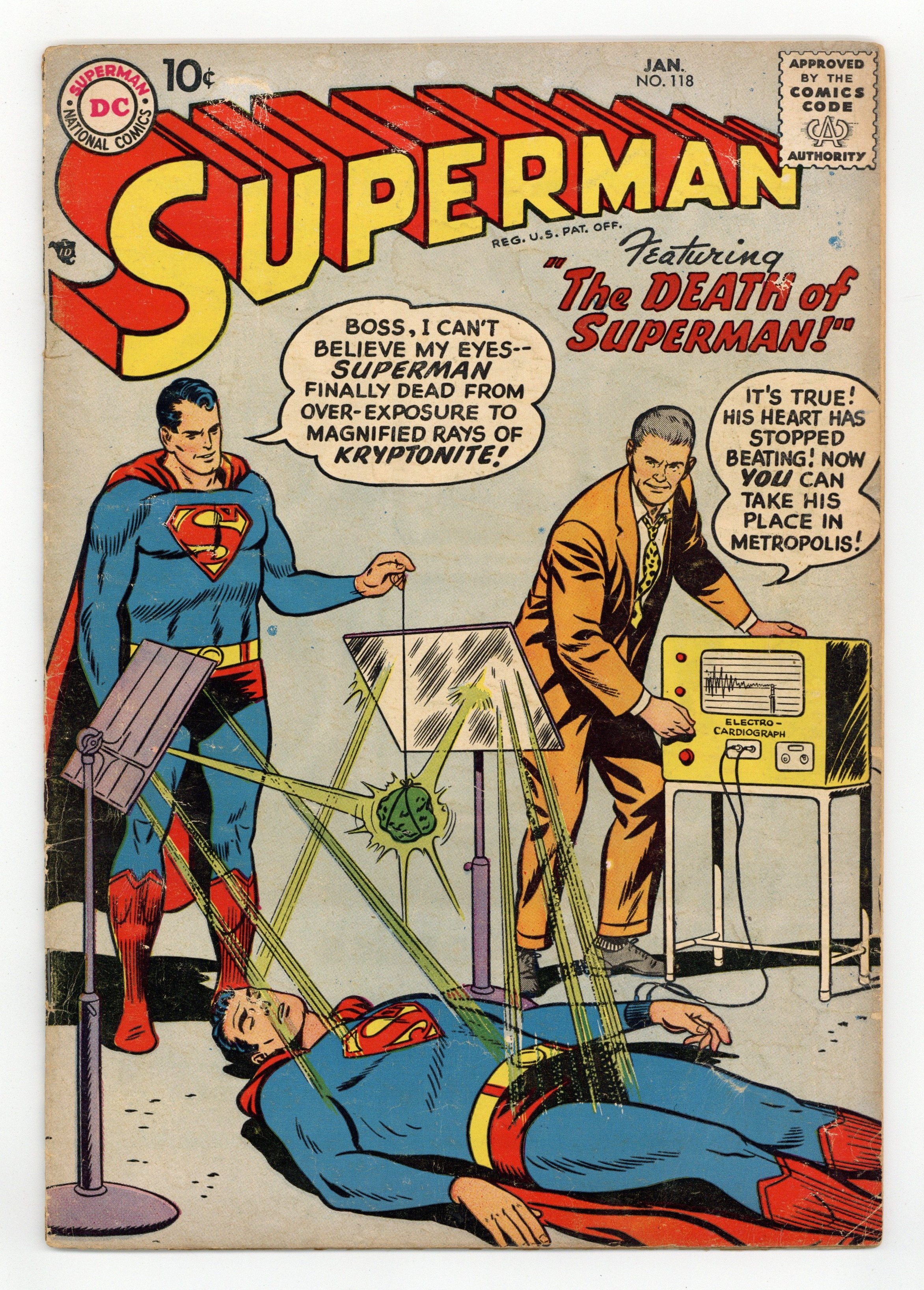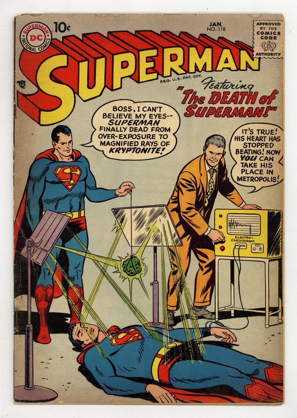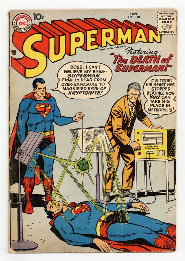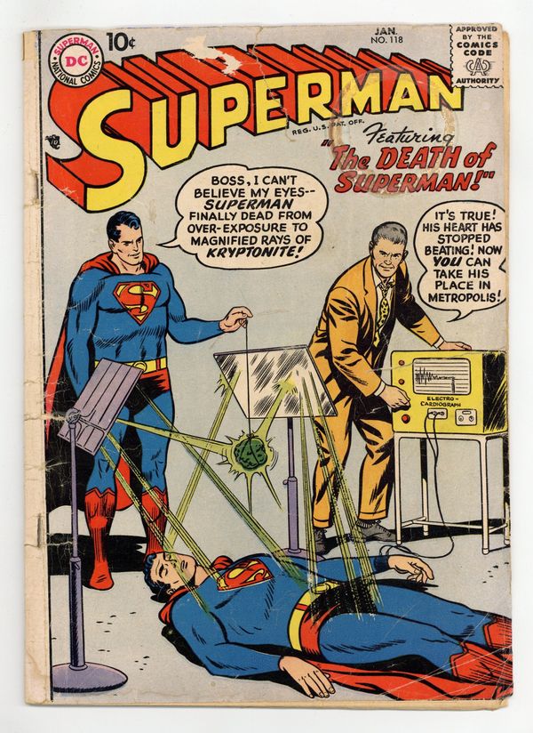 Cover pencils by Curt Swan, inks by Stan Kaye. The Prehistoric Pet, art by Al Plastino; Superman battles a fire-breathing dragon. The Boy Napoleon starring Superman, pencils by Curt Swan, inks by Ray Burnley. The Death of Superman starring Superman and Blacky Barton, art by Al Plastino; Superman apparently succumbs to Kryptonite rays. 36 Pages, Full Color. Cover price $0.10.