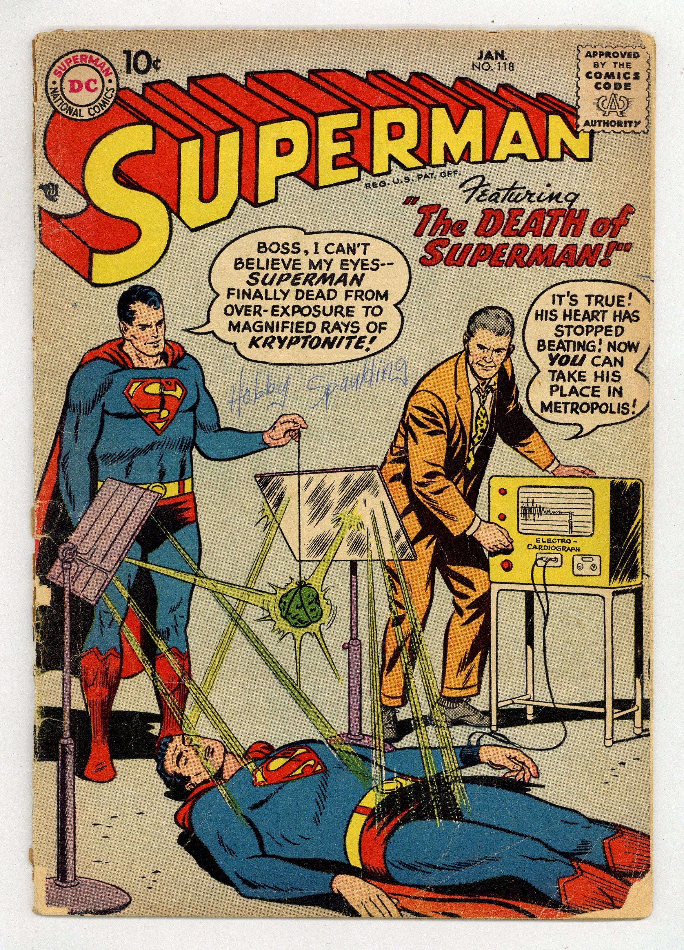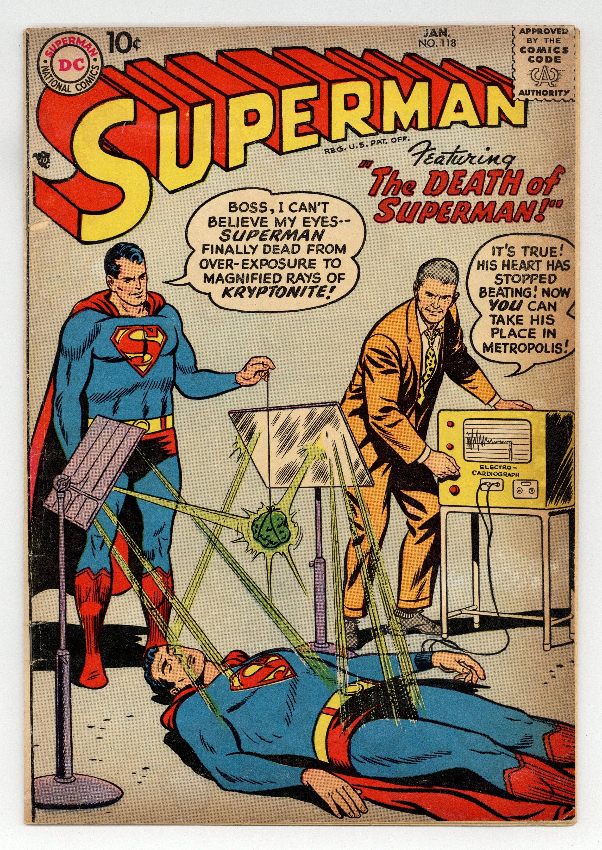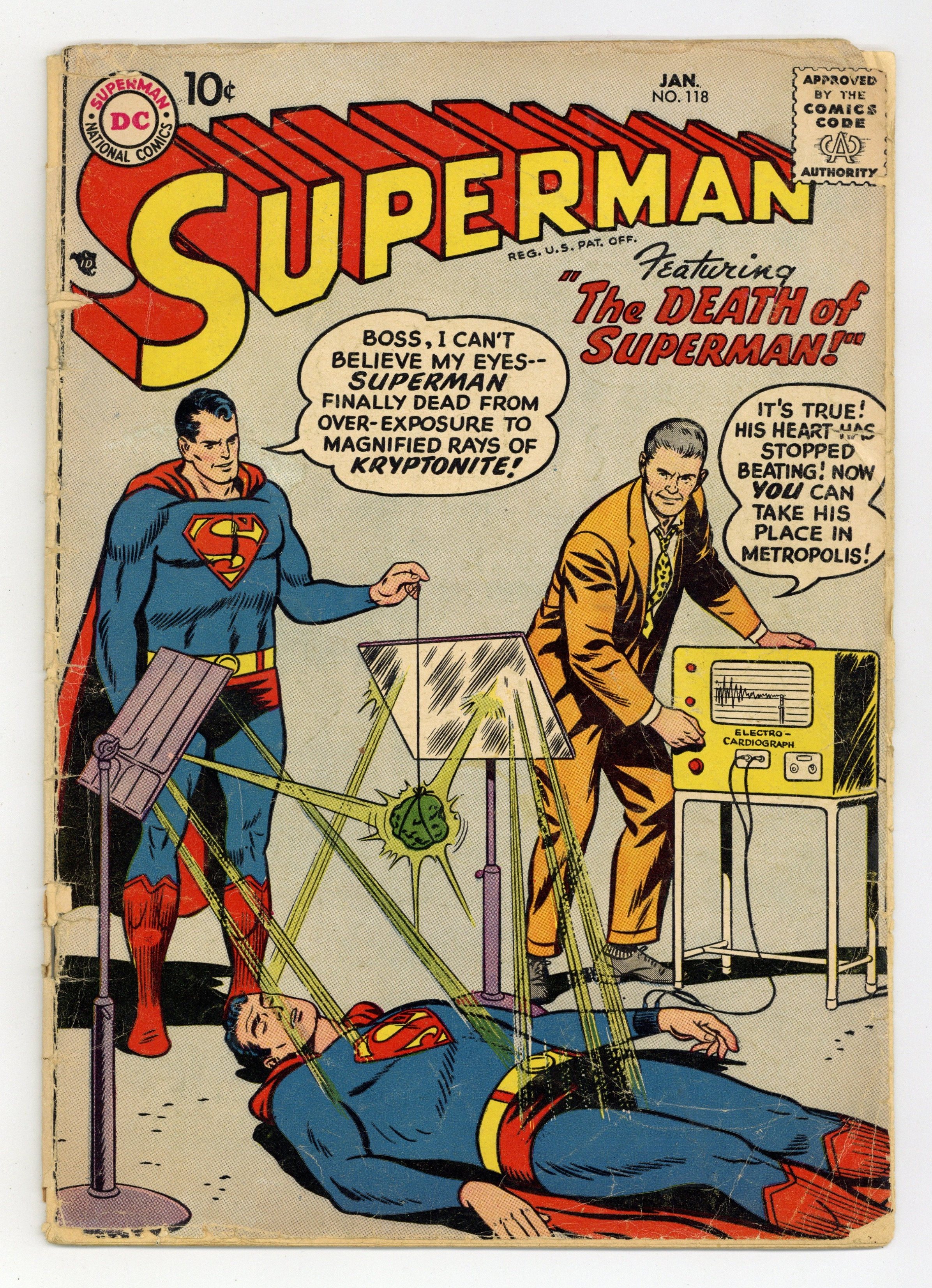 Cover pencils by Curt Swan, inks by Stan Kaye. The Prehistoric Pet, art by Al Plastino; Superman battles a fire-breathing dragon. The Boy Napoleon starring Superman, pencils by Curt Swan, inks by Ray Burnley. The Death of Superman starring Superman and Blacky Barton, art by Al Plastino; Superman apparently succumbs to Kryptonite rays. 36 Pages, Full Color. Cover price $0.10.