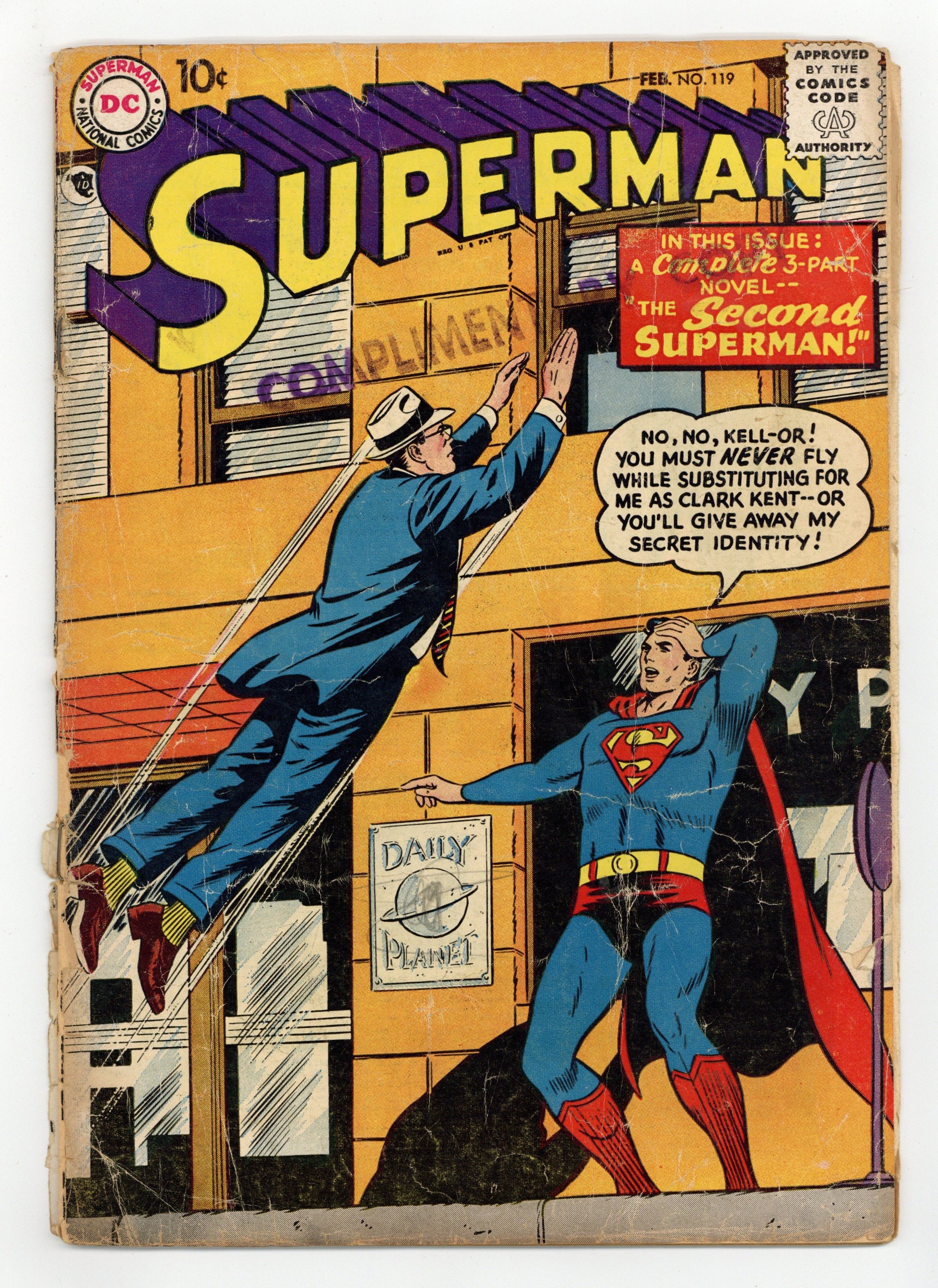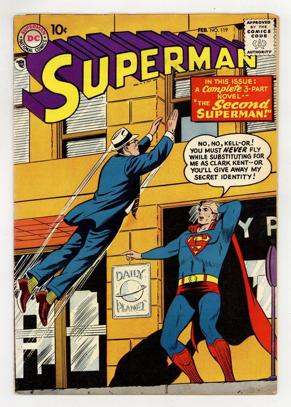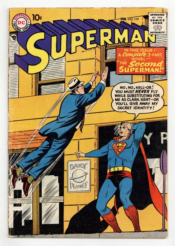 Cover pencils by Curt Swan, inks by Stan Kaye. The Second Superman: Part 1: The World That Was Krypton's Twin starring Superman, Zoll Orr, Kell-Orr, and Sparkler Staines, script by Edmond Hamilton, pencils by Wayne Boring, inks by Stan Kaye; Kell-Orr substitutes for Clark Kent. The Second Superman: Part 2: A Double For Superman. The Second Superman: Part 3: Superman's Mightiest Quest. 2nd novel length story in this title. Full-color full-page ad for Mystery in Space # 42 and Strange Adventures # 88 (gorilla cover). 36 Pages, Full Color. Cover price $0.10.
