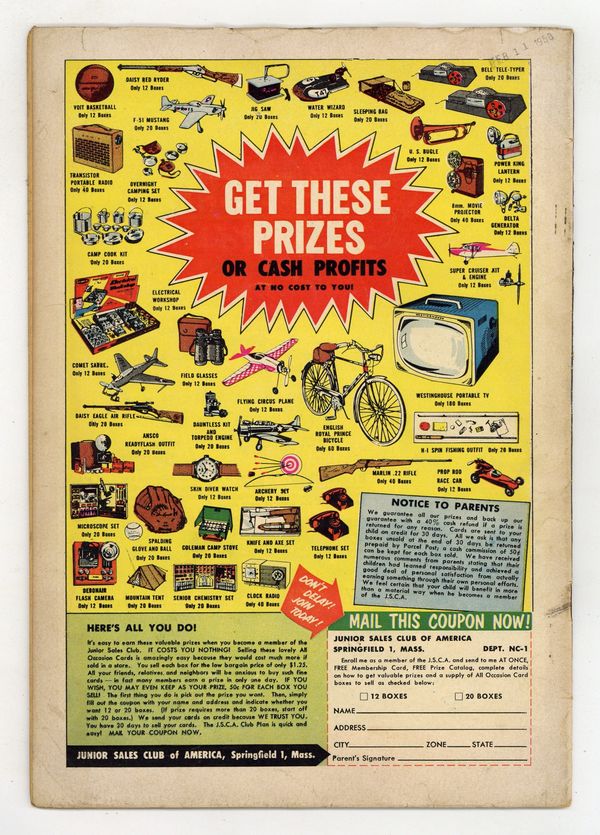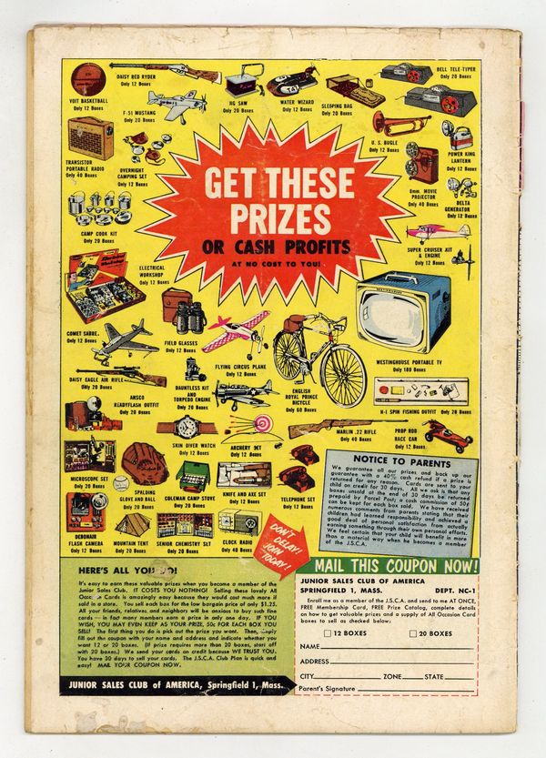 Cover pencils by Curt Swan, inks by Stan Kaye. The Day That Superman Married starring Superman and Coup Colby, art by Al Plastino. Tricksy The World's Greatest Stunt Man humor page by Henry Boltinoff. Jerry The Jitterbug humor page by Henry Boltinoff. The Super-Feats Superman Forgot starring Superman, Al Jones, and Bobby Forbes, pencils by Wayne Boring, inks by Stan Kaye. Casey The Cop humor page by Henry Boltinoff. Do Youi Know What's Behind a Law? public service announcement. The Human Missile starring Superman and Gadget Grim, art by Al Plastino. 36 Pages, Full Color. Cover price $0.10.
