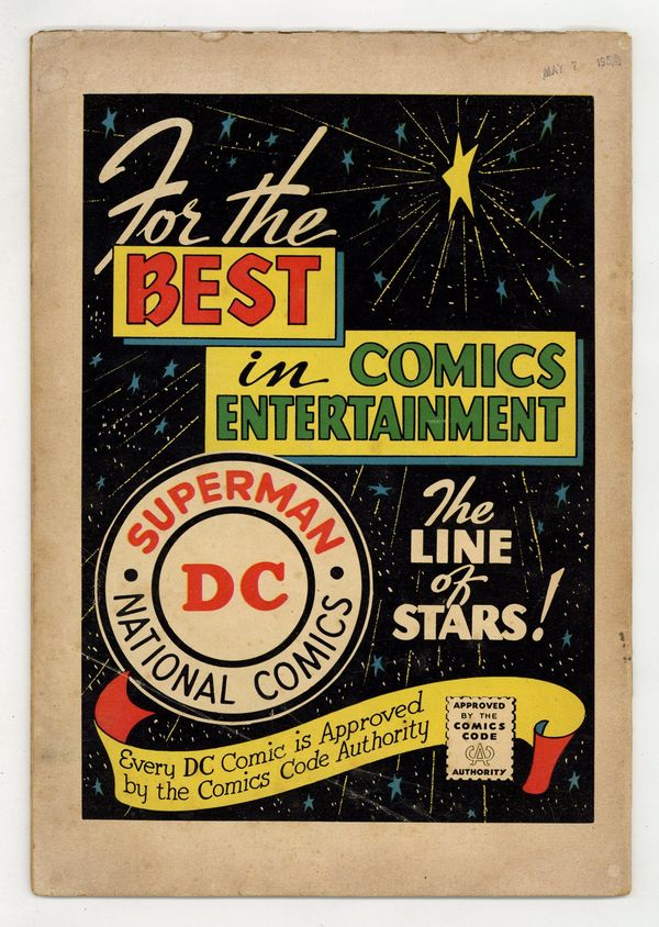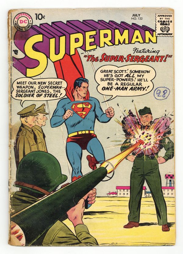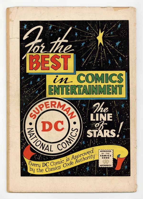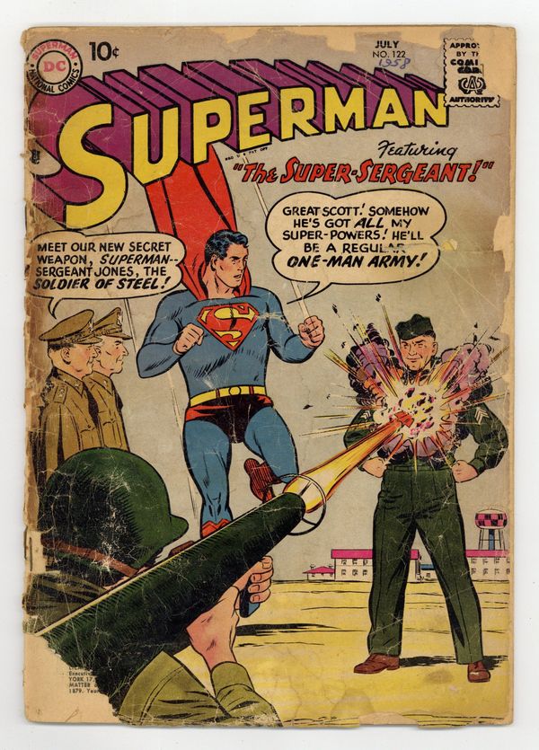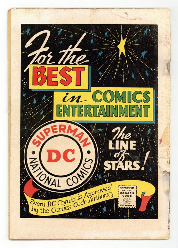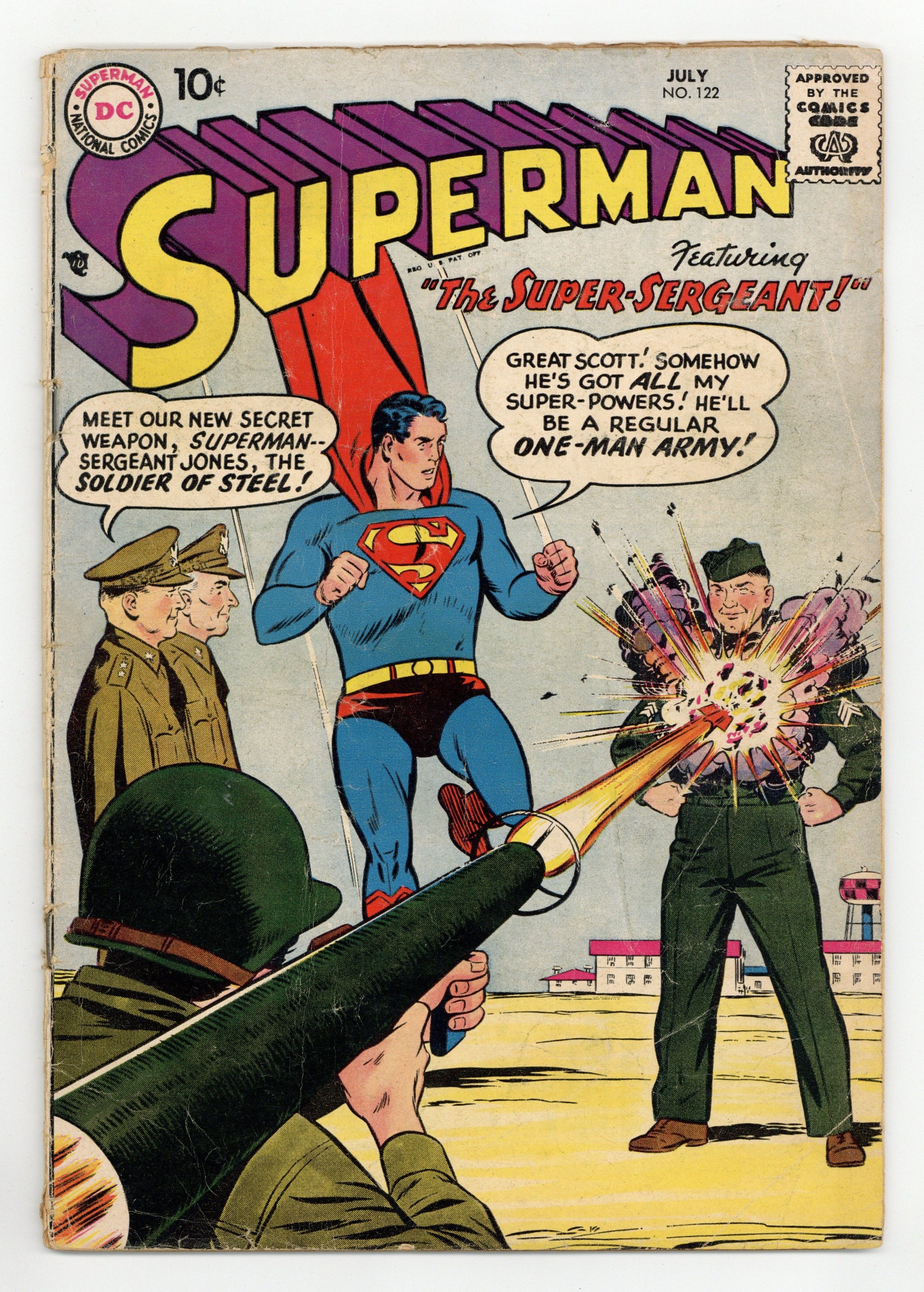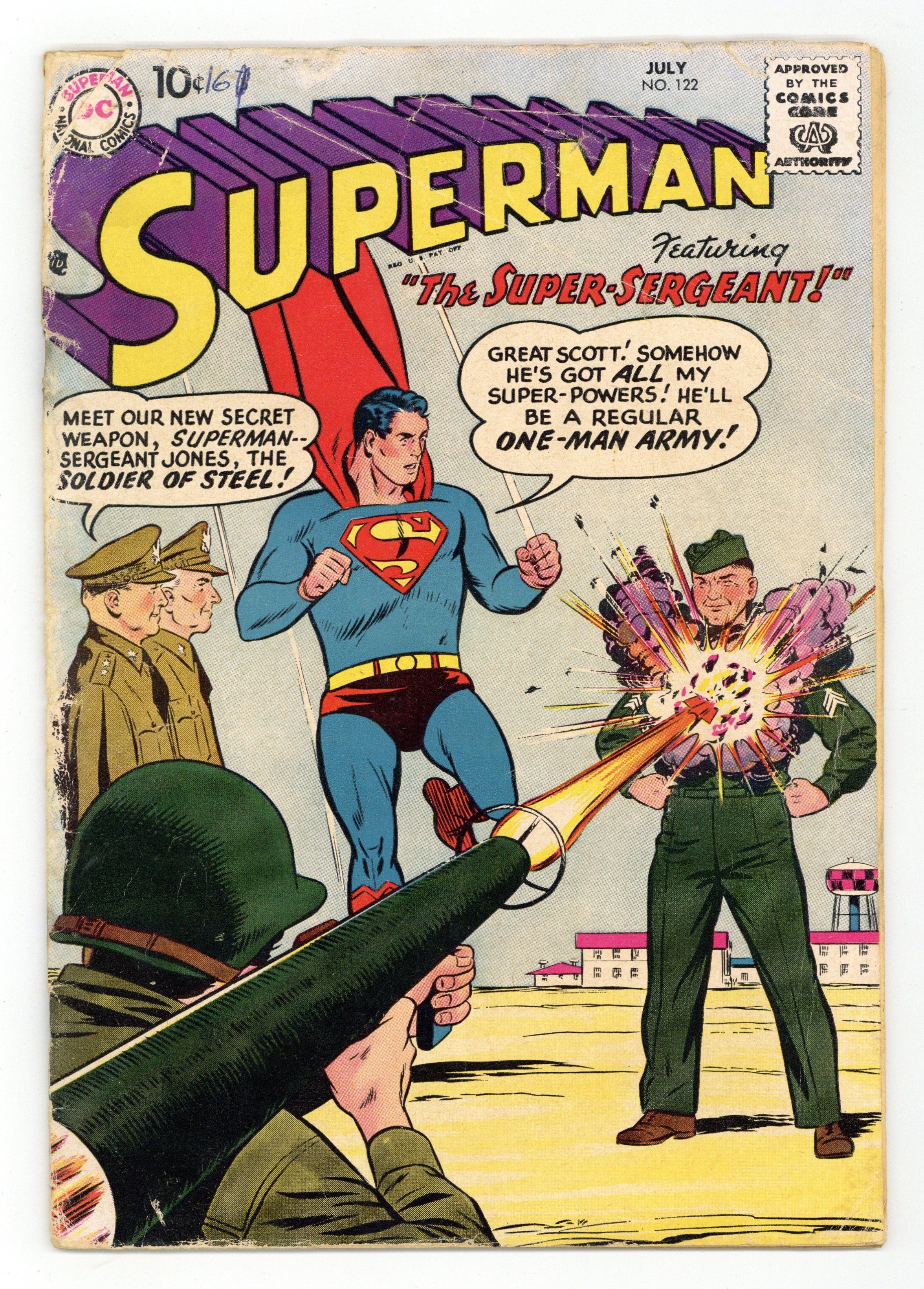 Cover pencils by Curt Swan, inks by Stan Kaye. The Secret of the Space Souvenirs, art by Al Plastino; Superman is compelled to collect trophies from space, but doesn't know why. Superman in the White House, art by Al Plastino; When Jimmy is knocked out, he dreams of what it would be like if Superman were president of the United States. The Super-Sergeant, pencils by Wayne Boring, inks by Stan Kaye; While testing a new device, Superman accidentally gives Private Jones super-powers. 36 Pages, Full Color. Cover price $0.10.