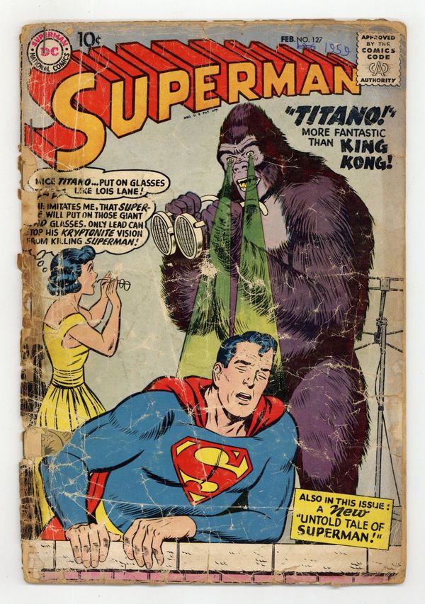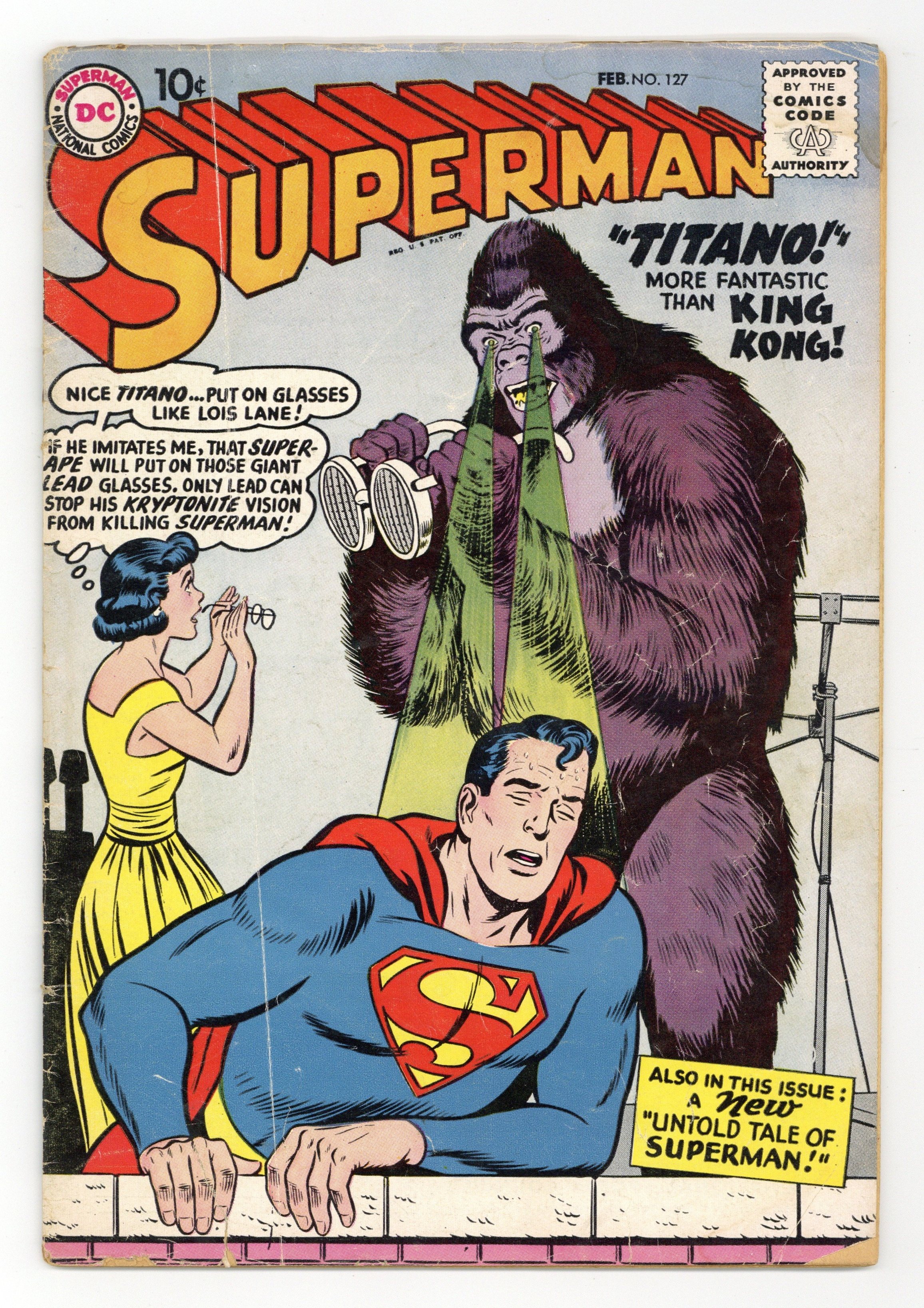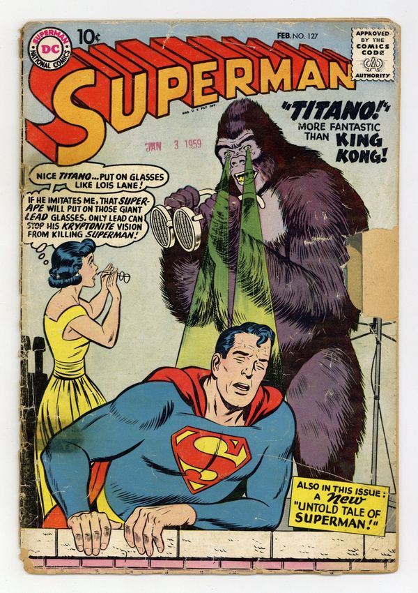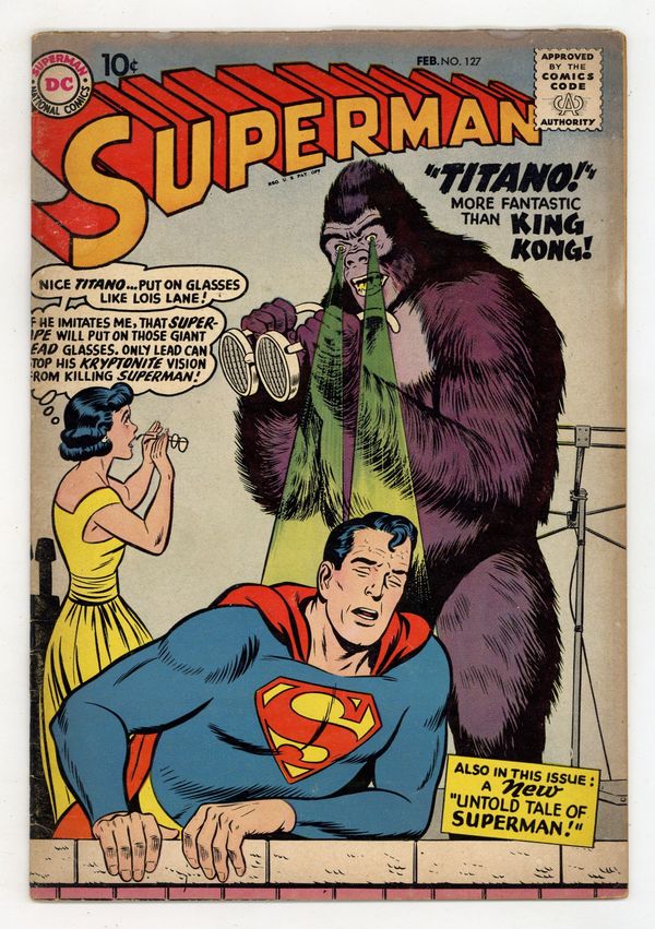 Cover pencils by Curt Swan, inks by Stan Kaye. When There Was No Clark Kent!, script by Jerry Coleman, pencils by Curt Swan, inks by Ray Burnley; Superman recalls a time when it appeared that Clark Kent had died, so he abandoned his double life and moved in with Jimmy Olsen. The Make-Believe Superman, script by Jerry Coleman, pencils by Wayne Boring, inks by Stan Kaye; Harry Winters dreads the day he is supposed to dress in the clothes in which he did his most heroic deed for his son's school because he thinks he has never done anything heroic. Titano the Super-Ape!, script by Otto Binder, pencils by Wayne Boring, inks by Stan Kaye; Lois befriends the intelligent chimp Toto just before he is sent into orbit inside a satellite. 36 Pages, Full Color. Cover price $0.10.