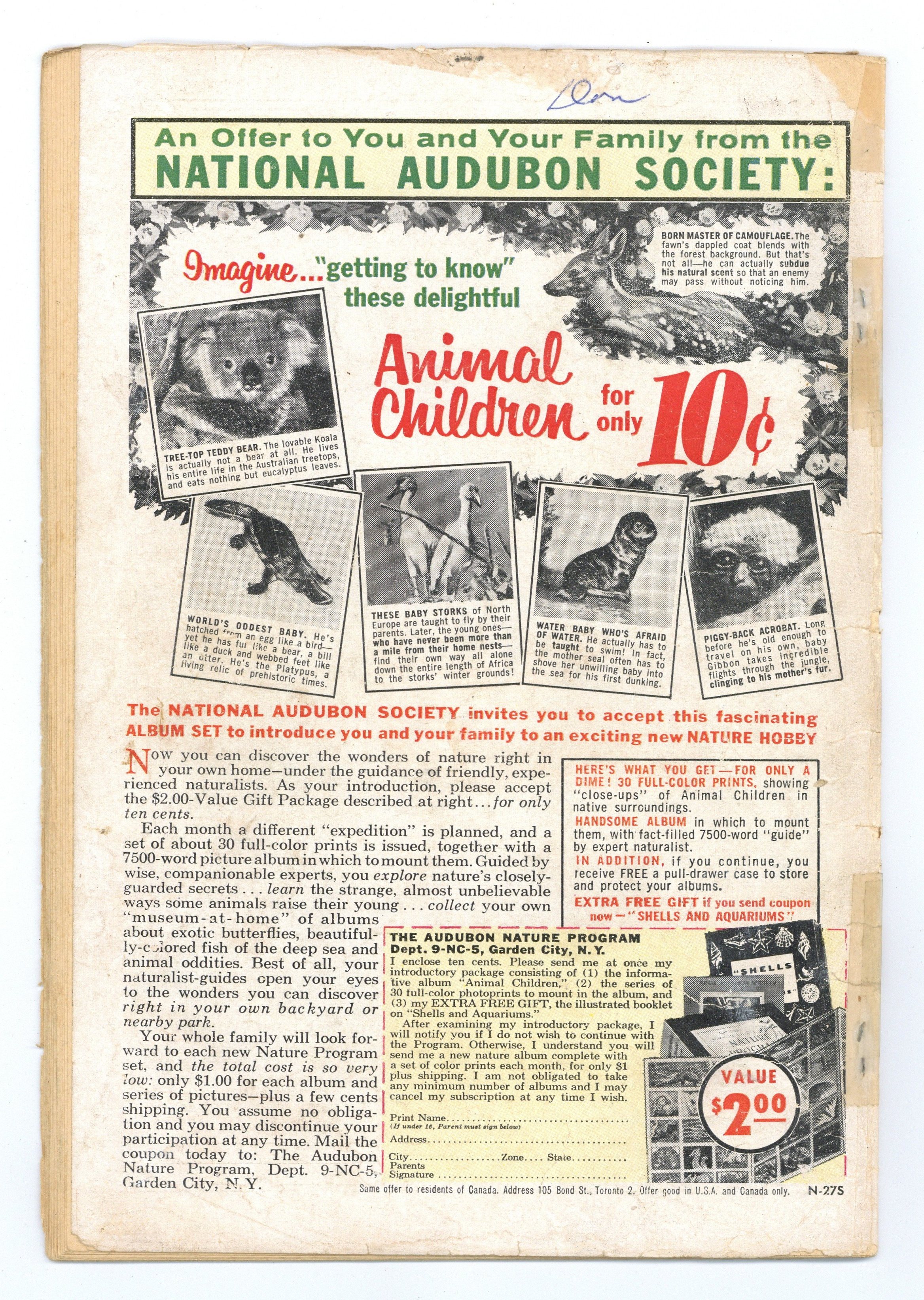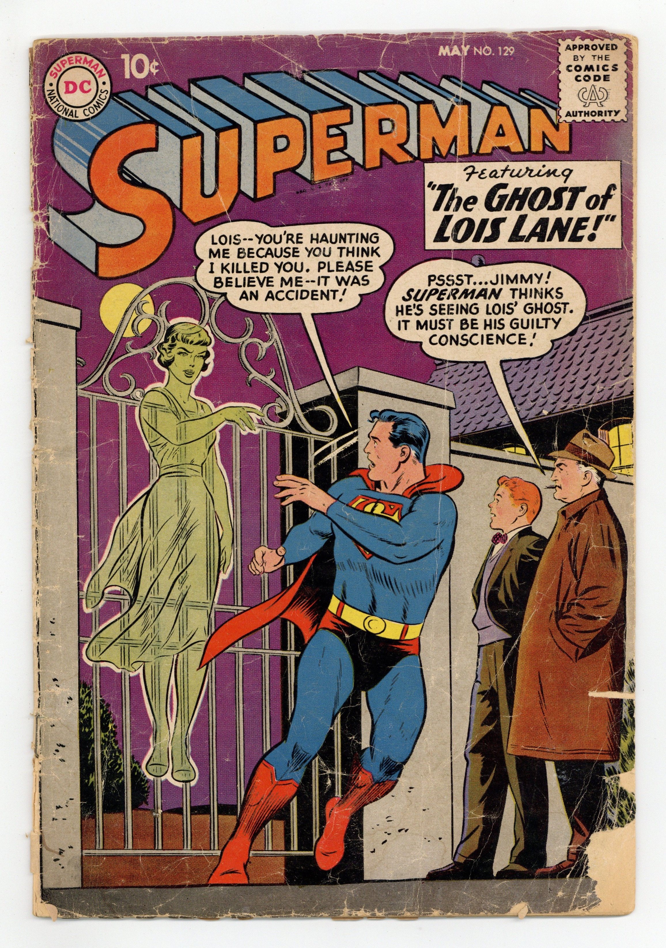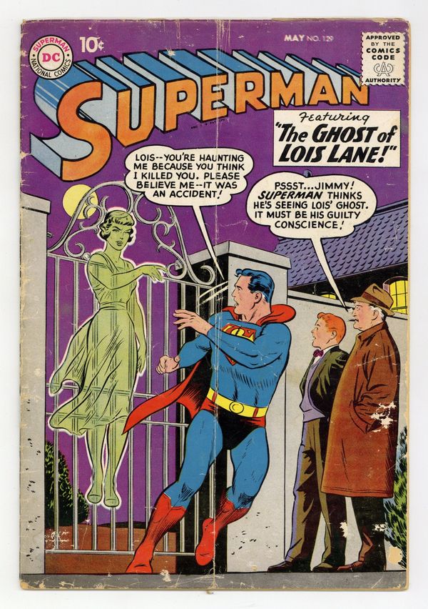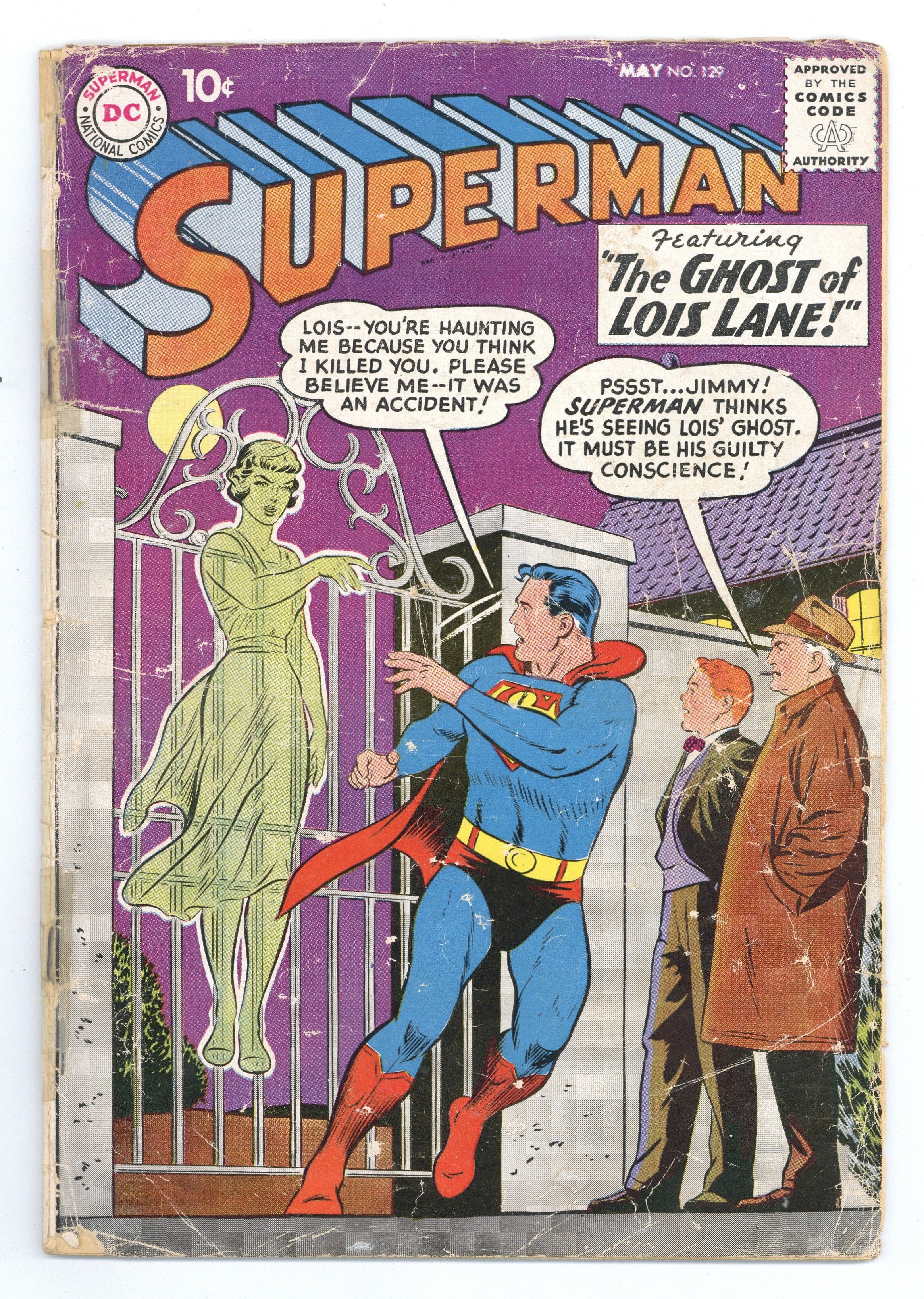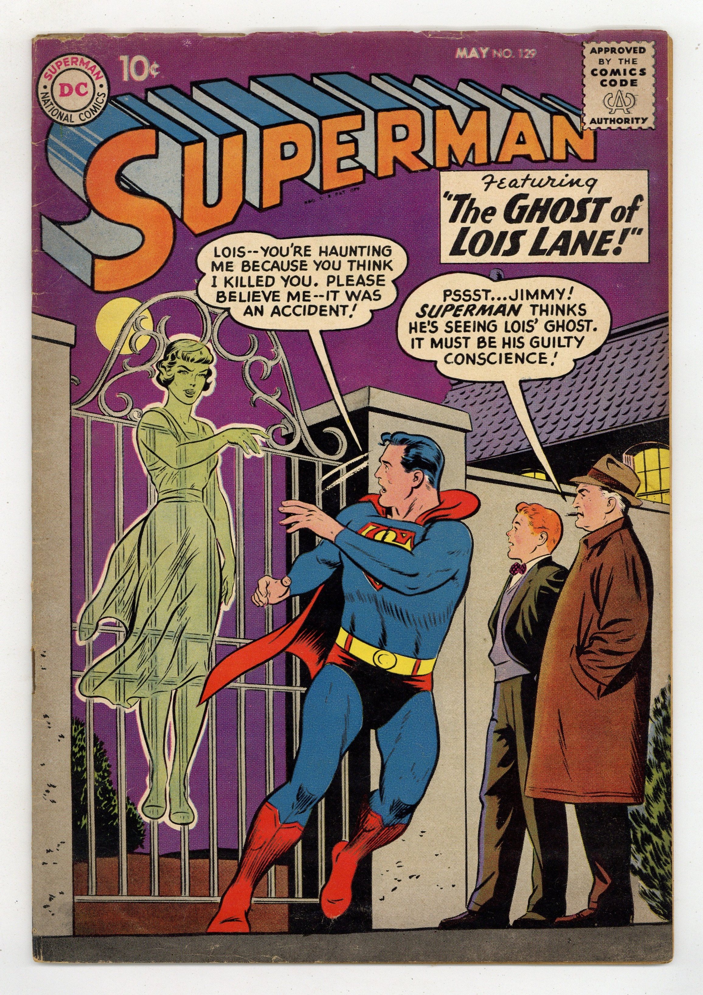 Cover pencils by Curt Swan, inks by Stan Kaye. The Ghost of Lois Lane, script by Jerry Coleman, pencils by Wayne Boring, inks by Stan Kaye; After Superman accidentally causes Professor Grail's experimental teleporter chair to explode while Lois is sitting in it with his x-ray vision, he sees visions of a ghostly Lois. Clyde Beatty and Cole Bros Circus at Palisades Amusement Park ad starring Superman. Peg humor page by Henry Boltinoff. Clark Kent, Fireman of Steel!, script by Otto Binder, art by Al Plastino; Assigned to join the fire department for a few days for a story, Clark must protect his secret identity and deal with a skeptical fire chief. Supergirl in Action Comics ad. The Girl in Superman's Past, script by Bill Finger, pencils by Wayne Boring, inks by Stan Kaye; features the first appearance and origin of Lori Lemaris, Superman's mermaid lady-friend. 36 Pages, Full Color. Cover price $0.10.