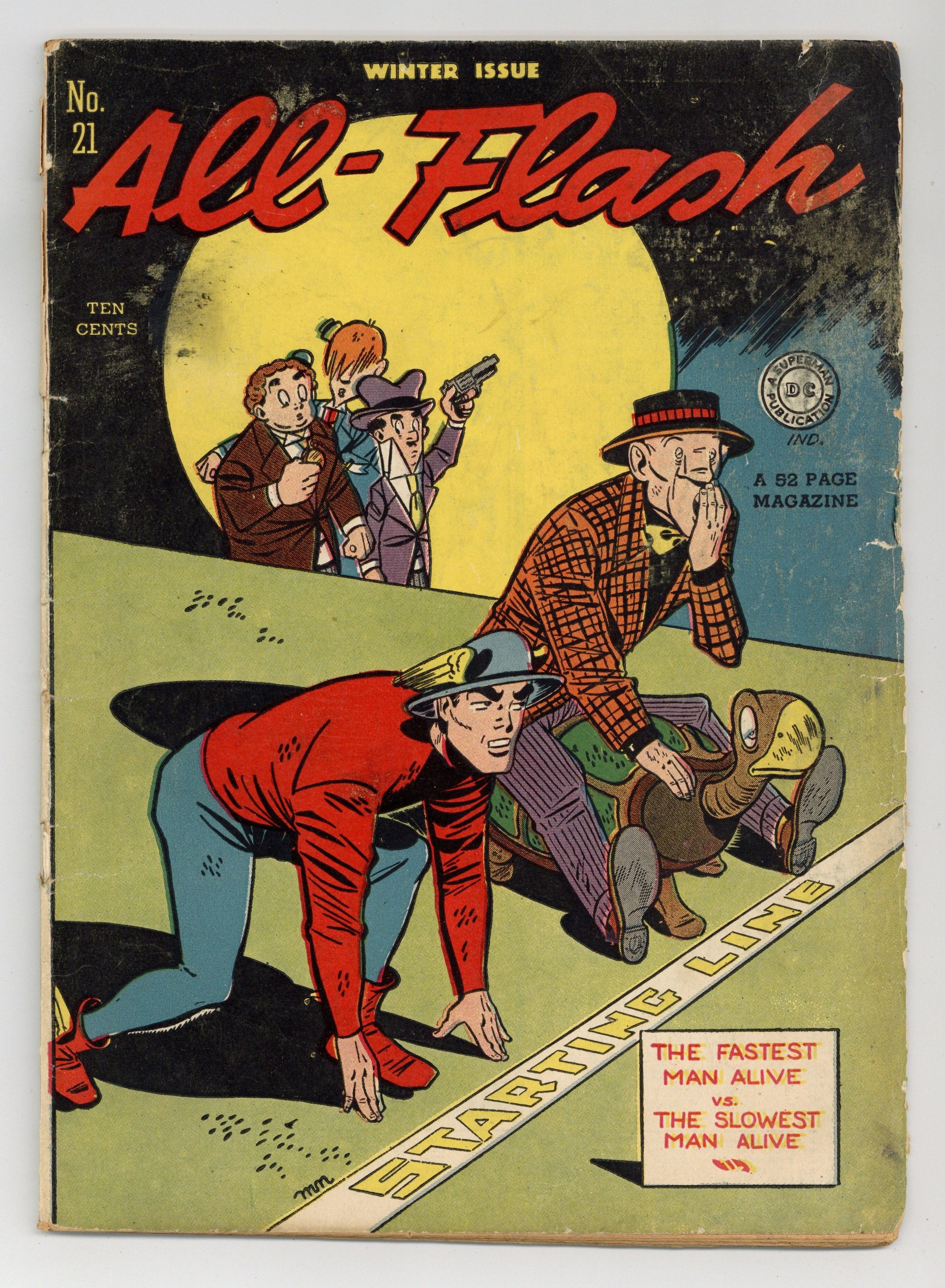 Written by Gardner F. Fox. Art and cover by Martin Naydel. Monk Holmes has discovered an ancient Indian ceremonial fire that has the odd ability to turn worthless scrap metal into solid gold. The Three Dimwits learn some mighty erroneous ideas from the Turtle, a new villain that contends the slower you commit a crime, the more successful it will be! Mutt and Jeff humor story by Al Smith (as Bud Fisher). 52 Pages, Full Color. Cover price $0.10.