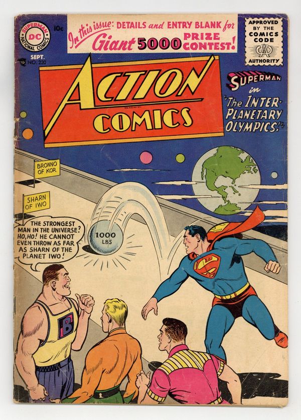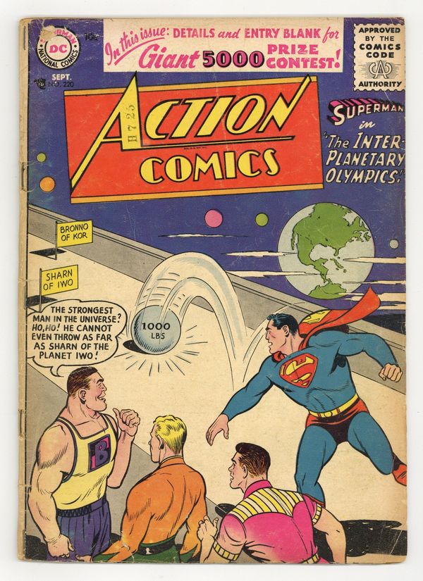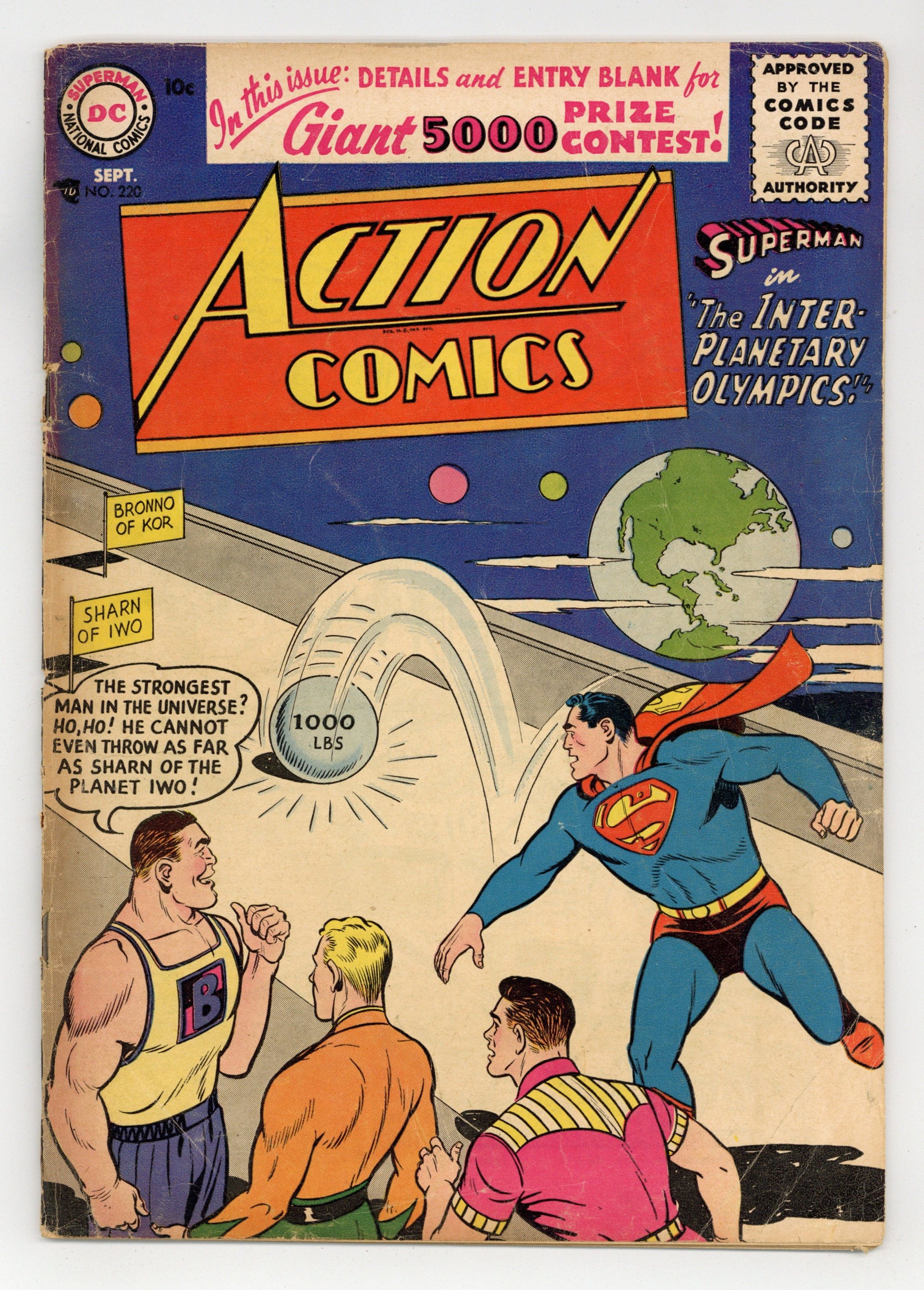 Cover by Al Plastino. "The Interplanetary Olympics," art by Al Plastino; Superman is drawn to an alien world and invited to take part in an Interplanetary Olympics. -page Shorty story by Henry Boltinoff. "Congo Bill, Stone Age Man" starring Congo Bill starring Janu the Jungle Boy, art by Howard Sherman. One-page Jerry the Jitterbug story by Henry Boltinoff. School For Cowboys article by Raymond Perry. "The Flying Dutchman of Space" starring Tommy Tomorrow, script by Otto Binder, art by Jim Mooney. 36 Pages, Full Color. $.10 Cover price $0.10.