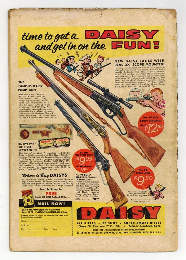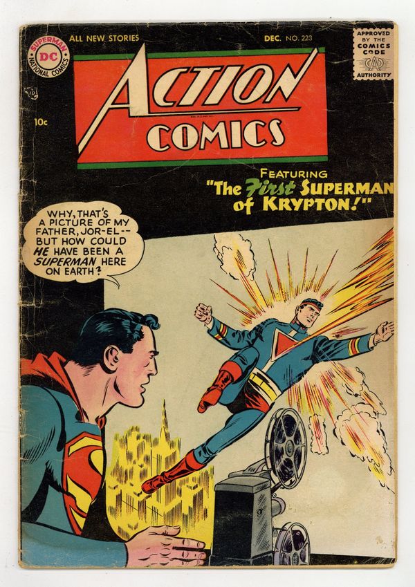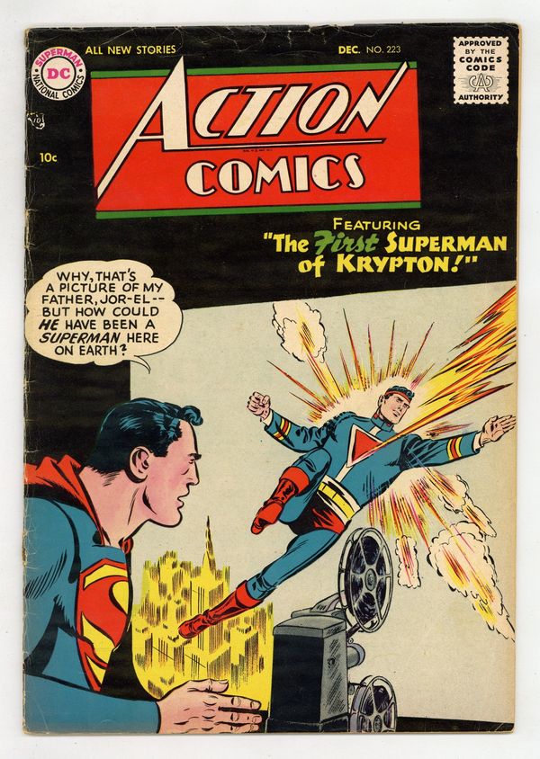 Cover pencils by Wayne Boring, inks by Stan Kaye. "The First Superman of Krypton," script by Edmond Hamilton, pencils by Wayne Boring, inks by Stan Kaye; Superman discovers a lead box in space containing another journal of Jor-Els and some films which he made; When he reads the journal and views the films, he learns how Jor-El first discovered evidence of Kryptons coming destruction shortly before Kal-Els birth on the 10,000th year of Kryptons civilization; Superman realizes his father was the first "superman" of Krypton, and silently promises to use his powers only in the cause of righteousness. "Janu, Jungle God" starring Congo Bill, script by Jack Miller, art by Howard Sherman. "How To Start A Stamp Collection" article by Jack Miller (as Joe Mallon), art by Raymond Perry. "The Amazing Future Toys," script by Otto Binder, art by Jim Mooney; Tommy Tomorrow vs. Nova Norton. 36 Pages, Full Color. $.10 Cover price $0.10.