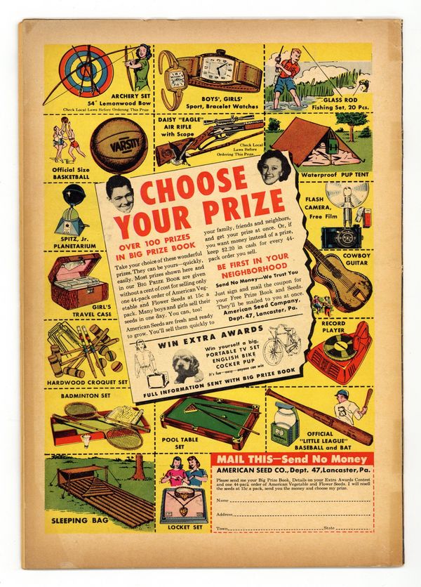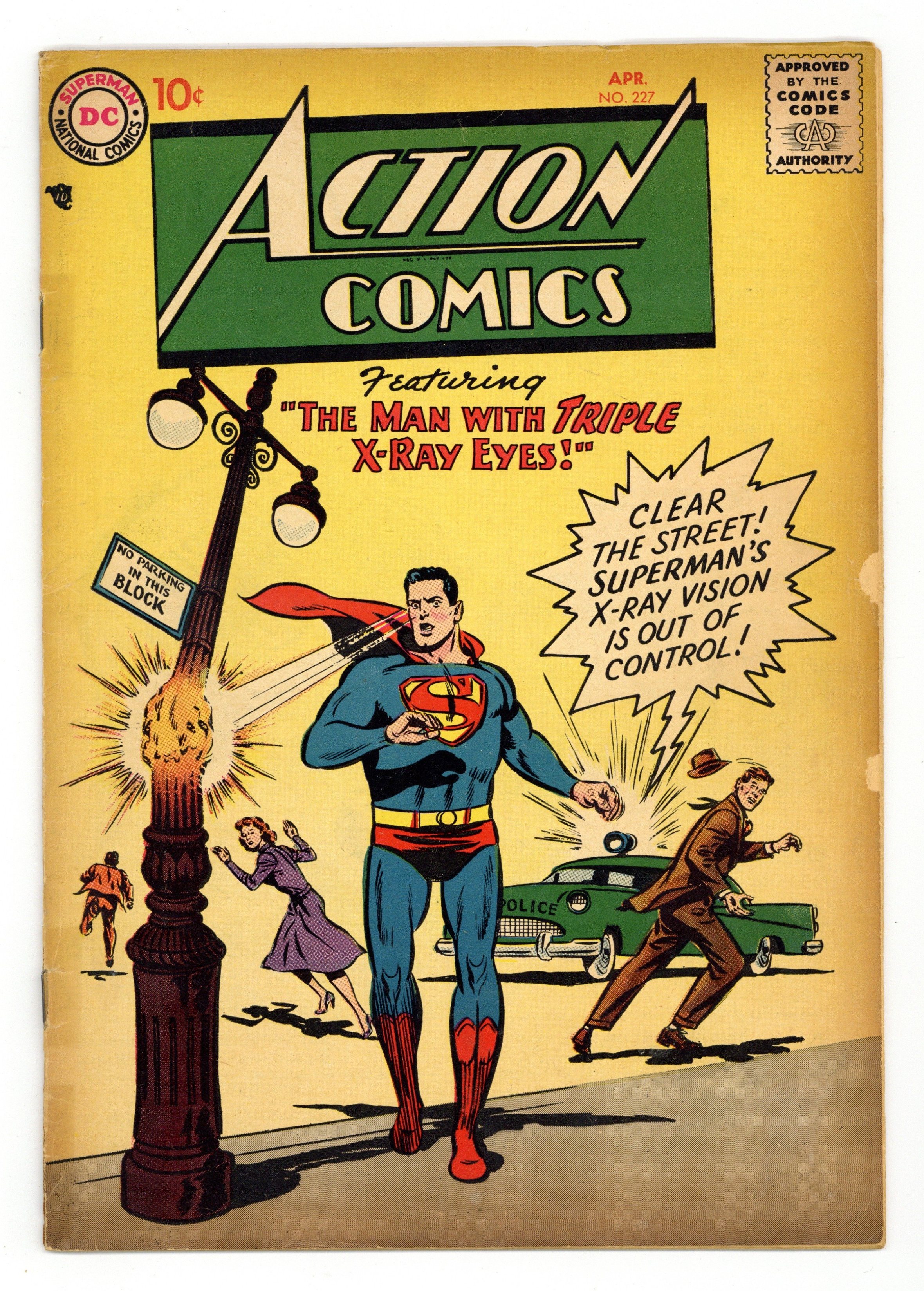 Cover pencils by Wayne Boring, inks by Stan Kaye. "The Man with the Triple X-Ray Eyes," pencils by Wayne Boring, inks by Stan Kaye; An occurrence in space causes Superman to lose control of his X-ray vision, making him burn up anything he looks at. "The Great Jungle Animal Count" starring Congo Bill, art by Howard Sherman. 2/3-page Varsity Vic story by Henry Boltinoff. Strange Road under the Sea article. "The Girl Planeteer" starring Tommy Tomorrow, script by Otto Binder, art by Jim Mooney.36 Pages, Full Color. $.10 Cover price $0.10.
