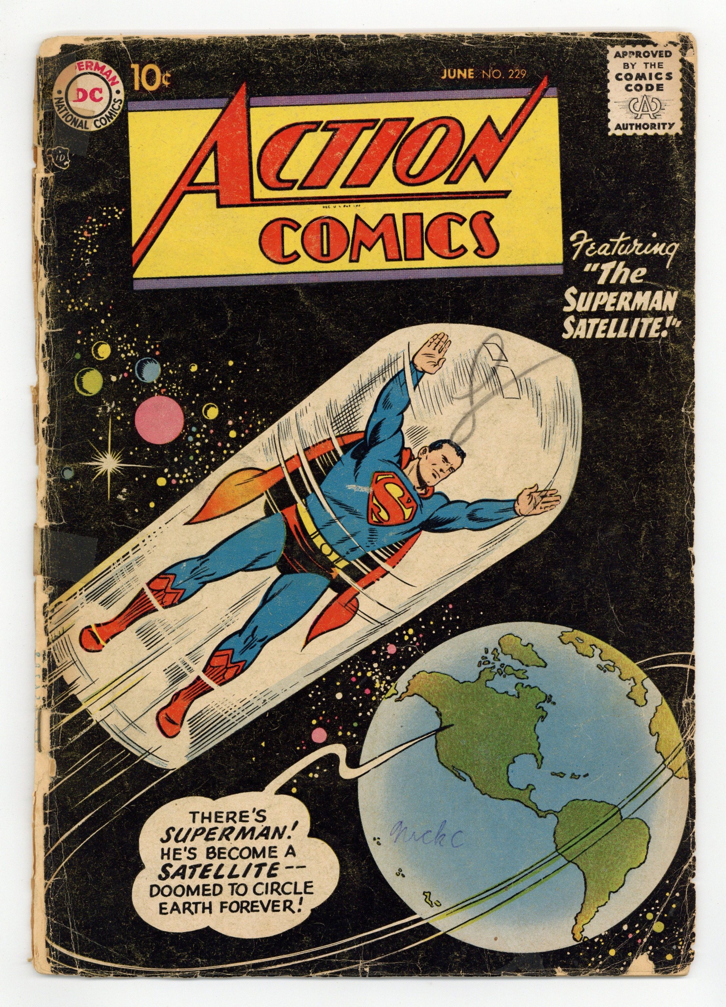 Cover by Al Plastino. "The Superman Satellite," script by Edmond Hamilton, pencils by Wayne Boring, inks by Stan Kaye; After destroying an asteroid in space, Superman is informed that he has become poisonous and that he must never touch the Earth again. "The Great Jungle Swindle" starring Congo Bill and Janu the Jungle Boy, script by Jack Miller, art by Nick Cardy. Half-page Varsity Vic story by Henry Boltinoff. Games That Save Lives article. "The Milky Way Hunt," script by Otto Binder, art by Jim Mooney. 36 Pages, Full Color. $.10 Cover price $0.10.