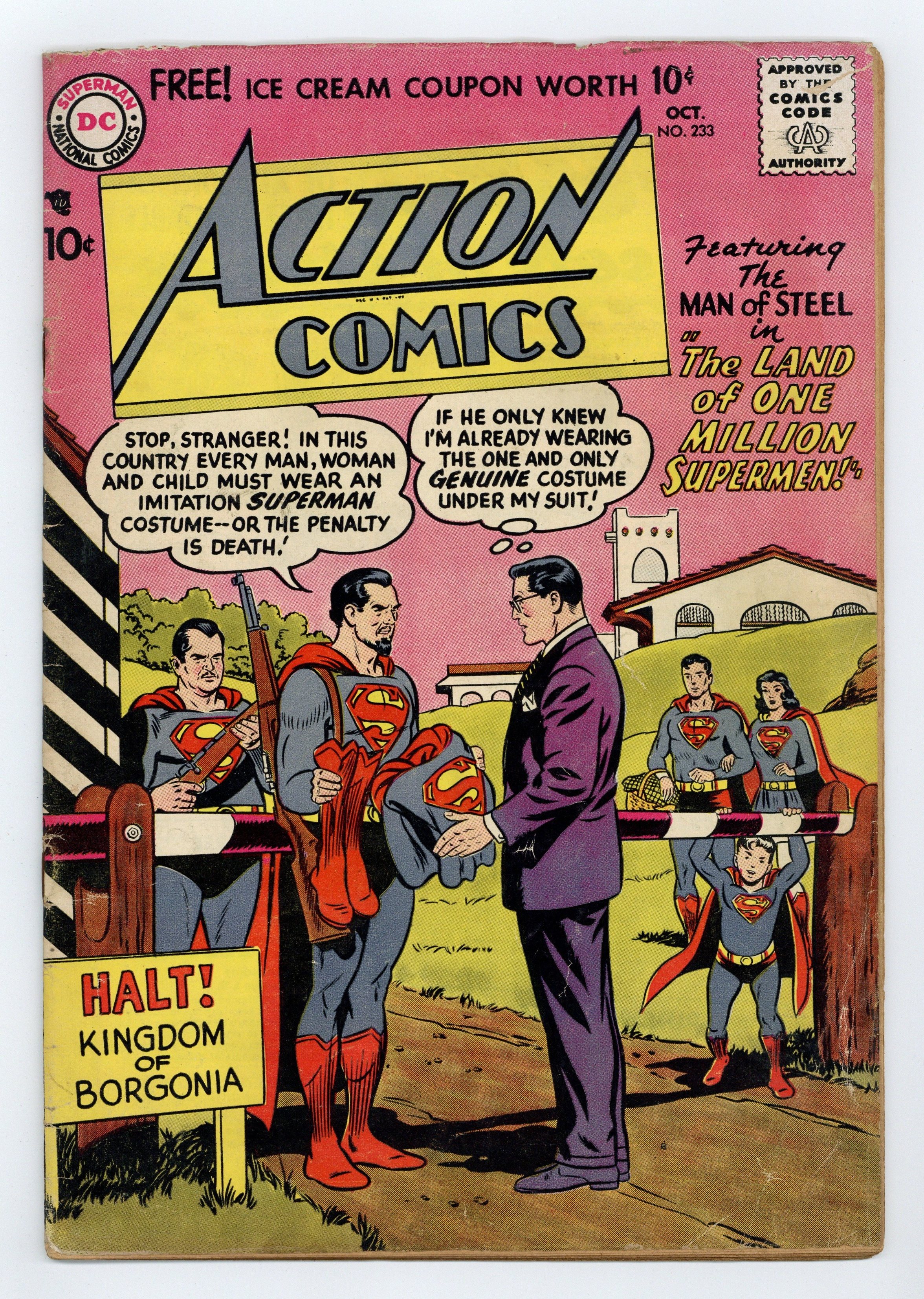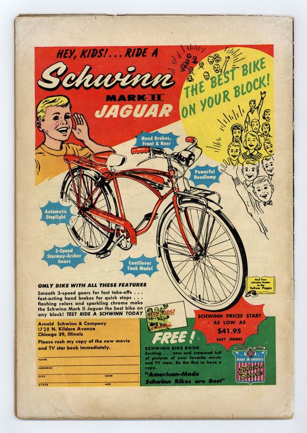 Tags: Superman$110.00Cover pencils by Curt Swan, inks by Stan Kaye. "The Land of A Million Supermen," script by Jerry Coleman, pencils by Wayne Boring, inks by Stan Kaye; When Clark Kent is accidentally stranded in the nation of Borgonia, he discovers that everyone there, including himself, must wear a Superman costume on pain of death... which is a giant trap the dictator of Borgonia has set for the real Superman. "The Jungle Eskimo" starring Congo Bill, art by Howard Sherman. So, You Want to Be an Engineer text story. "The Forbidden Robots," script by Otto Binder, art by Jim Mooney; Tommy and Brent stop the transport of smuggled forbidden robots. 36 Pages, Full Color. $.10 Cover price $0.10.