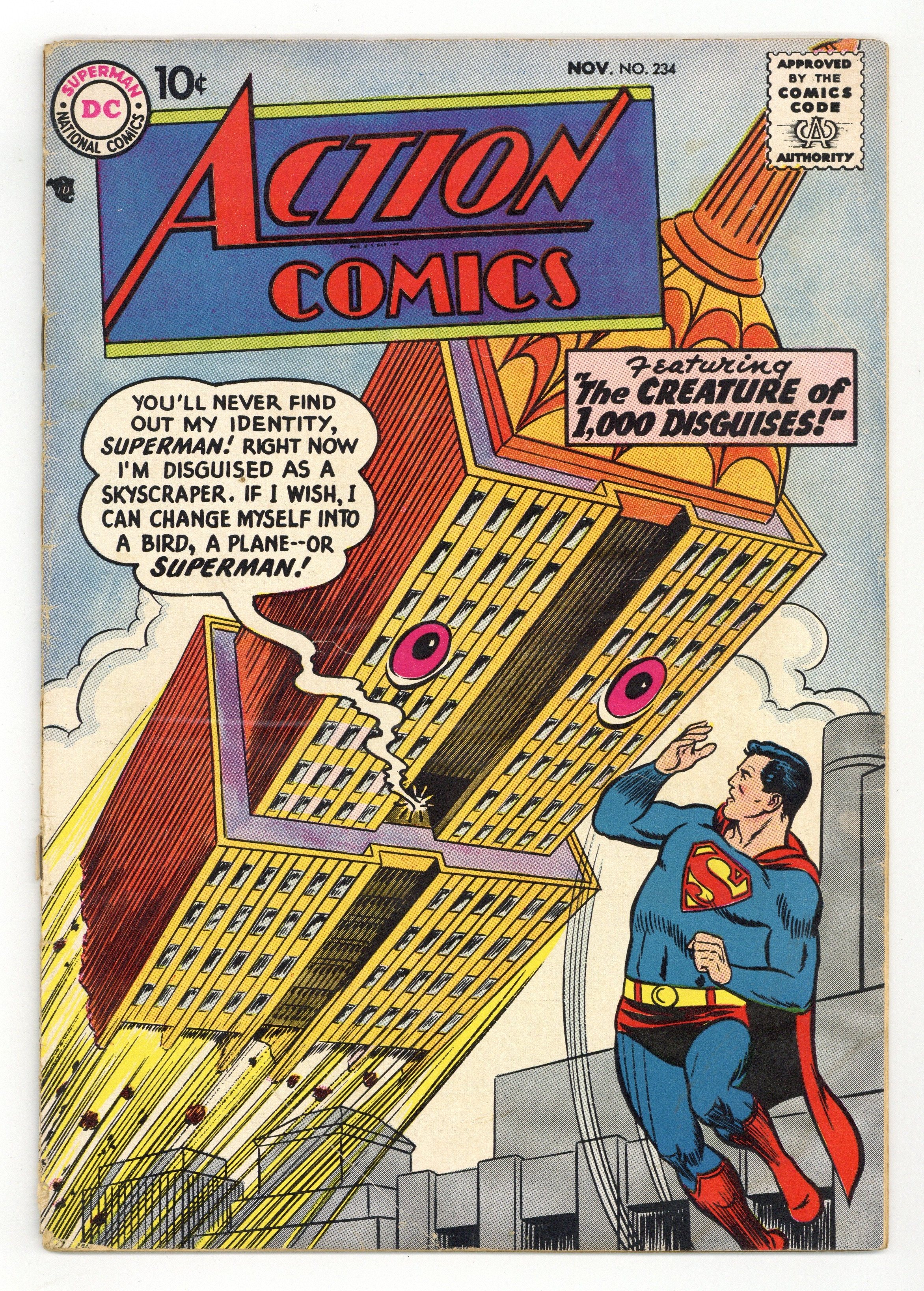 Cover pencils by Curt Swan, inks by Stan Kaye. "The Creature of 1,000 Disguises," script by Edmond Hamilton, pencils by Wayne Boring, inks by Stan Kaye; An alien from the planet Zar named Gollo comes to Earth and befriends a runaway boy named Johnny Miles; Superman finds the boy and brings him home to his parents; Missing his friend, Gollo begins searching all throughout Metropolis trying to find him. He uses his mysterious alien powers to assume a variety of disguises; Superman encounters Gollo and realizes his connection to Johnny Miles. "The Robot Animals" starring Congo Bill, script by Robert Bernstein, art by Howard Sherman. The First Baseball Game article. Casey the Cop two-page story by Henry Boltinoff. "The Interplanetary Hitchhiker" starring Tommy Tomorrow, script by Otto Binder, art by Jim Mooney. 36 Pages, Full Color. $.10 Cover price $0.10.