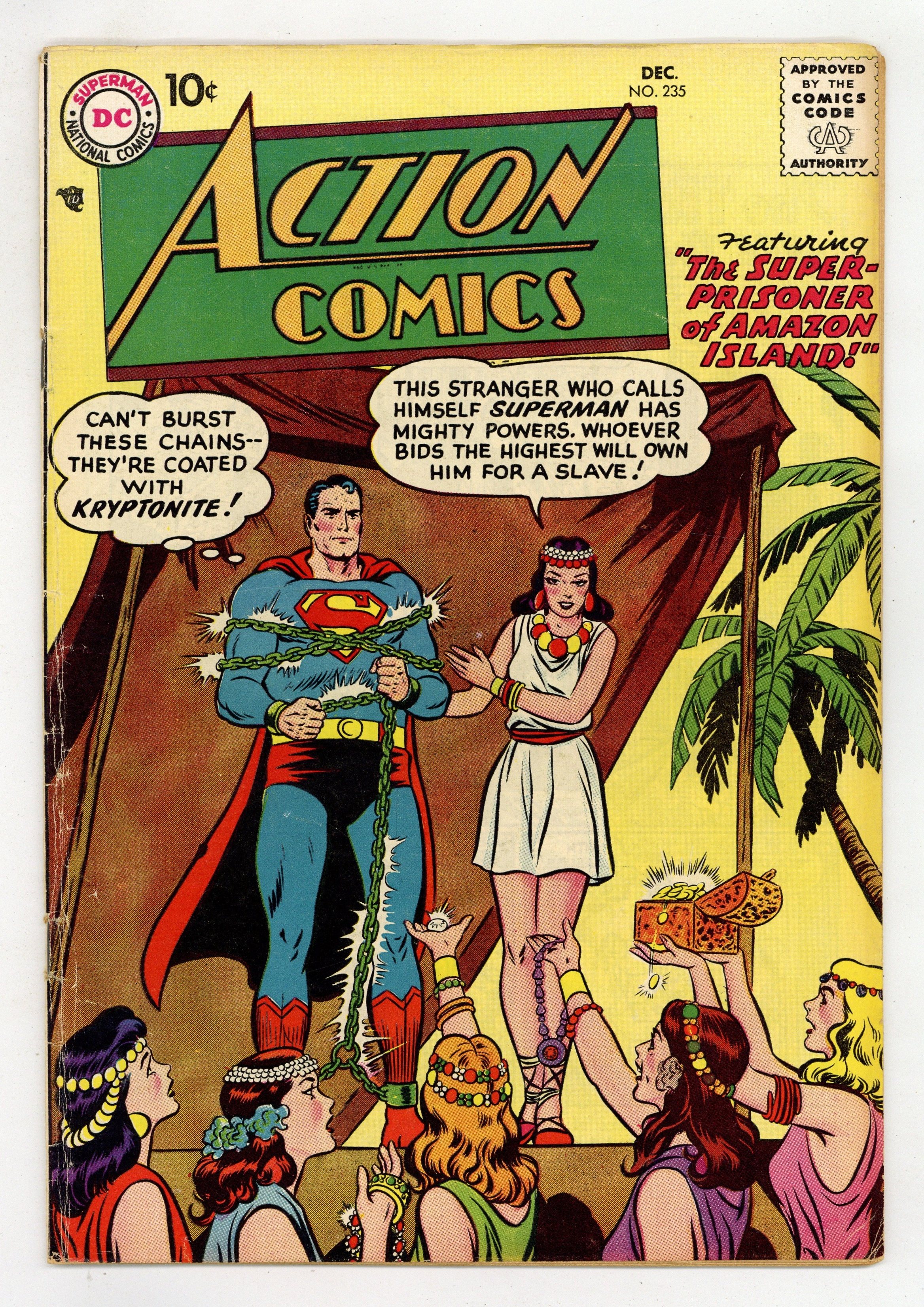 Starts Dec 8 Cover pencils by Curt Swan, inks by Stan Kaye. "The Super-Prisoner of Amazon Island," script by Otto Binder, pencils by Wayne Boring, inks by Stan Kaye; Lois belongs to a club of women whose lives have been saved by Superman, and while on a cruise, the club is marooned on an island ruled by Amazon warriors; Superman comes to save them but by Amazon custom he must perform various tasks dreamed up by the women or marry the one at whose task he fails. "Interplanetary Joy Ride" starring Tommy Tomorrow, script by Otto Binder, art by Jim Mooney. "Secret of the Giant Idol" starring Congo Bill, art by Howard Sherman. 36 Pages, Full Color. $.10 Cover price $0.10.