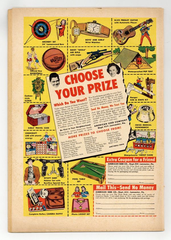 Starts Dec 8 Cover pencils by Curt Swan, inks by Stan Kaye. "Superman's New Face," script by Edmond Hamilton, pencils by Wayne Boring, inks by Stan Kaye; Superman is caught in an atomic explosion and afterwards must bandage his face, or wear a lead mask, to keep anyone from seeing what happened to him. One-page Tricksy the World's Greatest Stunt Man story by Henry Boltinoff. "The Puzzle of the Jungle Pyramid!" starring Congo Bill, art by Howard Sherman. Untitled Jerry the Jitterbug story by Henry Boltinoff. Untitled Casey the Cop story by Henry Boltinoff. "The Toys That Stopped Space Crime" starring Tommy Tomorrow, script by Otto Binder, art by Jim Mooney. 36 Pages, Full Color. $.10 Cover price $0.10.