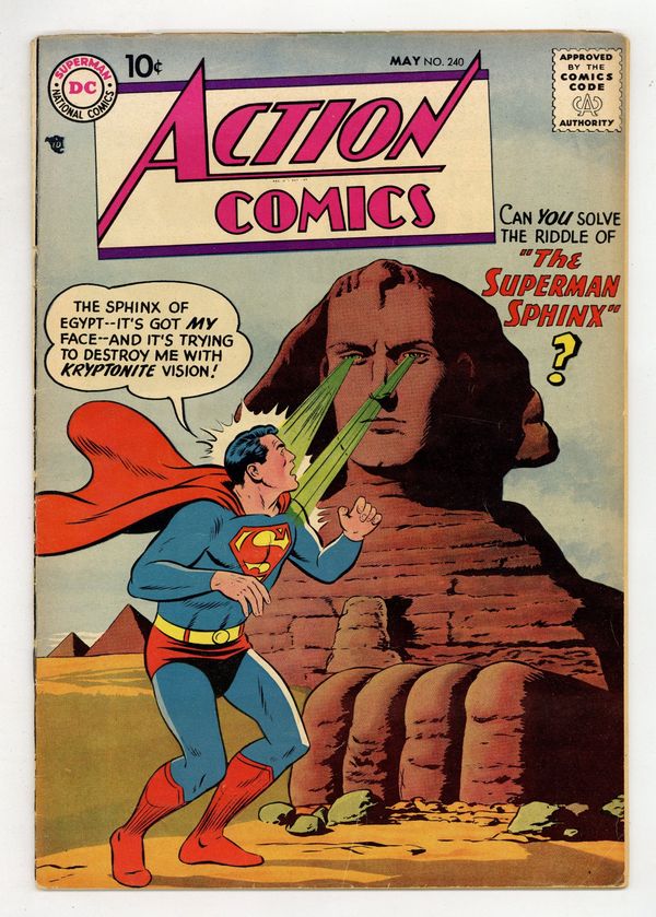 Cover pencils by Curt Swan, inks by Stan Kaye. "The Secret of the Superman Sphinx," script by Otto Binder, pencils by Wayne Boring, inks by Stan Kaye; Lois discovers a Clark Kent robot in a closet at the Daily Planet, and a strange Sphinx with a Superman head and kryptonite vision goes into orbit around the Earth. One-page Ollie story by Henry Boltinoff. "The Trial of Tommy Tomorrow," script by Otto Binder, art by Jim Mooney; Tommy is on trial for the murder of Brent Wood. One-page Animal Wonderland cartoon by Martin Naydel. "Trapped in the Insect World" starring Congo Bill, art by Howard Sherman. 36 Pages, Full Color. $.10 Cover price $0.10.