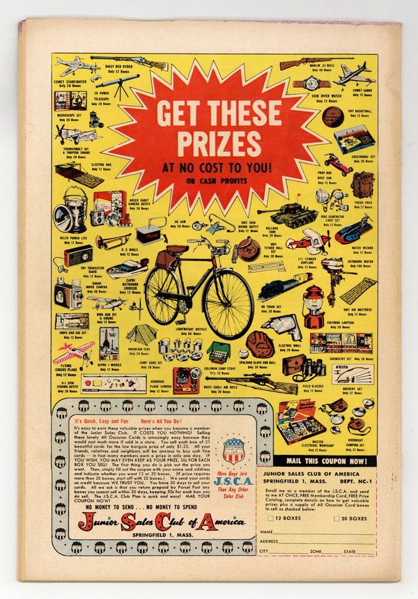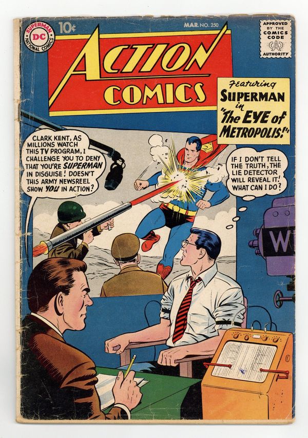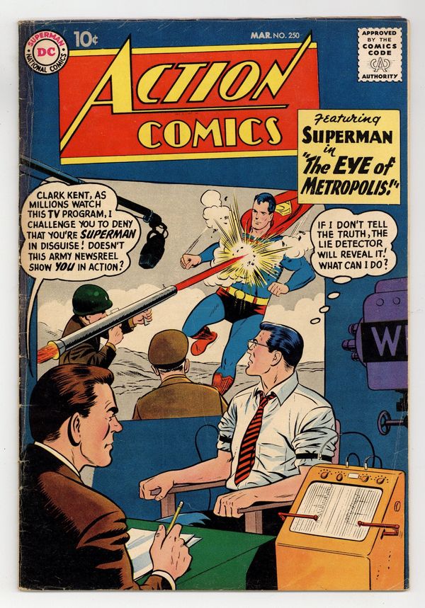 Cover pencils by Curt Swan, inks by Al Plastino. "The Eye of Metropolis!", script by Bill Finger, pencils by Wayne Boring, inks by Stan Kaye; John Bates has Clark Kent appear on his TV show "The Eye of Metropolis" in order to expose his double life as Superman. "The Boy Planeteer" starring Tommy Tomorrow, script by Otto Binder, art by Jim Mooney; 5 1/2 year old Dikky Hale joins the Planeteers and demonstrate a "sixth sense," knowing when disasters are going to strike before the Planeteers do; But Tommy quickly realizes Dikky is not who he appears. Superman of America ad. "The Dunce of the Jungle" starring Congorilla, art by Howard Sherman. 36 Pages, Full Color. $.10 Cover price $0.10.