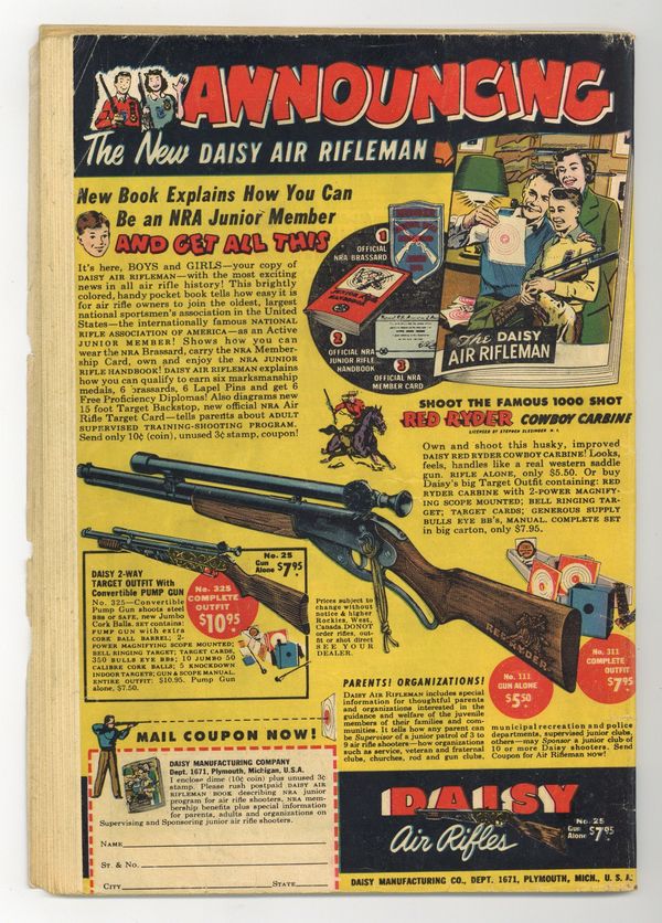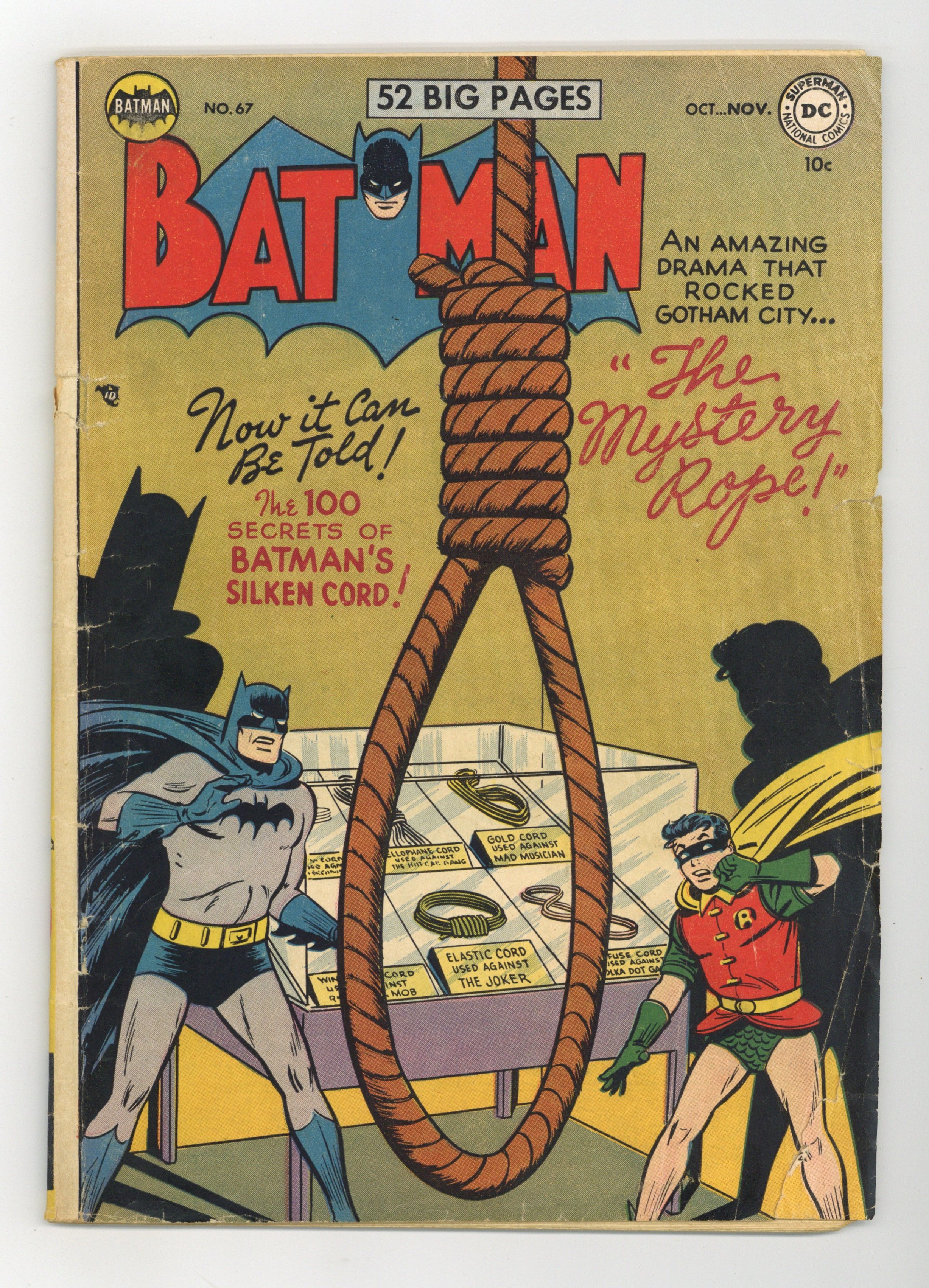 Cover by Win Mortimer. Lost--A Free Education public service announcement featuring Leave It to Binky, script by Jack Schiff, art by Bob Oksner. "The Mystery Rope!", script by David Vern, pencils by Bob Kane (Batman and Robin figures only) and Lew Sayre Schwartz, inks by Charles Paris; A criminal who is superstitious about the number seven escapes from prison; The Gotham Historical Society asks Batman to donate one of his Batropes. -page Private Pete story by Henry Boltinoff. "The Man Who Wrote the Joker's Jokes!", script by David Vern, pencils by Bob Kane (Batman and Robin figures only) and Lew Sayre Schwartz, inks by Charles Paris; The Joker decides hires gag writers to invient crime ideas that would make fools of Batman and Robin; Joker kidnaps Robin and forces Batman to write a plan for him. The Kings of Sport article by Barbara Fairbanks (as F. Banks), art by Raymond Perry. "The Lost Legion of Space," script by Bill Finger, pencils by Dick Sprang, inks by Charles Paris; Inspired by archival footage of the original Dynamic Duo, Brane Taylor and his nephew adopt their identities in the year 3051; The new Robin soon breaks his leg while fighting the henchmen of the evil Yerka. One-page Jerry the Jitterbug story by Henry Boltinoff. 52 Pages, Full Color. Cover price $0.10.