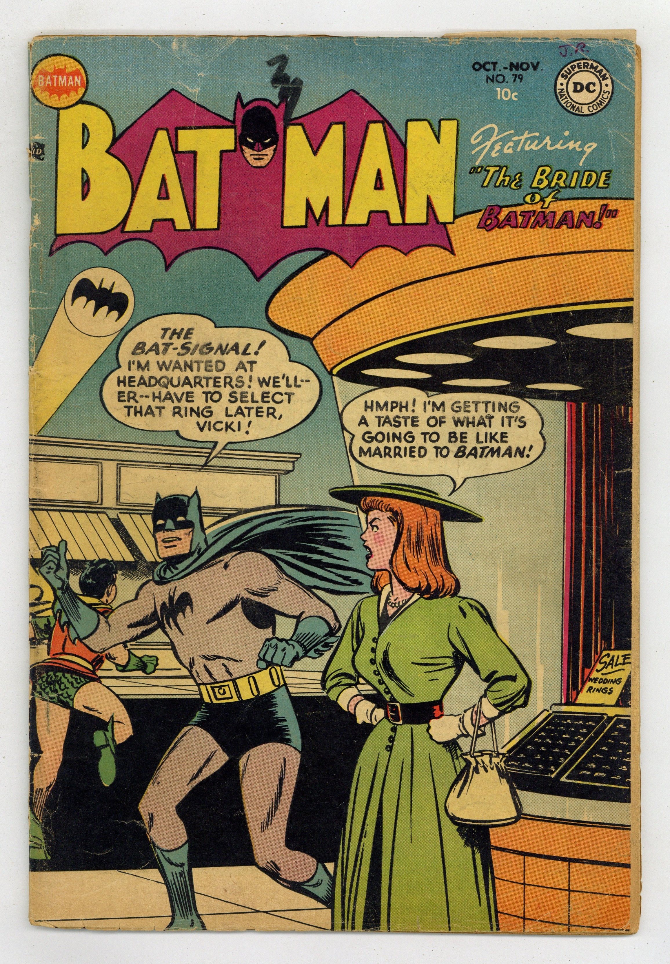 Cover by Win Mortimer. "Bride of Batman!", script by David Vern, pencils by Dick Sprang (as Bob Kane), inks by Charles Paris; When the Shah of a foreign nation wants Vicki as his wife, she gets out of it (or so she thinks) by announcing that she is secretly engaged to Batman! Give Your Pet All the Breaks! public service announcement with Binky, script by Jack Schiff, art by Win Mortimer. "The Batman of Yesterday!", script by Bill Finger, pencils by Bob Kane (Batman and Robin figures only) and Lew Sayre Schwartz, inks by Ray Burnley; A criminal claims to have recovered a long lost treasure of gold; Batman and Robin ask Professor Nichols to send them back in time to the Gotham of 1753, where they meet with Captain Lightfoot. One-page Casey the Cop story by Henry Boltinoff. "Grand Jury" text story by Jack Miller. One-page Casey the Cop story by Henry Boltinoff. "Batman--Gang Boss!", script by Bill Finger, pencils by Dick Sprang, inks by Charles Paris; Batman and Robin are escorting a prisoner transport when their plane crashes on what appears to be a deserted island; But the island is controlled by the murderous pirate Lars Veking, and Batman and Robin find unexpected brothers-in-arms in the form of the prisoners they are escorting. One-page Jerry the Jitterbug story by Henry Boltinoff. 44 Pages, Full Color. Cover price $0.10.