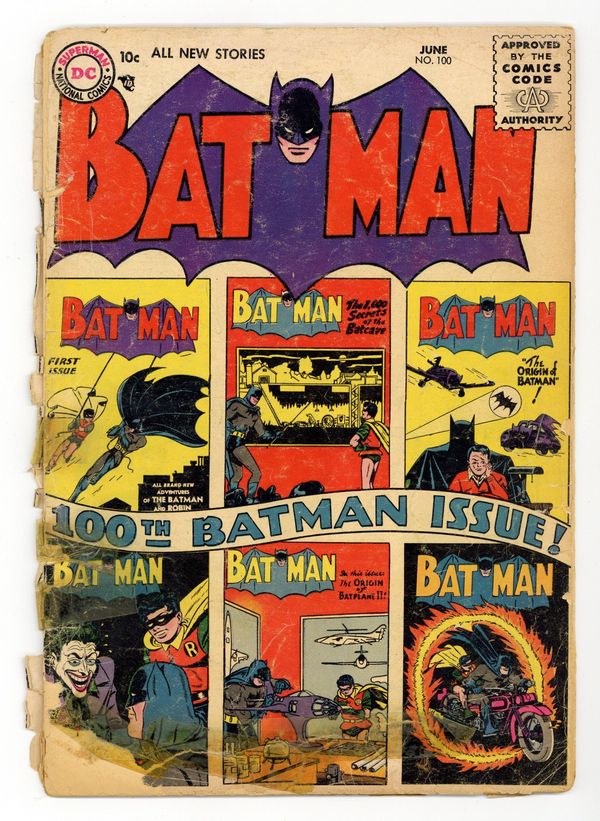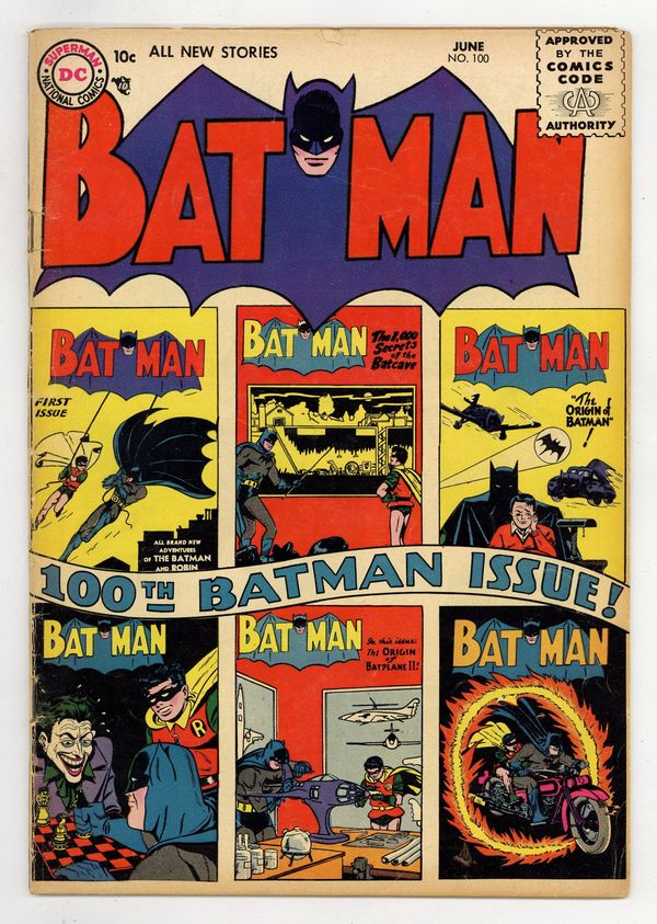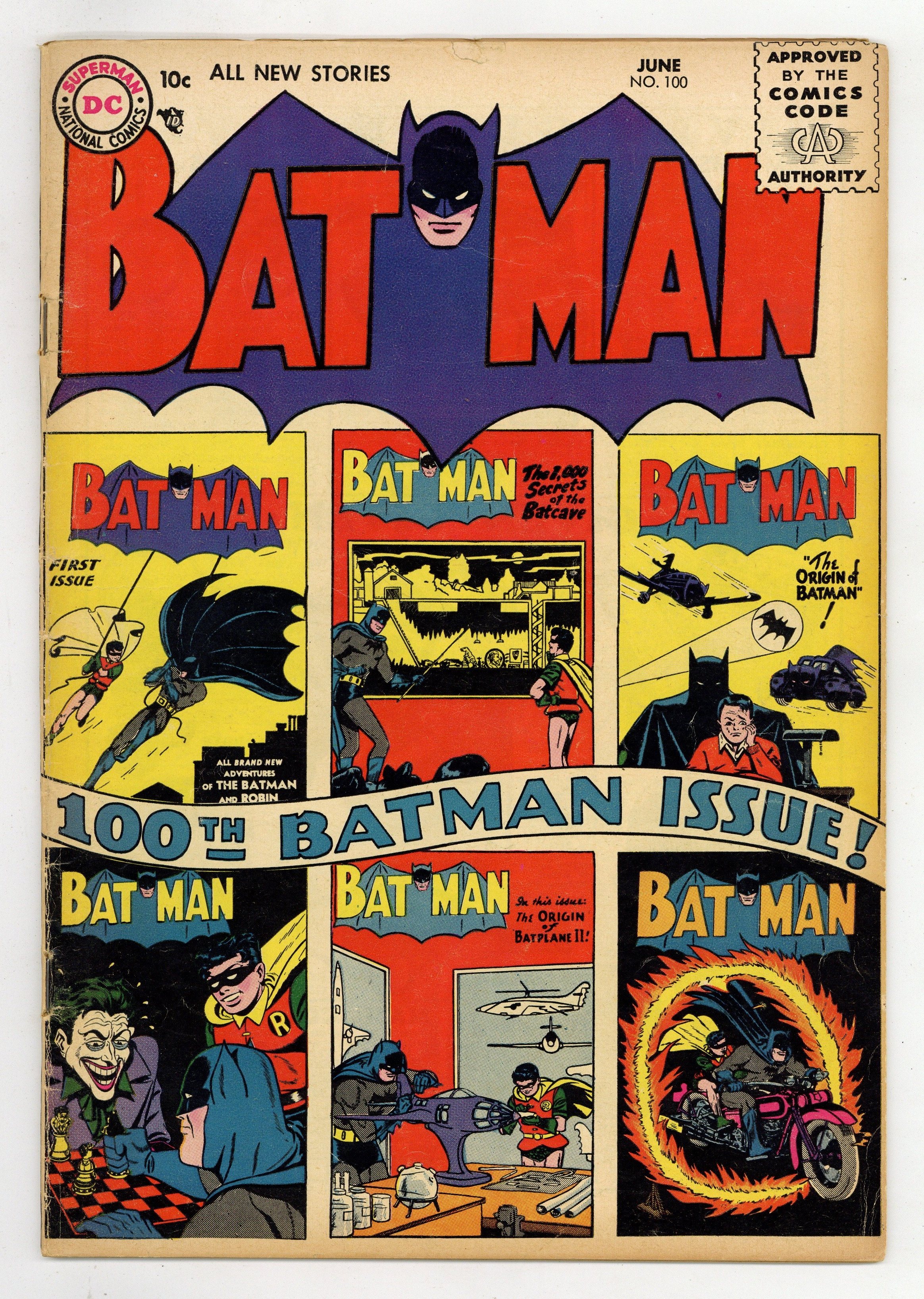 This is the hard-to-find and much sought after 100th issue. The three Batman and Robin stories in this issue are all new and not reprints. Cover pencils by Bob Kane, Dick Sprang, and Win Mortimer, inks by Bob Kane, Dick Sprang, Win Mortimer, Jerry Robinson, and Charles Paris. "Batmantown, U.S.A.", pencils by Sheldon Moldoff, inks by Charles Paris; When the city of Plainville decides to change its name to Batmantown in order to attract residents, Batman figures that it will draw the criminal element instead. Pioneers of 1976! public service announcement with Binky. "The Hunters of Gotham City," pencils by Sheldon Moldoff, inks by Charles Paris; An accident at the docks in Gotham City allows several animals to escape into the city, but Batman discovers that they were released on purpose: for jewel smuggling! 2/3-page Casey the Cop story by Henry Boltinoff. Detectives with Electric Eyes article by Jack Miller. "The Great Batman Contest," script by Bill Finger, pencils by Sheldon Moldoff, inks by Charles Paris; Batman initiates a contest wherein boys submit their inventons in order to win a scholarship, while Batman hopes to find an invention that will serve him well in his crime fighting. 2/3-page O'Malley of the 4th Precinct story. 36 Pages, Full Color. Cover price $0.10.