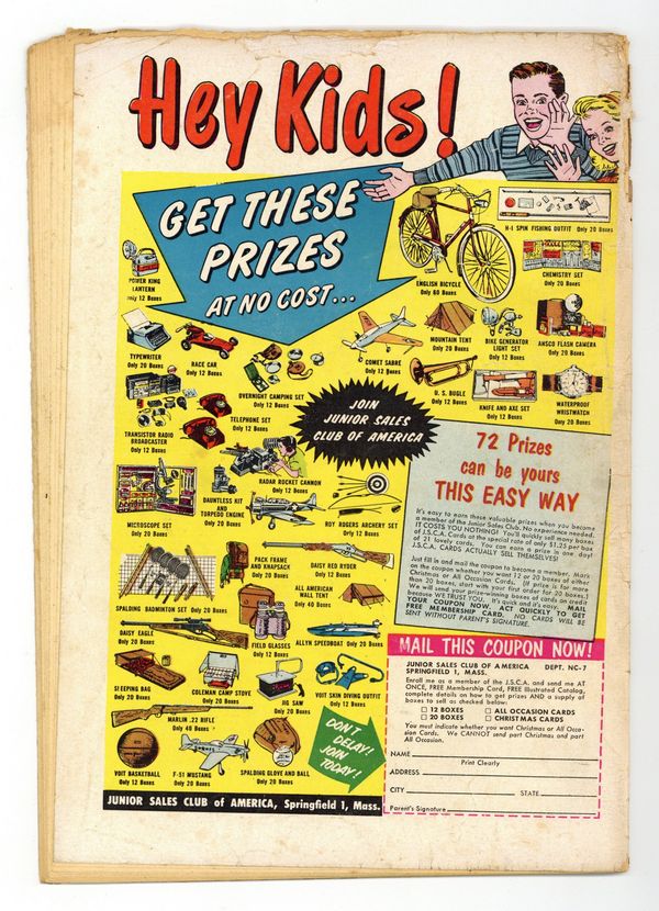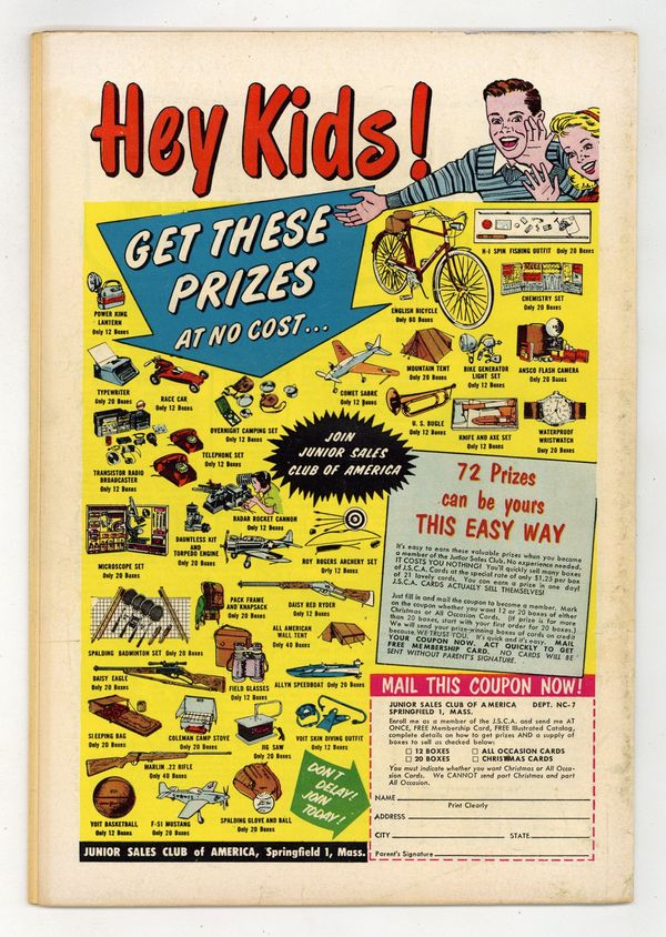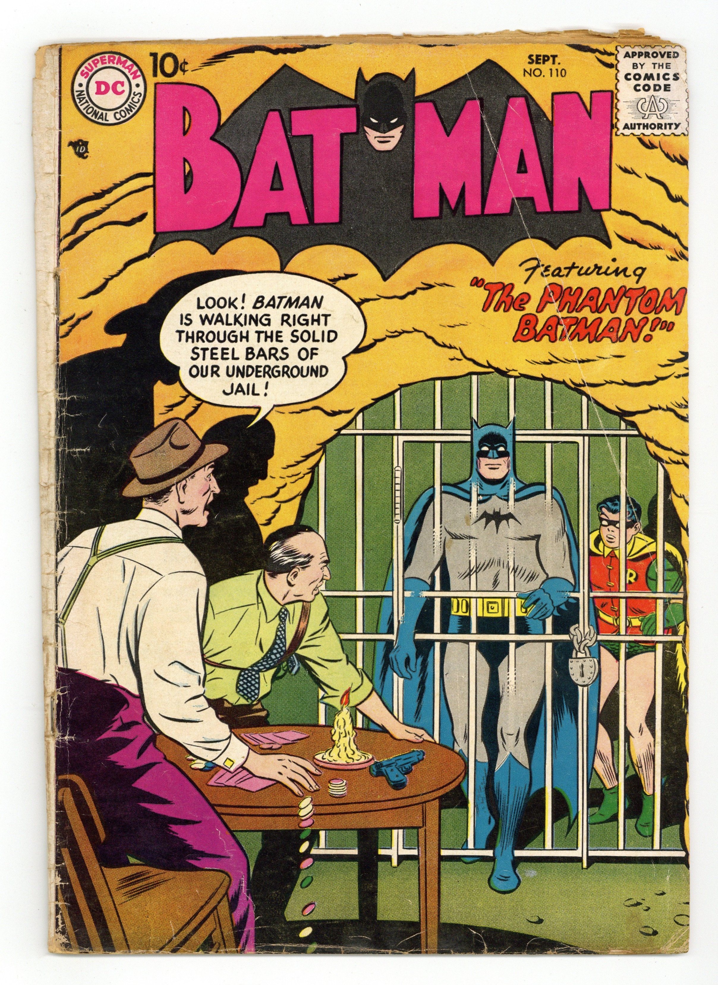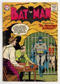 Tags: Batman$179.00Cover pencils by Curt Swan, inks by Stan Kaye. "Crime-of-the-Month Club!", script by Dave Wood, pencils by Dick Sprang, inks by Charles Paris; The attempted theft of a valuable flower ties in with a theory that the Batman has about the Joker being involved in a series of crimes, and discovers that the Crime Clown is selling plans for crimes to other criminals. Danger Prejudice at Work! public service announcement, art by Ruben Moreira. Half-page Casey the Cop story by Henry Boltinoff. "The Secret of Batman's Butler," script by Bill Finger, pencils by Sheldon Moldoff, inks by Stan Kaye; Alfred recounts how he originally got the job as butler for Bruce Wayne, how he learned Batman and Robin's true identity, how he covered their dual identities from being discovered, and how he "saved," or so he thought, Batman's identity from a man named Noyes. One-page Warden Willis by Henry Boltinoff. "Tin Badges of the Rails" text story. "The Phantom Batman," script by Edmond Hamilton, pencils by Dick Sprang, inks by Charles Paris; Batman inexplicably is affected by an explosion in an experimental electronics laboratory that reverses the atoms in his body. 36 Pages, Full Color. Cover price $0.10.