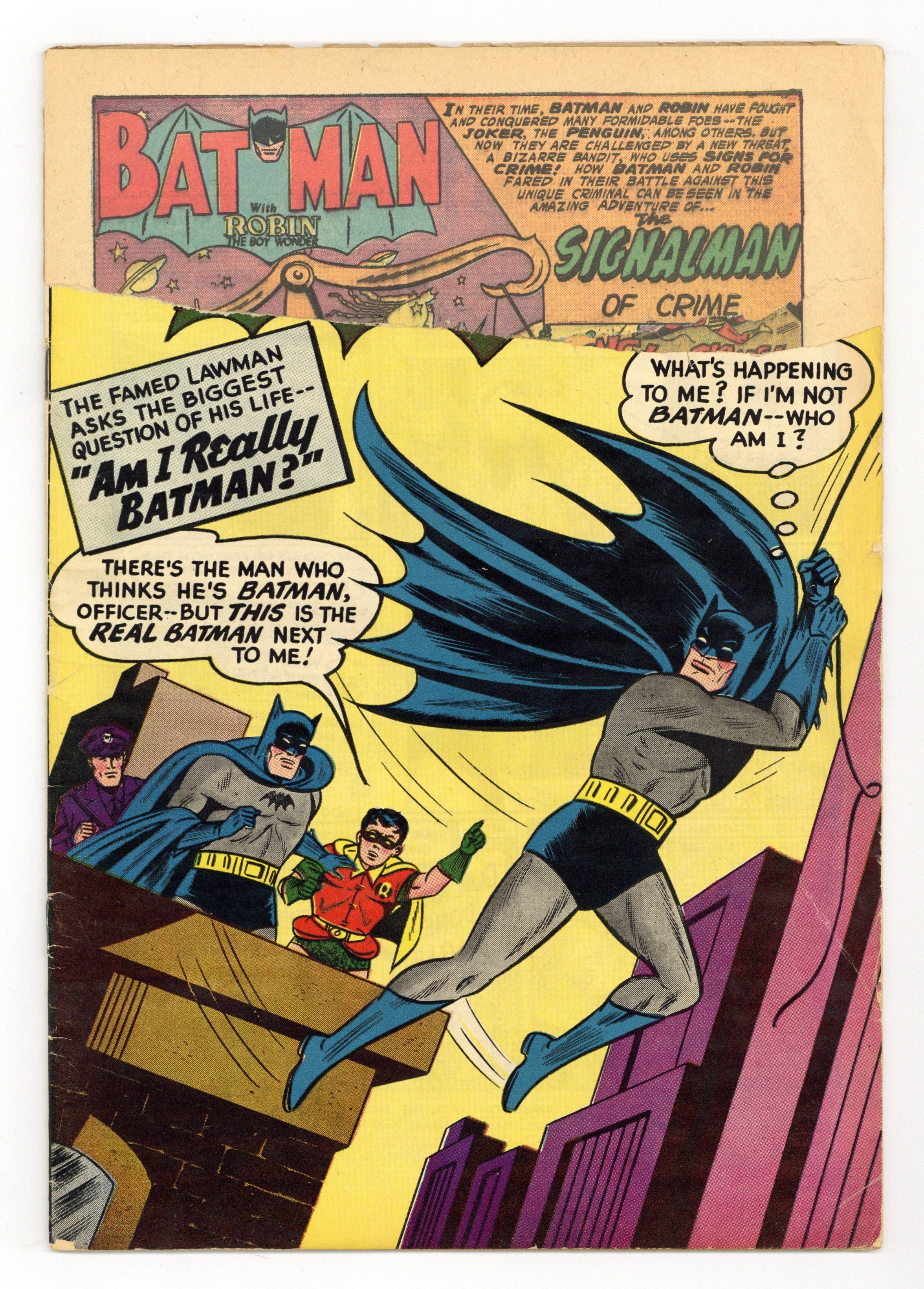 Cover by Sheldon Moldoff. The Trick Is to Treat All the World's Children! public service announcement, art by Ruben Moreira. "The Signalman of Crime," script by Bill Finger, pencils by Sheldon Moldoff, inks by Charles Paris; A small time criminal moves to Gotham and initiates a series of crimes, dressed as the bizarre Signalman; But Batman solves the clues to Signalman's crimes and nabs him. One-page Casey the Cop story by Henry Boltinoff. One-page Warden Willis story by Henry Boltinoff. "Batman's Roman Holiday!", script by Edmond Hamilton, pencils by Dick Sprang, inks by Charles Paris; Professor Nichols contacts Bruce and Dick to show them his new time ray, and asks then to send him back into the days of ancient Rome so he can experience what they do on their travels. "Trouble on the London Express" text story. "Am I Really Batman?", script by Bill Finger, pencils by Sheldon Moldoff (as Bob Kane), inks by Charles Paris; Batman wakes from a sound sleep to find himself in a mental ward, not realizing that a Professor Milo had given him a dose of amnesia gas that dulls the will to live. 36 Pages, Full Color. Cover price $0.10.