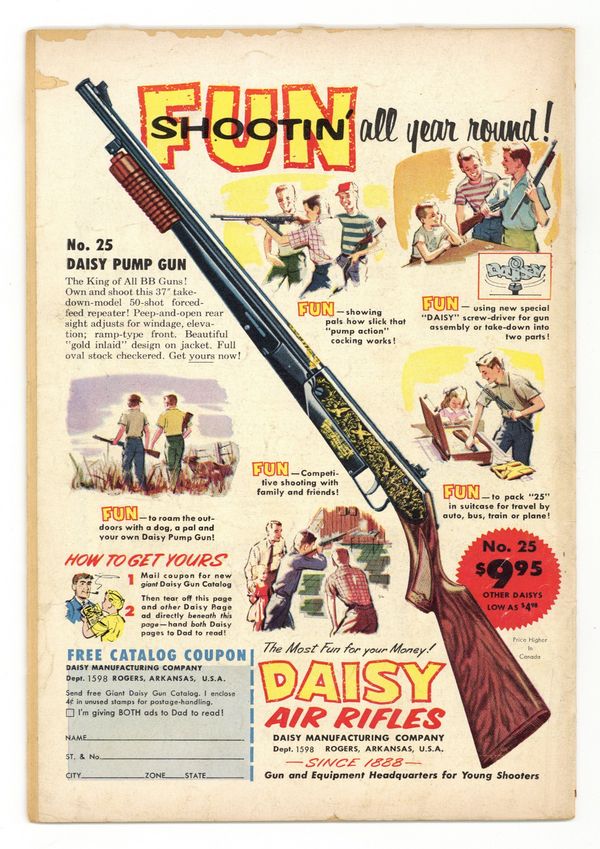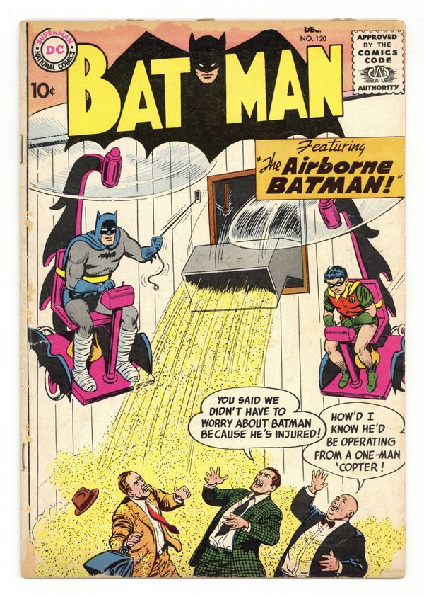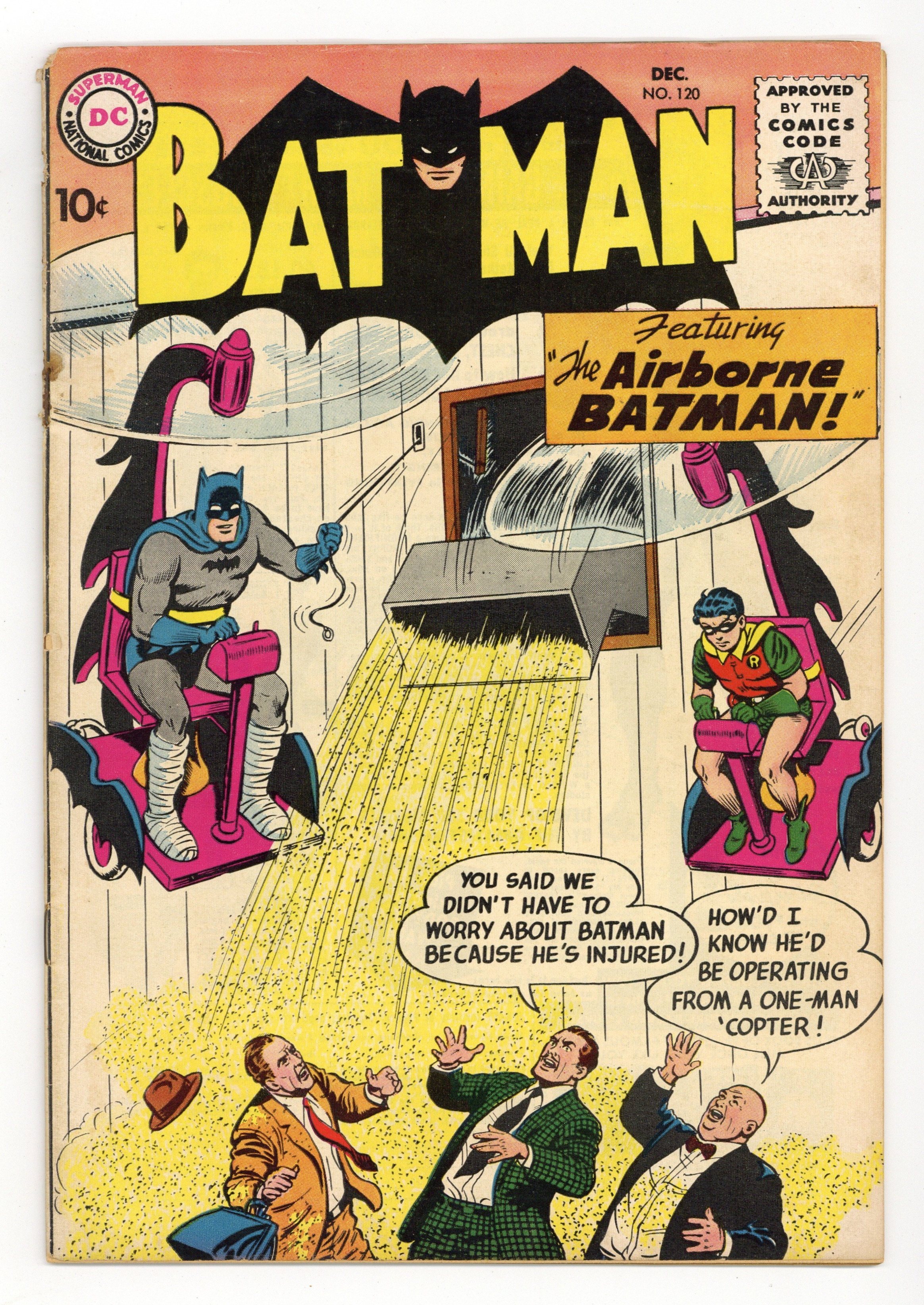 Cover pencils by Curt Swan, inks by Stan Kaye. "The Curse of the Bat-Ring," pencils by Sheldon Moldoff, inks by Charles Paris; Batman uses a clever plan involving a jinx on a Bat-Ring, which crooks get the Caped Crusader to wear, hoping it will bring him bad luck. Sharing -- The United Nations Way public service announcement, art by George Roussos. "The Failure of Bruce Wayne," script by Bill Finger, pencils by Sheldon Moldoff, inks by Charles Paris; Called to his dying Uncle's bedside, Silas, Bruce is told by him that he is disappointed that Bruce has not continued the family tradition of adventure; Bruce sets out to prove Silas wrong. One-page Warden Willis story by Henry Boltinoff. End of a Hold-Up article. "The Airborne Batman," pencils by Sheldon Moldoff, inks by Charles Paris; While stopping a stampeding elephant, Batman injures his legs, giving the green light to crooks all over Gotham City to institute a reign of terror. 36 Pages, Full Color. Cover price $0.10.