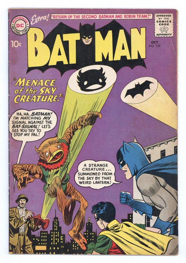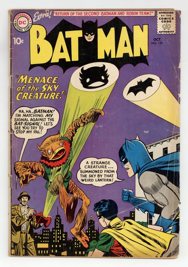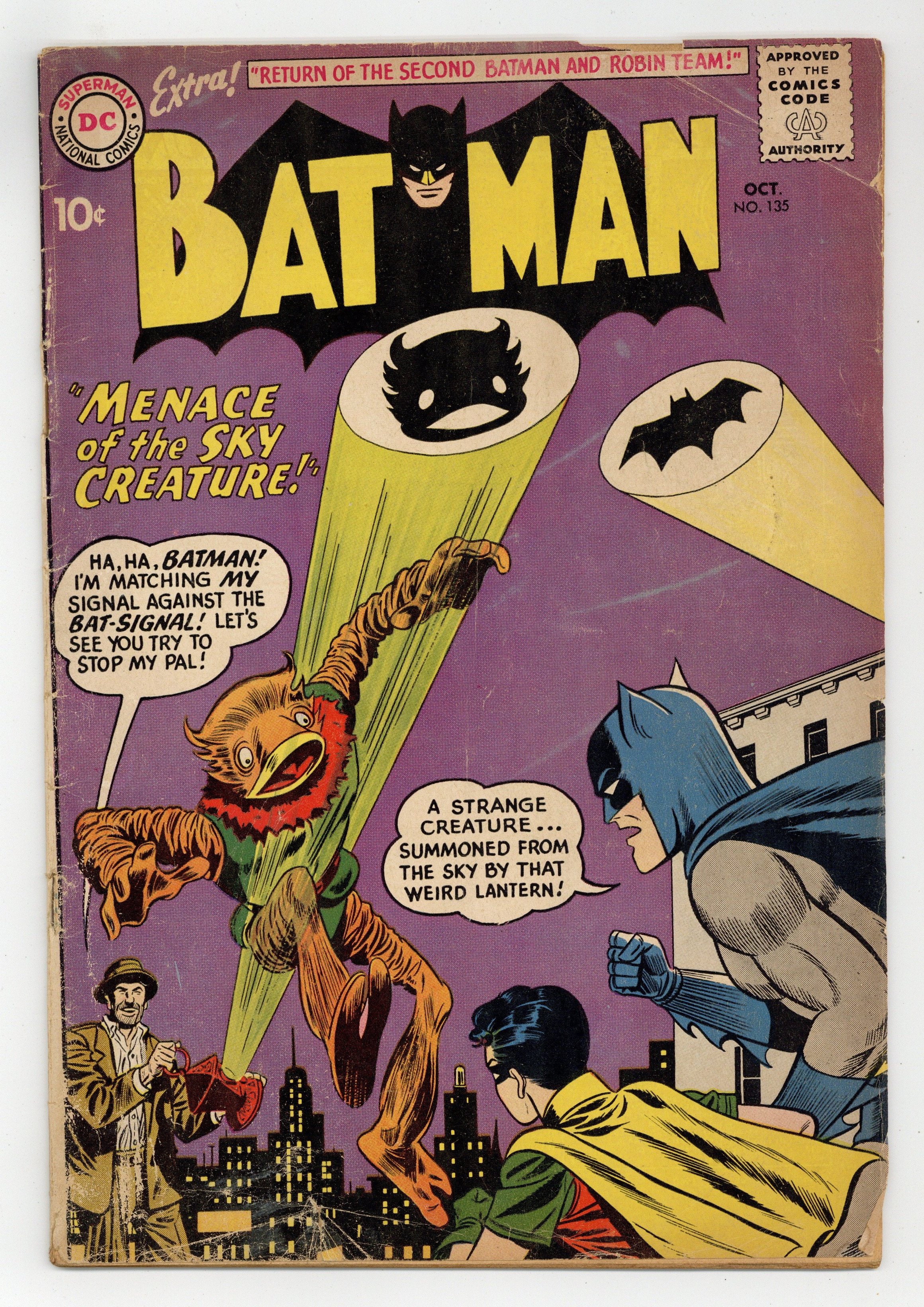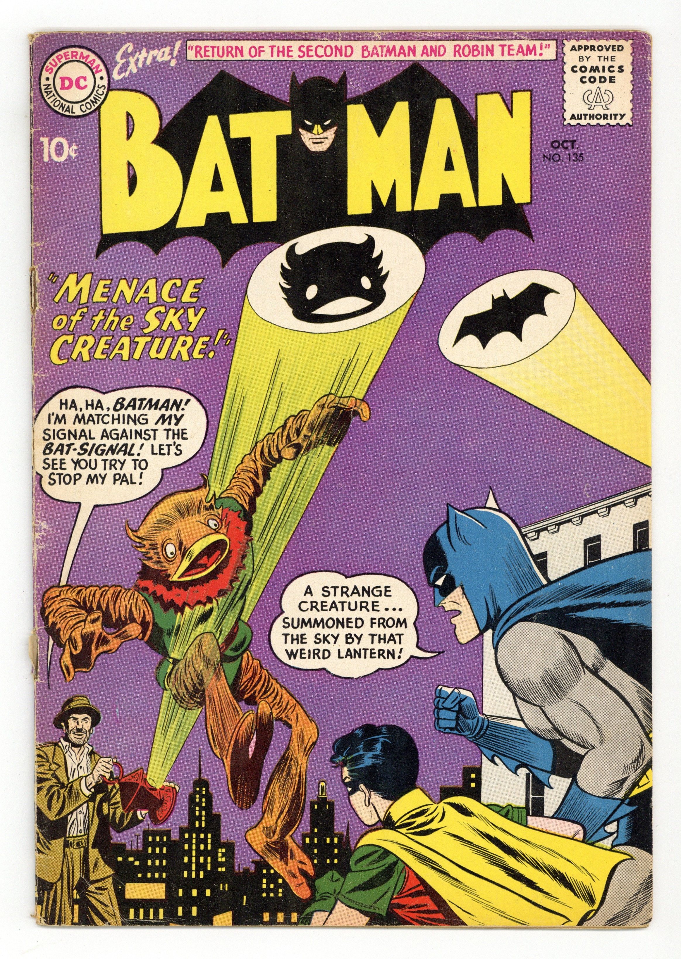 Cover pencils by Dick Dillin and Sheldon Moldoff, inks by Sheldon Moldoff. "Crimes of the Wheel," script by Bill Finger, pencils by Sheldon Moldoff, inks by Charles Paris; The Dynamic Duo break up a gambling ring headed by "Wheels" Foster, but he manages to escape and threatens to kill the Caped Crusaders with a giant roulette wheel and its giant steel ball. How Are Your Shopping Manners? public service announcement, art by Bernard Baily. "The Return of the Second Batman and Robin Team," script by Bill Finger, art by Sheldon Moldoff; Batman's old foe, John Crandall, is released from jail and vows to destroy anything that is a monument to the Caped Crusader, and begins by captured the new Batman and Robin team. "The Menace of the Sky Creature," script by Bill Finger, pencils by Sheldon Moldoff, inks by Charles Paris; Two crooks come into possession of a sorcerer's lantern that can summon a mysterious sky creature and they use that being to battle the Caped Crusaders. One-page Warden Willis story by Henry Boltinoff. Full-page ad for Justice League of America # 1. 36 Pages, Full Color. Cover price $0.10.