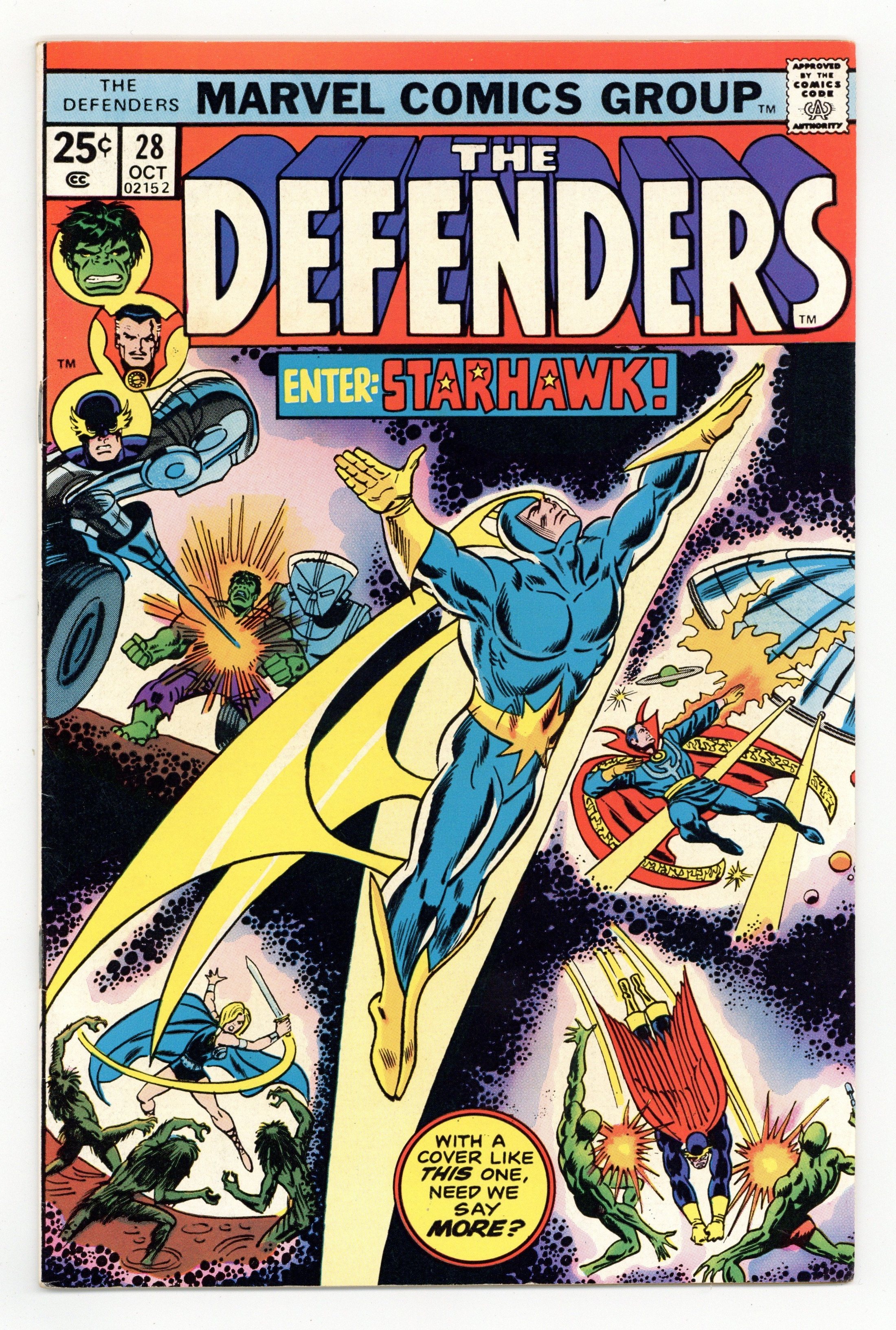 $21.50Cover pencils by Ron Wilson, inks by Frank Giacoia. First full appearance of Starhawk in My Mother, The Badoon!, script by Steve Gerber, pencils by Sal Buscema (layouts/breakdowns), Frank Giacoia (Finished Art), and John Tartaglione [as John Tartag] (Finished Art), inks by Frank Giacoia and John Tartaglione [as John Tartag]; Nighthawk, Charlie-27 and Martinex are captured by the Badoon; Starhawk helps Vance Astro and Valkyrie return to Earth; Hulk and Yondu are forced to enter the Super-Death Sweepstakes. 36 pgs. $0.25. Cover price $0.25.