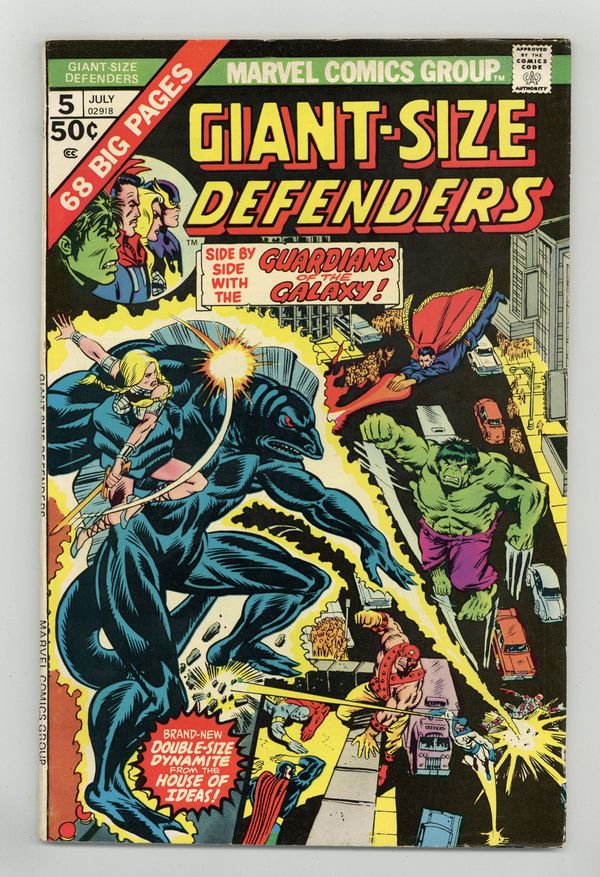 "Eelar Moves in Mysterious Ways!" Guest-starring the Guardians of the Galaxy. Plot by Chris Claremont, Gerry Conway, Scott Edelman, Steve Gerber, Roger Slifer, and Len Wein. Script by Steve Gerber. Pencils by Don Heck. Inks by Jim Mooney, Mike Esposito, and Dave Hunt. Cover by Ron Wilson and Al Milgrom. Somewhere in the middle of New York Harbor, the Master of the Mystic Arts senses a disturbance in the Earth's time-stream! Valkyrie and the Hulk join Dr. Strange's search and discover a bizarre creature called Eelar! However, the slick human-sized eel slips past the Defenders and attacks the Hudson Tunnel! Meanwhile in Upstate New York, Nighthawk investigates the mysterious crash of a spaceship! A spaceship that belongs to the Guardians of the Galaxy Why have the 31st century guardians come to the 20th century? When Vance Astro, Martinex, and Yondu emerge from their ship, Nighthawk presses them for an answer! But speaking of answers, the Defenders are still looking for one against Eelar…now tearing up Times Square! The slippery eel holds off the Green Goliath and the fourth guardian Charlie-27! However, eventually the 20th century and 31st century super-heroes catch-up with Eelar! Will the Badoon-spawned beast finally go down to defeat? Cameo appearance by the adolescent Vance Astro. Flashback cameos by Trish Starr and the Squadron Sinister. Defenders Lineup: Doctor Strange, Hulk, Nighthawk, and Valkyrie. First reprint story: "Quoth the Nighthawk, Nevermore!" Script by Roy Thomas. Art by Gene Colan and Syd Shores. A new costumed vigilante, Nighthawk (aka Kyle Richmond), challenges the Man Without Fear! Flashback cameos by Captain America and the Grandmaster. Story originally published in Daredevil (1st series) 62. Notes: The Guardians of the Galaxy previously appeared in Marvel Two-in-One 5. This issue is their 3rd appearance. They appear next in Defenders 26. This issue includes a full-page ad for Hostess Twinkies featuring Captain Marvel vs. Nitro. First appearance of Justice (young Vance Astrovik) Cover price $0.50.