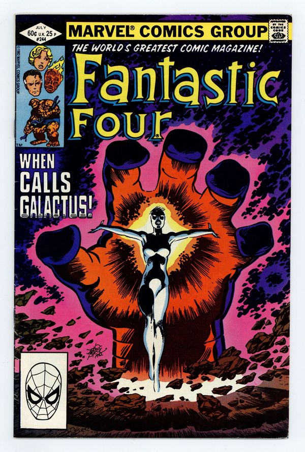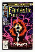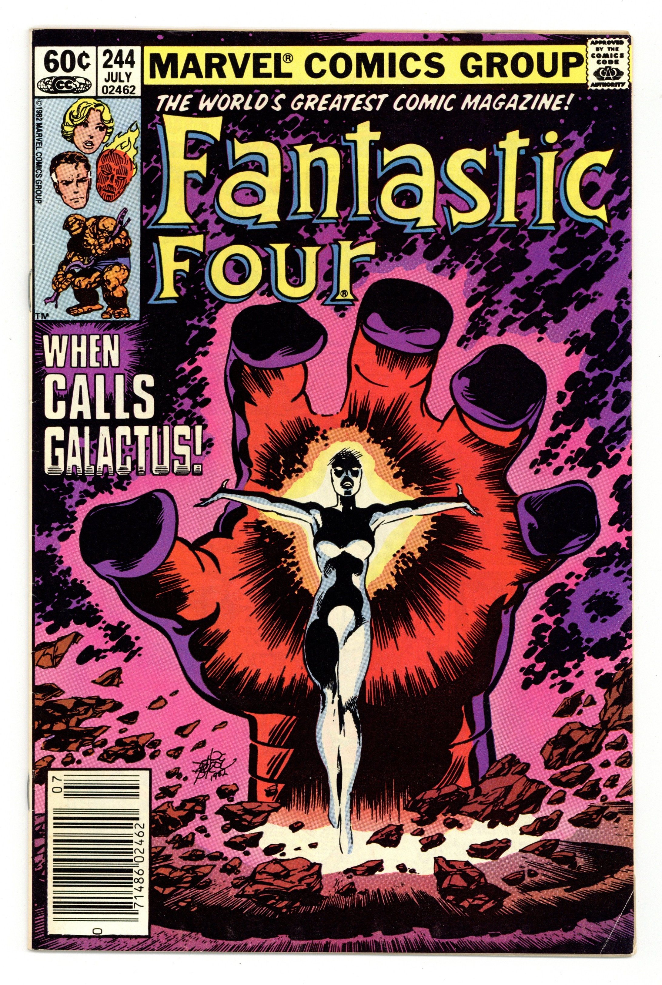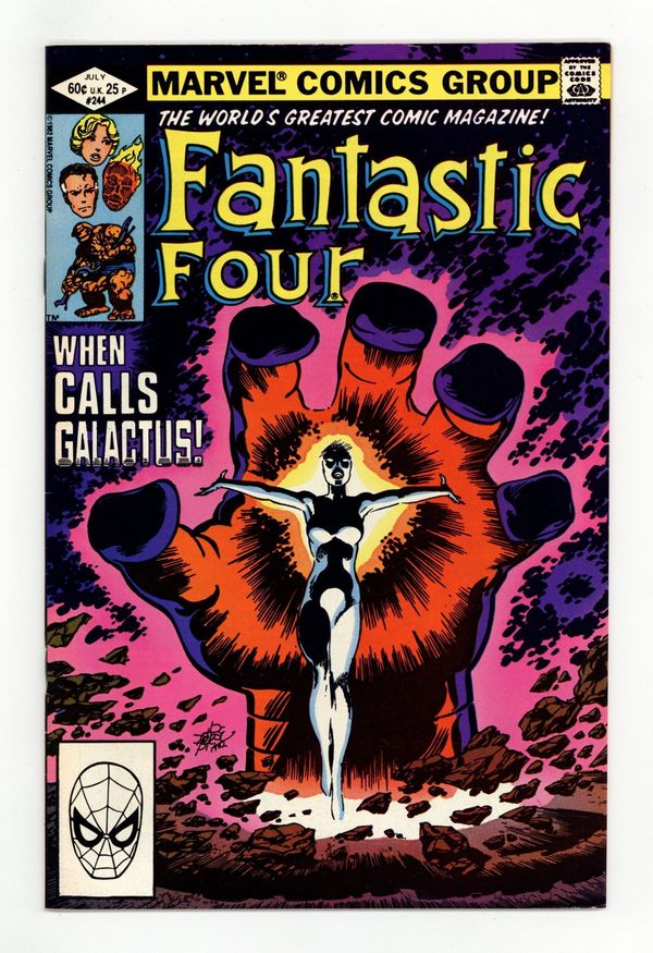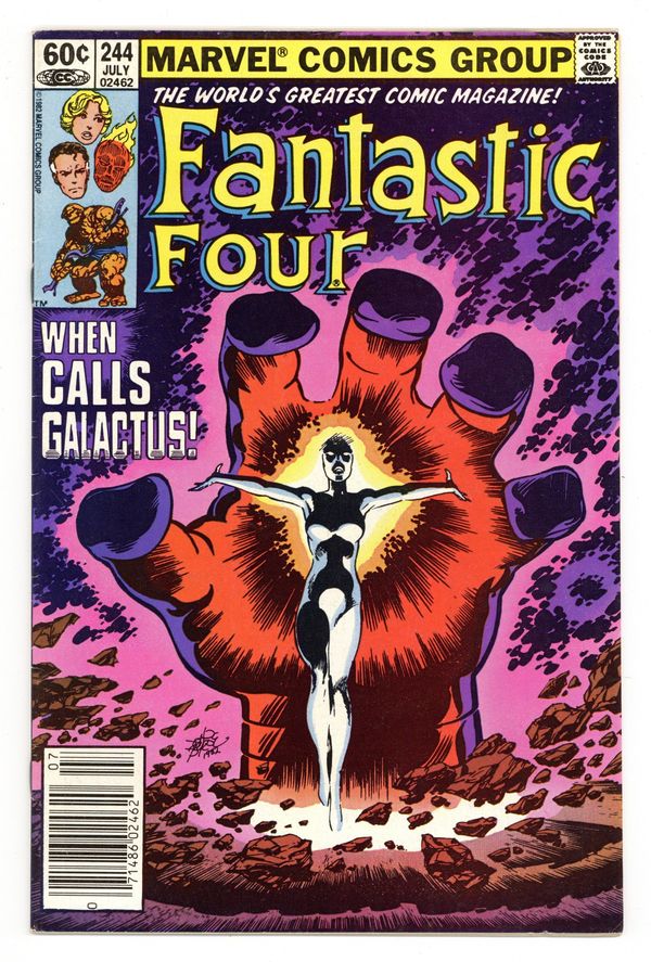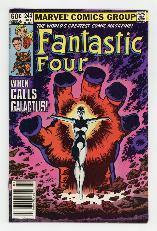Starts Jan 26 Direct Edition. "Beginnings and Endings" Part 3 of 3. Script and Art by John Byrne. Cover by John Byrne. After an unprecedented victory over Galactus, the Avengers and the Fantastic Four face a major ethical decision: should they try to save the Ravager of Worlds or let him perish as his energies dwindle? Reed decides on the former and constructs a giant machine to revitalize Galactus! However, the Devourer of Worlds needs one more thing to complete his recovery...a new herald! In a stunning move, Frankie Raye volunteers! So where does that leave the Human Torch? First appearance of Nova (aka Frankie Raye). Cameo appearances by Captain America, Iron Man, Thor, Wasp, and Doctor Strange. (Notes: This trilogy was reprinted in 1989 in the trade paperback titled "Fantastic Four: Trial of Galactus." Reed's decision to save Galactus will come back to haunt the FF beginning in Fantastic Four 257.) 36 pages Cover price $0.60.