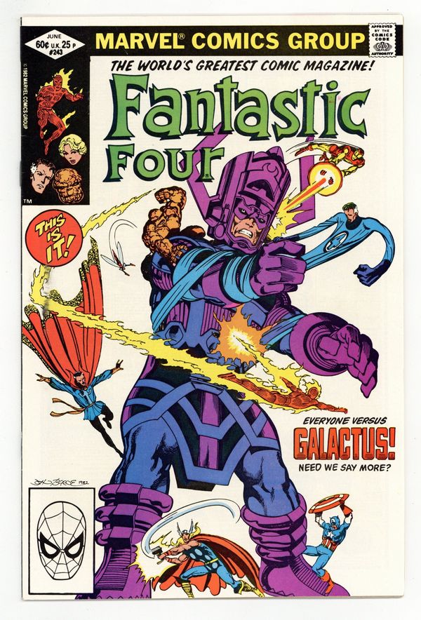 Direct Edition. "Shall Earth Endure?" Part 2 of 3. Script and Art by John Byrne. Cover by John Byrne. Guest-starring the Avengers and Doctor Strange. The situation has come down to this...the Fantastic Four, the thunder god, the golden avenger, the star-spangled avenger, the winsome Wasp, and the Master of the Mystic Arts vs. Galactus, the Devourer of Worlds...for the life of the Earth! Everything is on the line as the blockbuster battle rages on top of the World Trade Center! Will the 'Ravager of Worlds' finally add the Earth to his list of conquests, or can the greatest heroes on the planet do the impossible: defeat Galactus? Cameo appearances by Daredevil and Spider-Man. 36 pgs. Cover price $0.60.