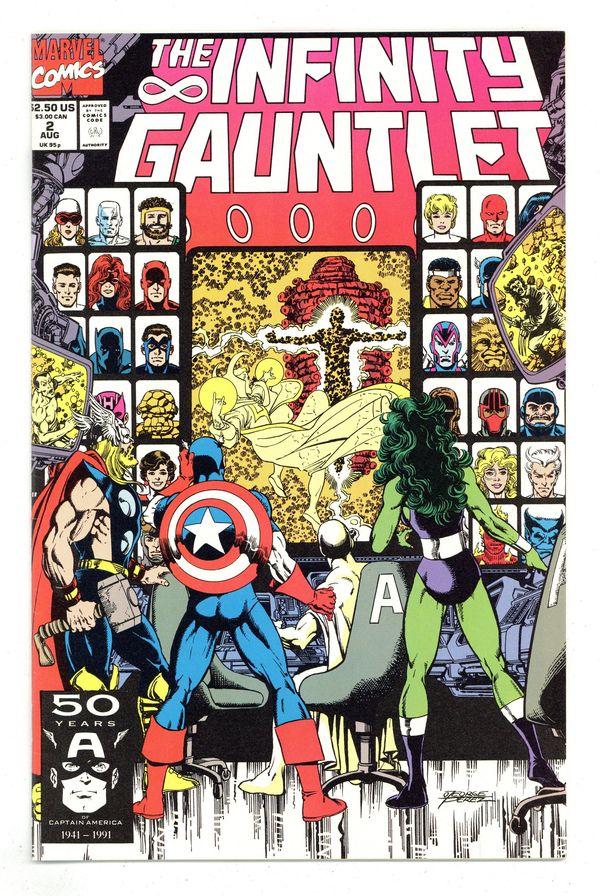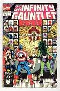 Tags: Infinity Gauntlet (part 2)$21.00Direct Edition. Part 2 of 6. "From Bad to Worse!" Story by Jim Starlin. Art by George Perez and Joe Rubinstein. Wielding nigh-omnipotent power, the mad Titan, Thanos, eradicated half the population in the universe with but a snap of his fingers. Now, the surviving heroes of Earth are left to deal with the chaos that has ensued in the wake of such a catastrophe. Meanwhile, Odin the Lord of Asgard, calls a meeting of the Sky-Fathers (Zeus, Osiris, Manitou, and others) to discuss this disturbance in the universal order of things. Plus, the man who once brought an end to the Mad Titan returns from the grave to lend a hand. But can even the heroes trust the intentions of Adam Warlock? 48 pages. Cover price $2.50.