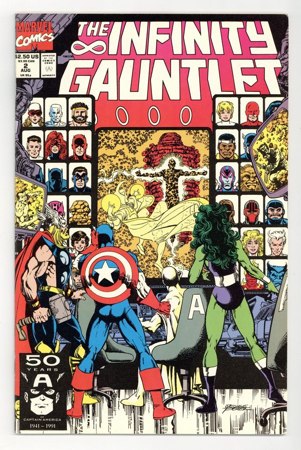 Tags: Infinity Gauntlet (part 2)$9.00Direct Edition. Part 2 of 6. "From Bad to Worse!" Story by Jim Starlin. Art by George Perez and Joe Rubinstein. Wielding nigh-omnipotent power, the mad Titan, Thanos, eradicated half the population in the universe with but a snap of his fingers. Now, the surviving heroes of Earth are left to deal with the chaos that has ensued in the wake of such a catastrophe. Meanwhile, Odin the Lord of Asgard, calls a meeting of the Sky-Fathers (Zeus, Osiris, Manitou, and others) to discuss this disturbance in the universal order of things. Plus, the man who once brought an end to the Mad Titan returns from the grave to lend a hand. But can even the heroes trust the intentions of Adam Warlock? 48 pages. Cover price $2.50.