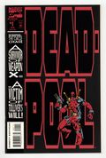 $16.00Direct Edition. The Circle Chase Round 1: Ducks in a Row - Written by Fabian Nicieza. Art and Cover by Joe Madureira and Mark Farmer. Sporting an outrageous cover -- an embossed figure of Deadpool is positioned leaning against a full cover sized embossed logo. This series pits Deadpool against Juggernaut, Black Tom Cassidy, Nyko and a wicked new villain, Slayback! 32 pages, full color. Cover price $2.50.