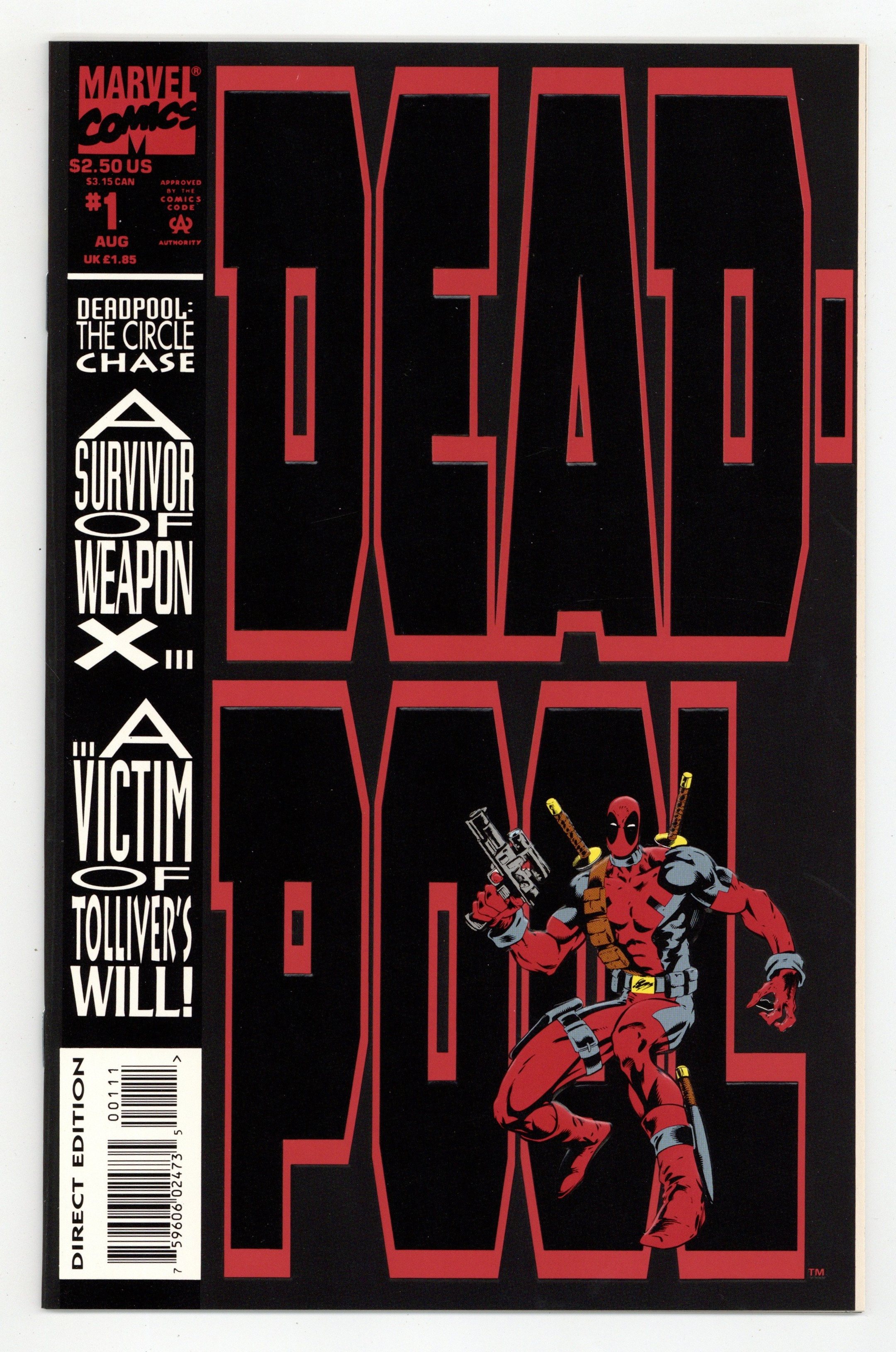 Direct Edition. The Circle Chase Round 1: Ducks in a Row - Written by Fabian Nicieza. Art and Cover by Joe Madureira and Mark Farmer. Sporting an outrageous cover -- an embossed figure of Deadpool is positioned leaning against a full cover sized embossed logo. This series pits Deadpool against Juggernaut, Black Tom Cassidy, Nyko and a wicked new villain, Slayback! 32 pages, full color. Cover price $2.50.